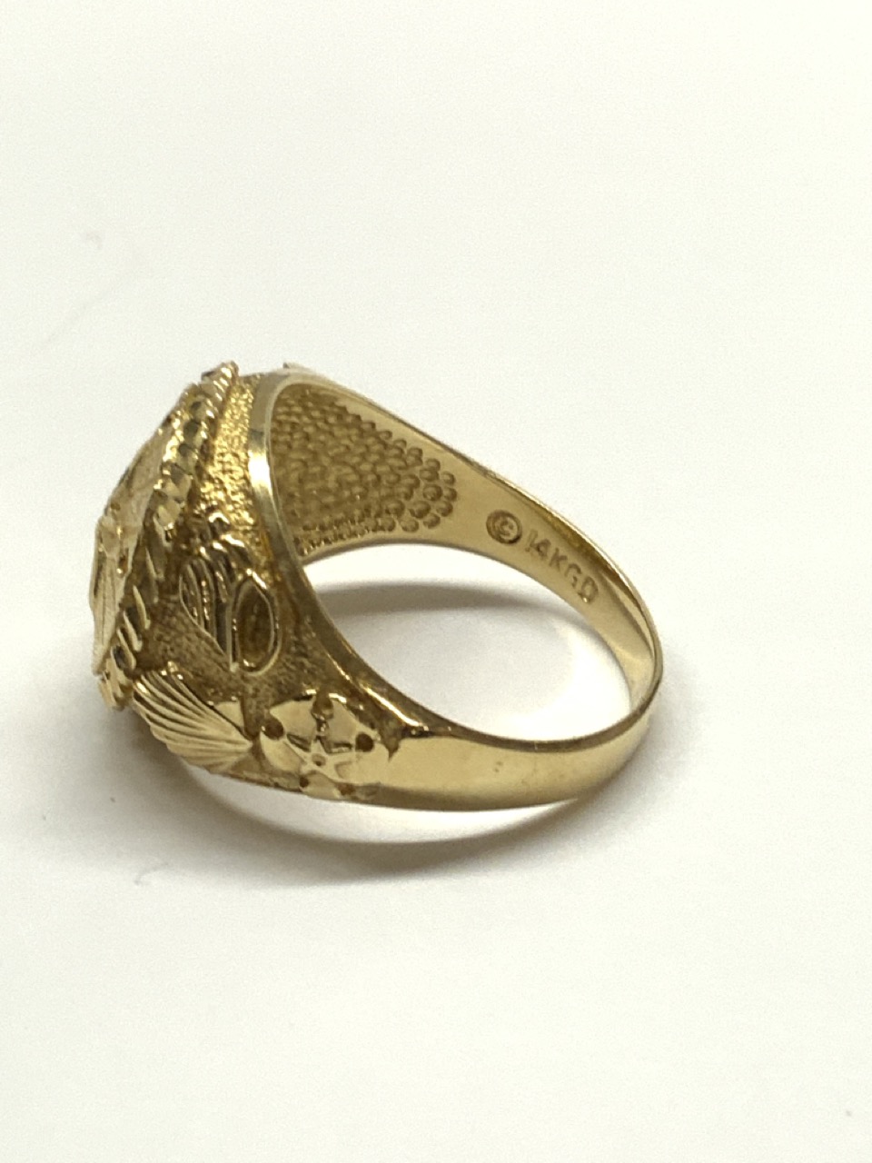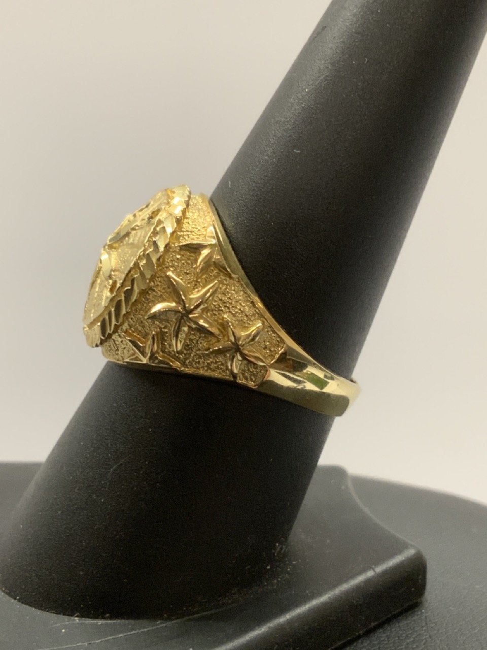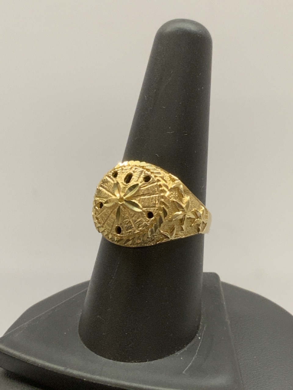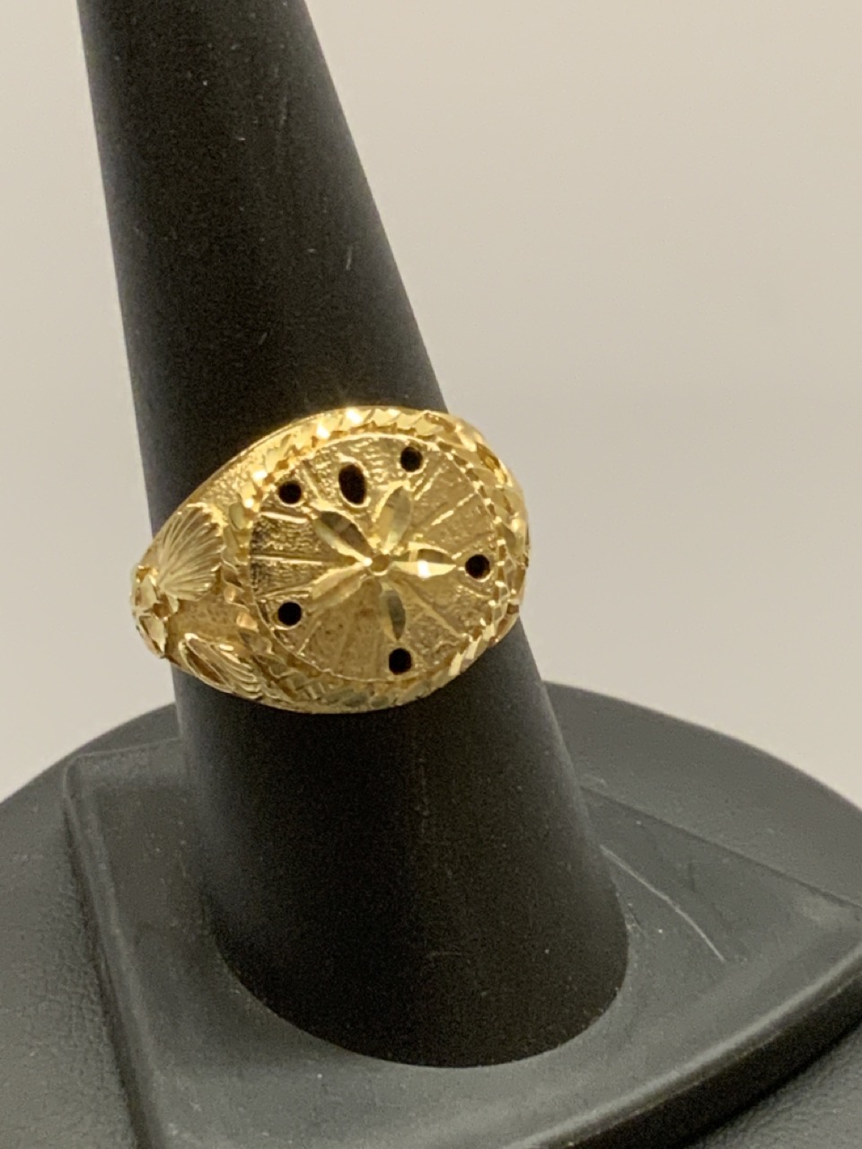 A 14K yellow gold ring with sand dollar and star fish.