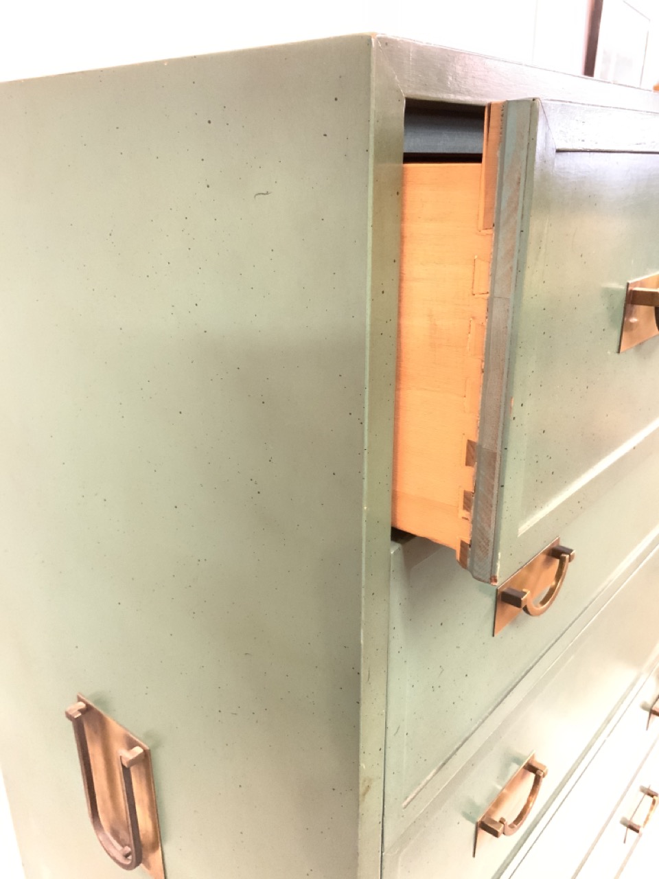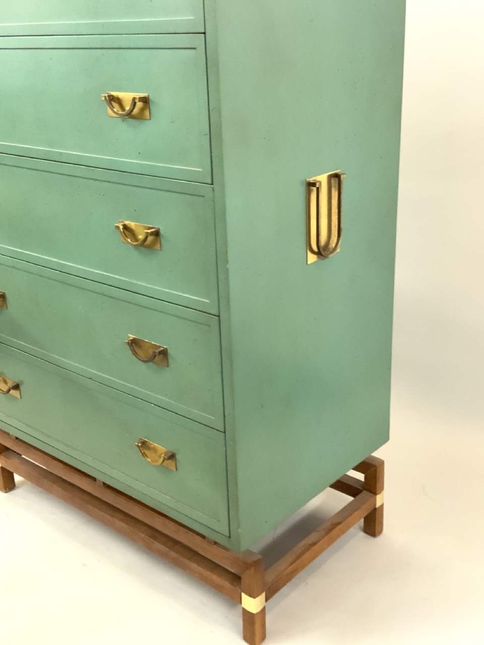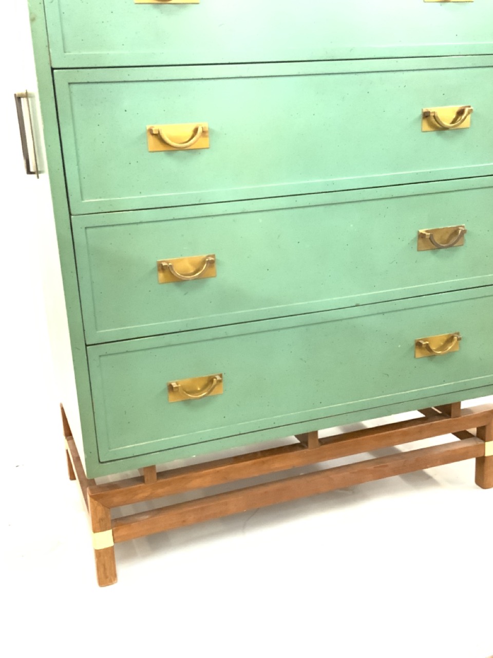 A Mid-Century Modern design Asian influenced green painted chest with fixed base and metal brass/bronze finish handles.