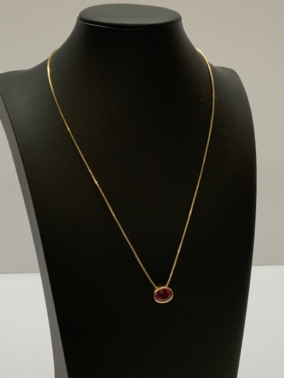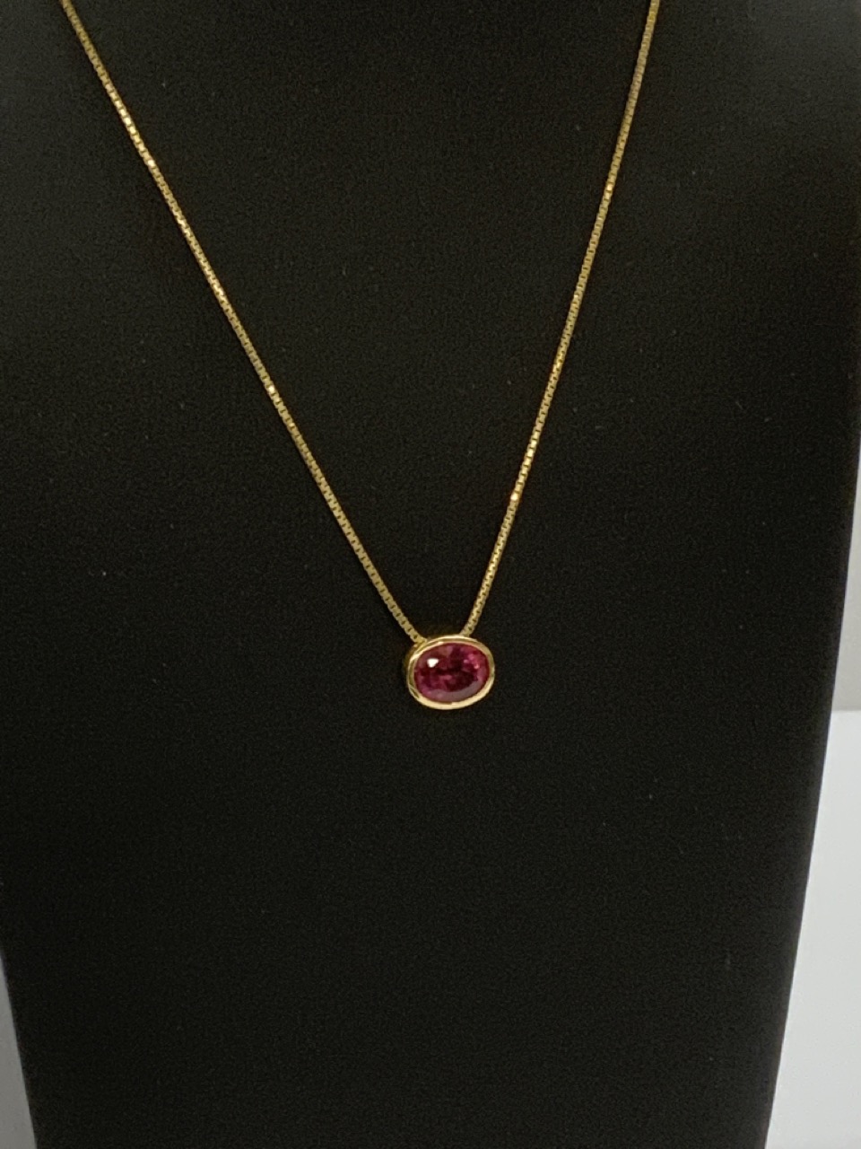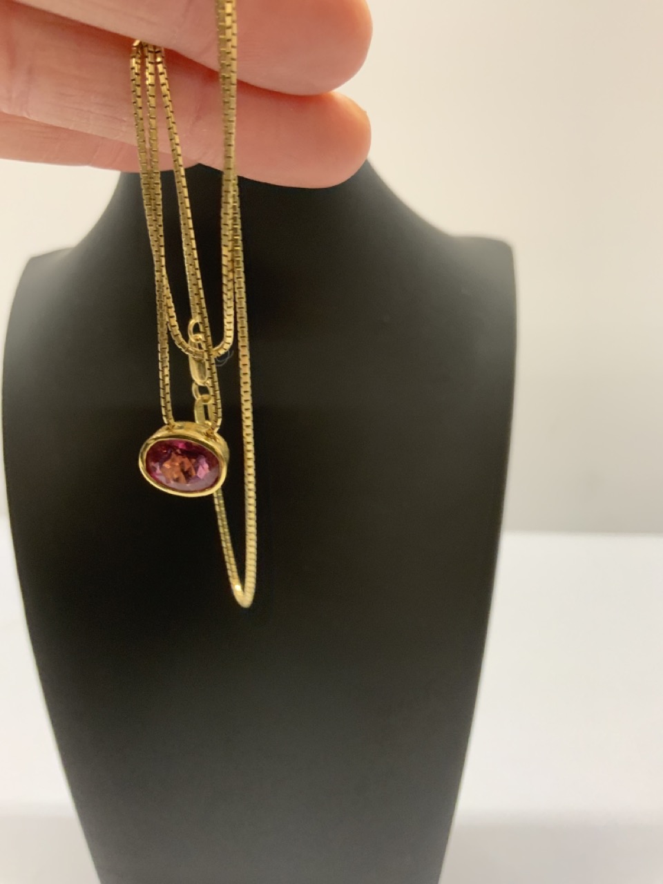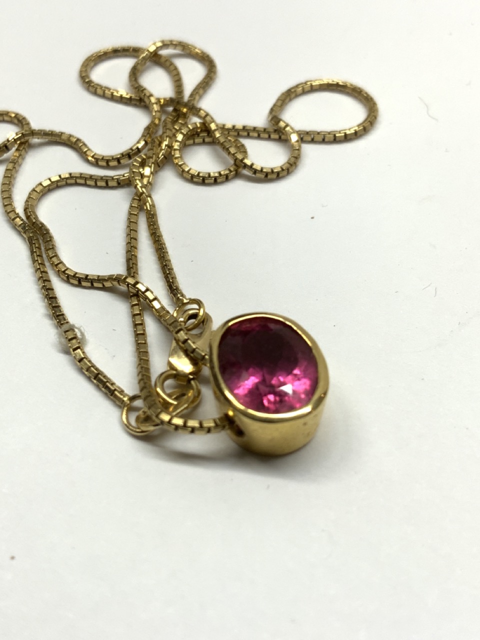 A vintage estate 14k yellow gold necklace with pink tourmaline stone. 18” length and 1/4” X 1/2” pendant.