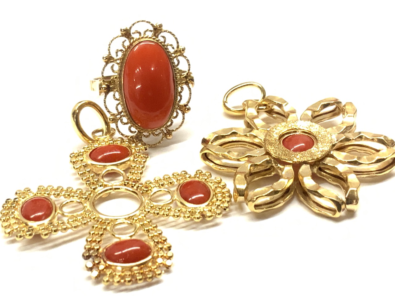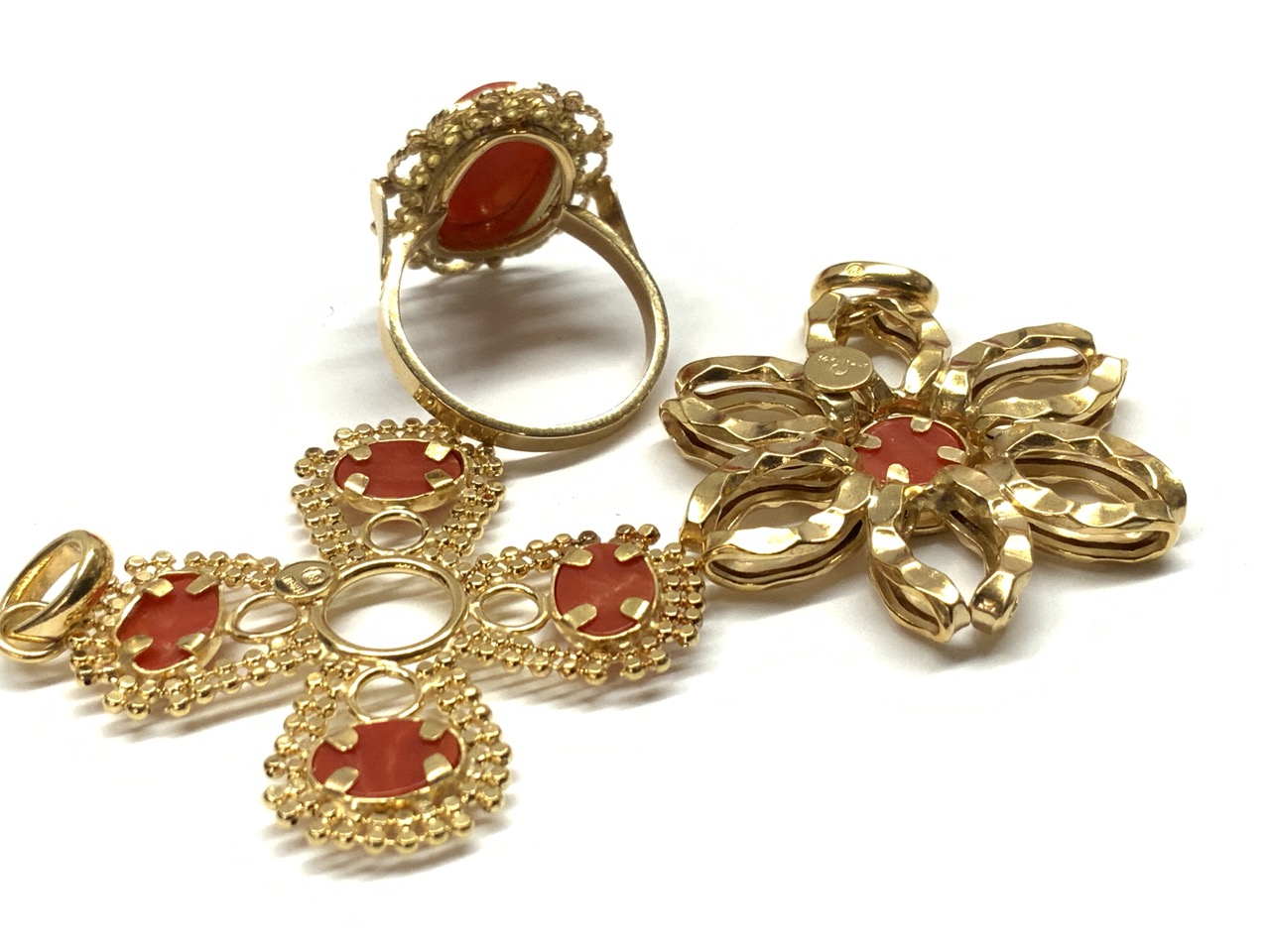 Three (3) pieces of jewelry from Napoli. 14k yellow gold pendants and one ring