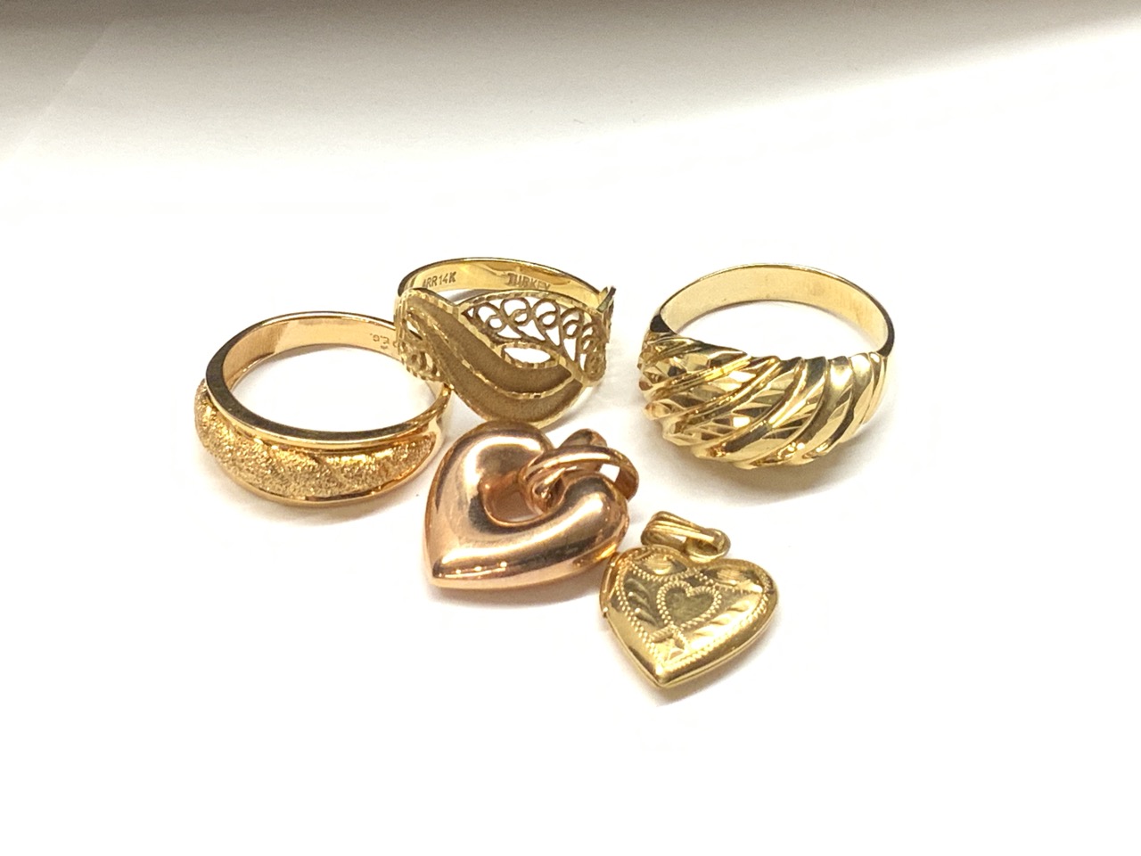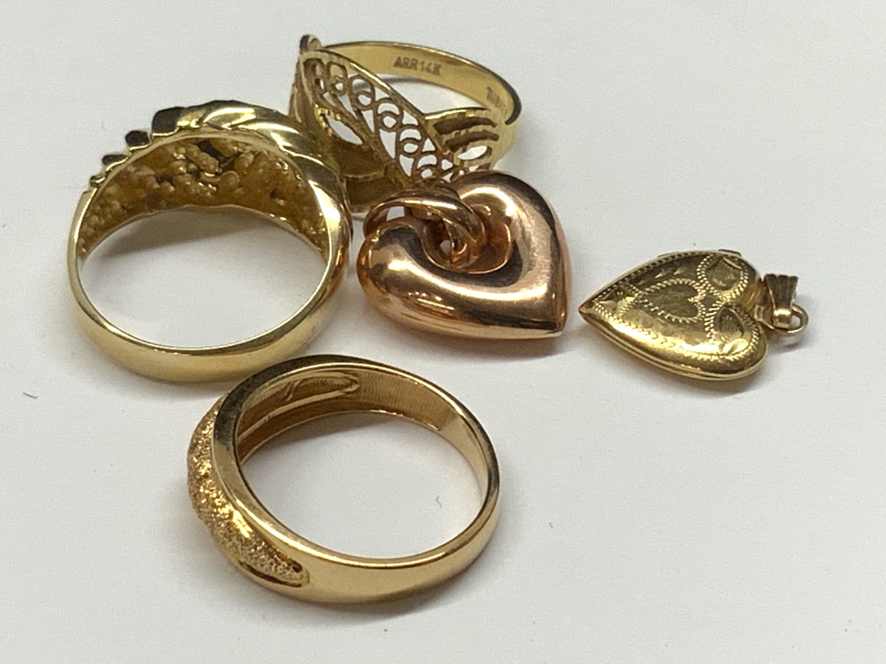 All 14k yellow gold jewelry group. Three rings, heart locket and Milor puffy heart pendant.