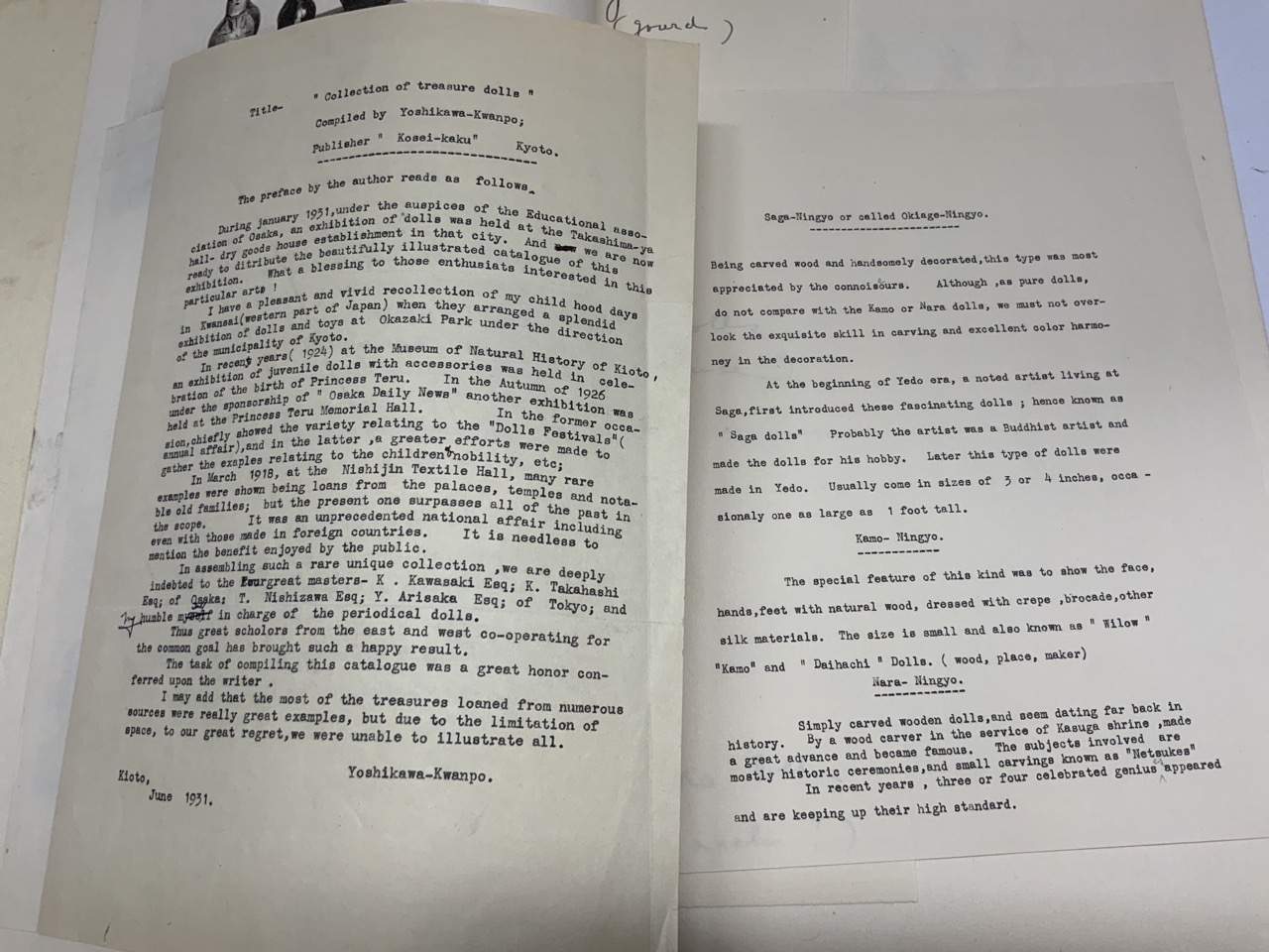 A rare collection of photograph and color plates from the exhibit in Osaka in 1931. The exhibition was held at the Takeshima-ya. Rare palace dolls examples donated from palaces, temples and notable old families for the exhibit. A very rare reference.
