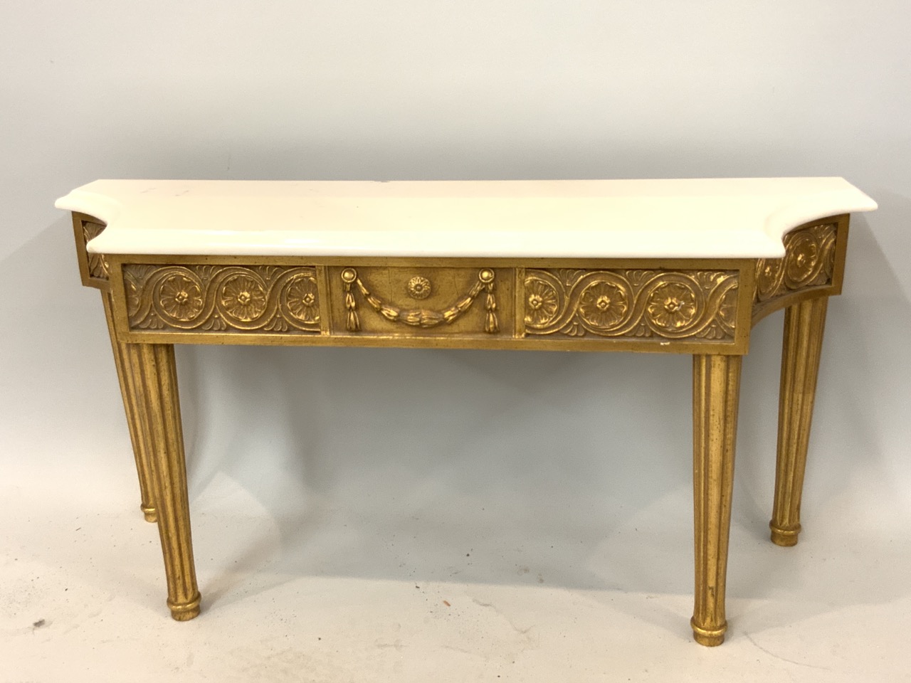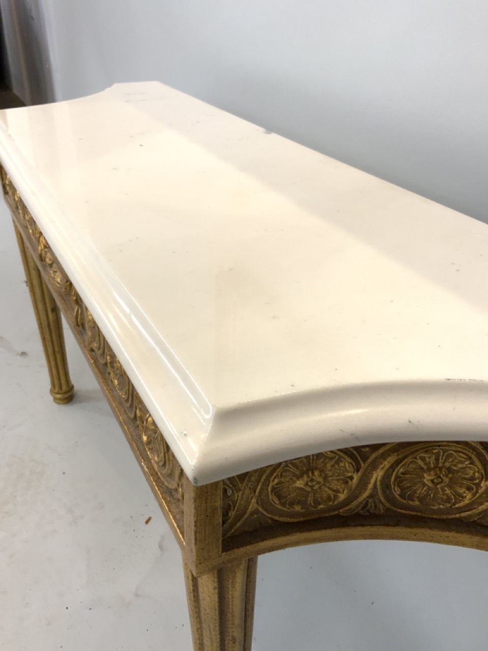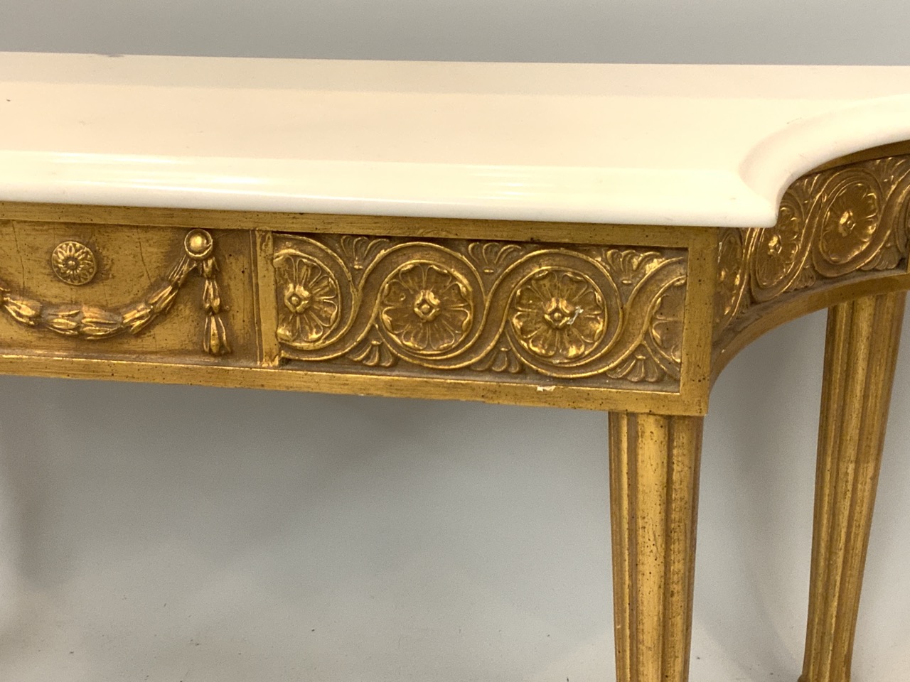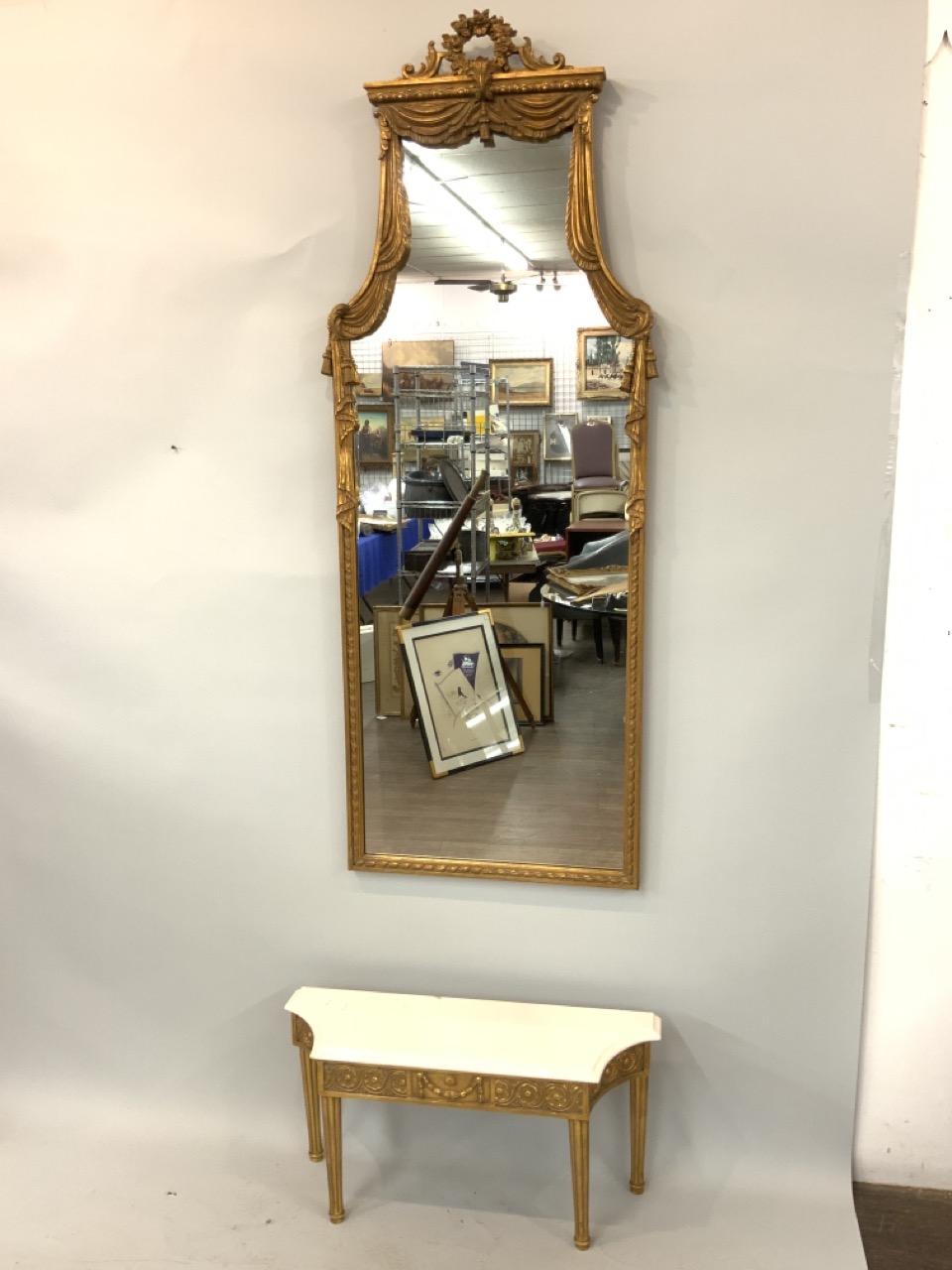 A giltwood entry way foyer pier mirror with matching marble top console low table. Hollywood Regency.