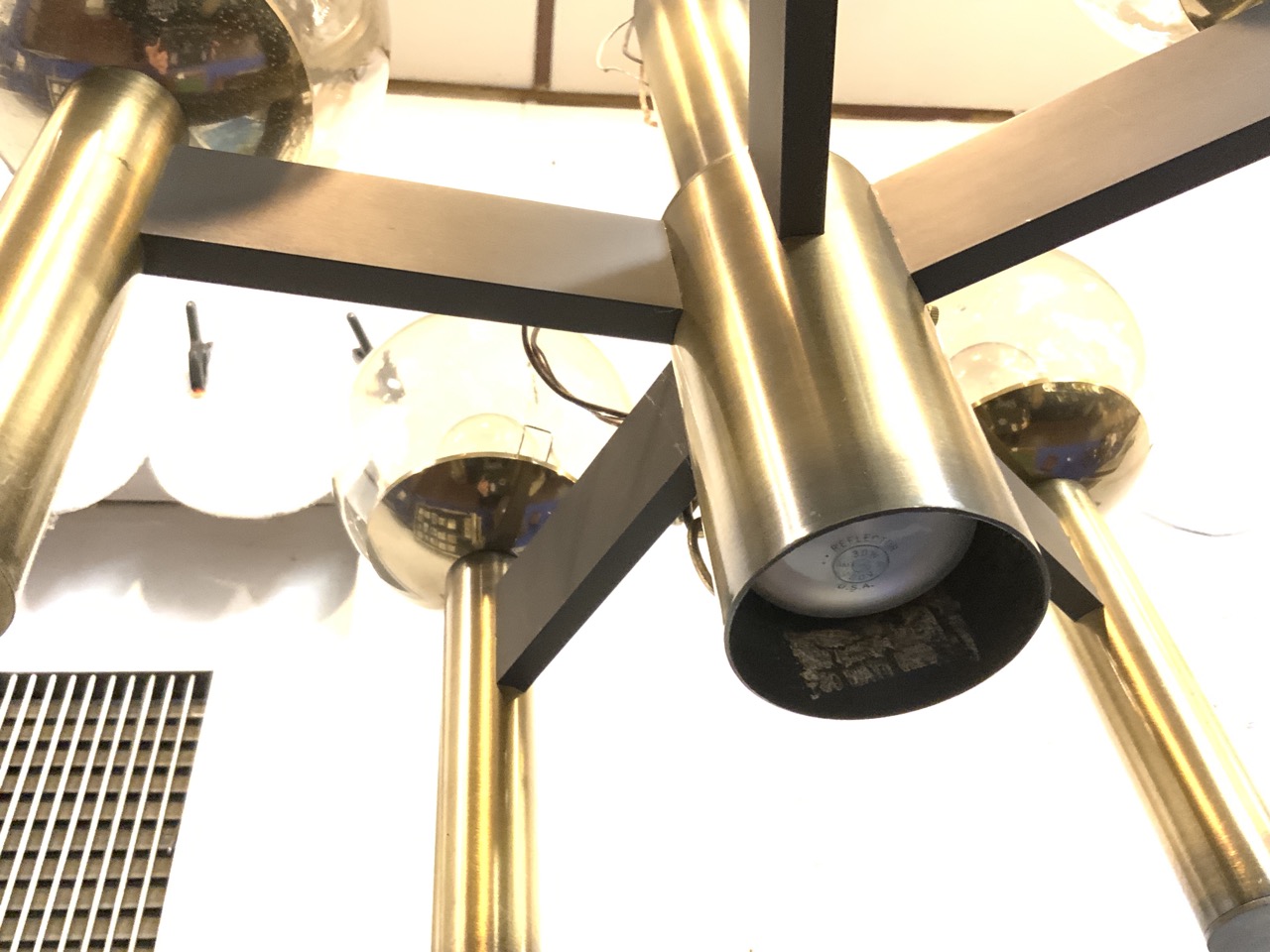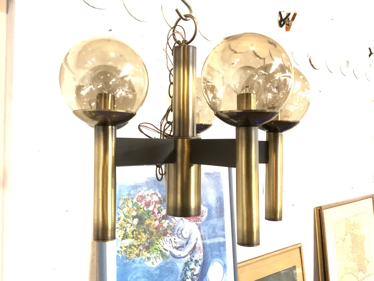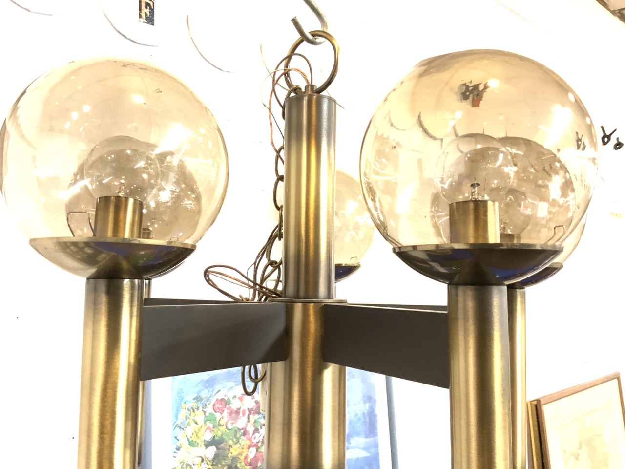 A late 70’s brass chandelier with Smokey topaz glass color globes.