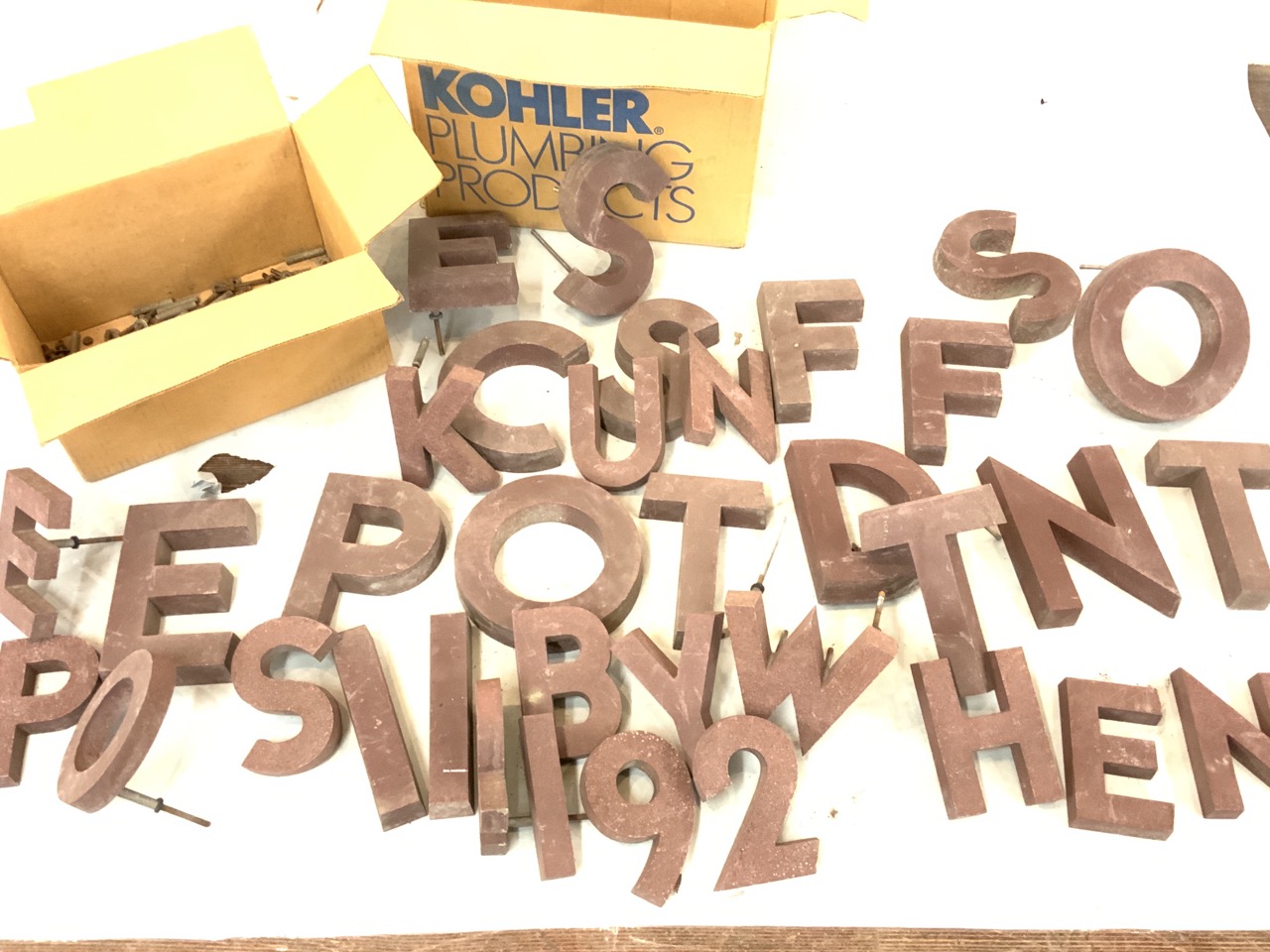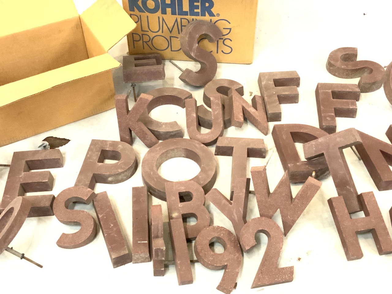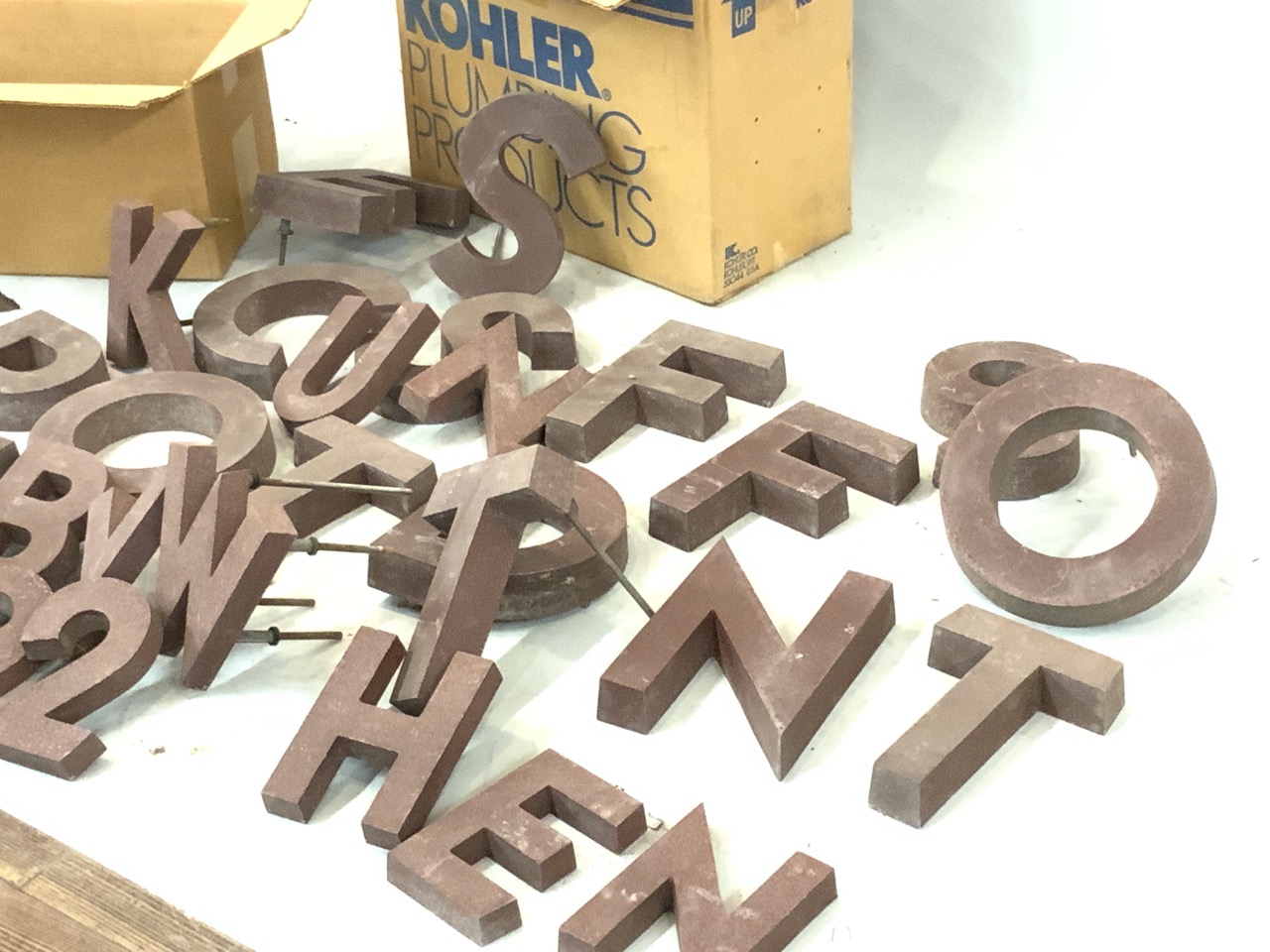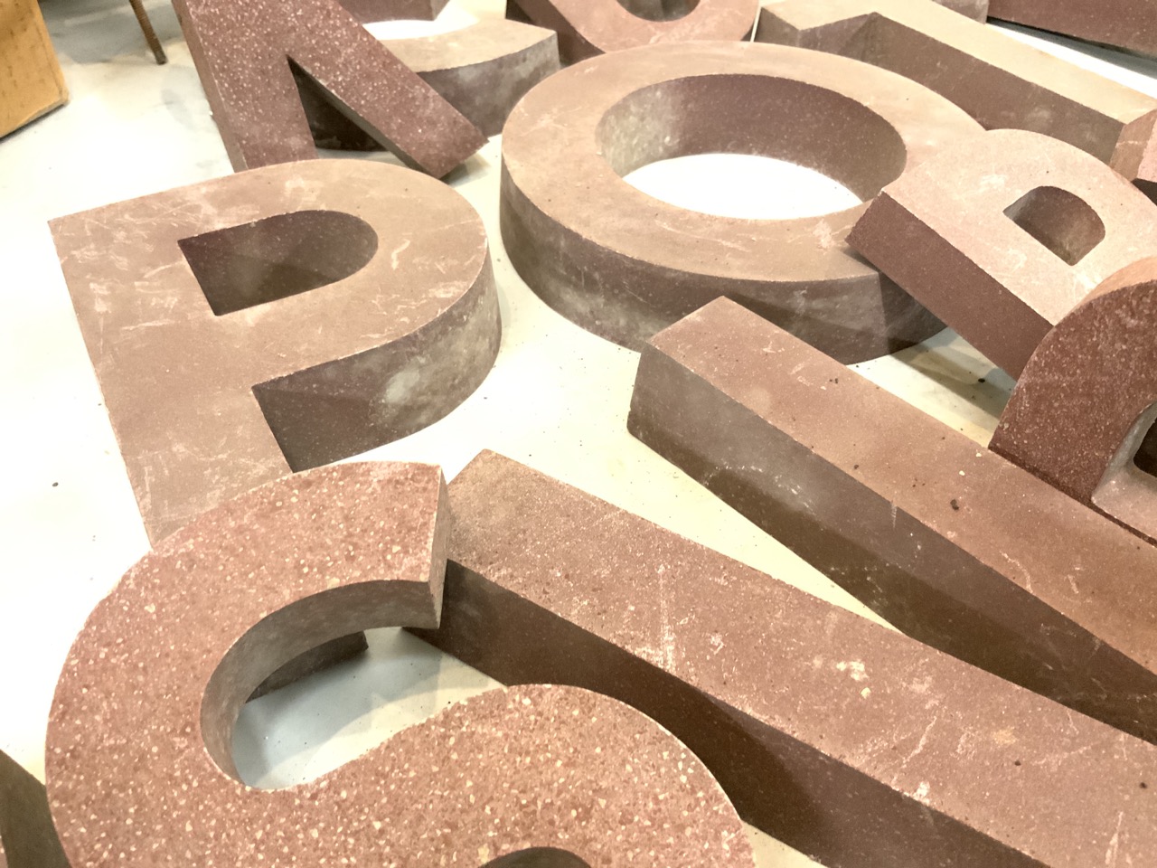An attic find. Old store front letters. Aluminum with a red granite color finish. As seen in photograph preview.