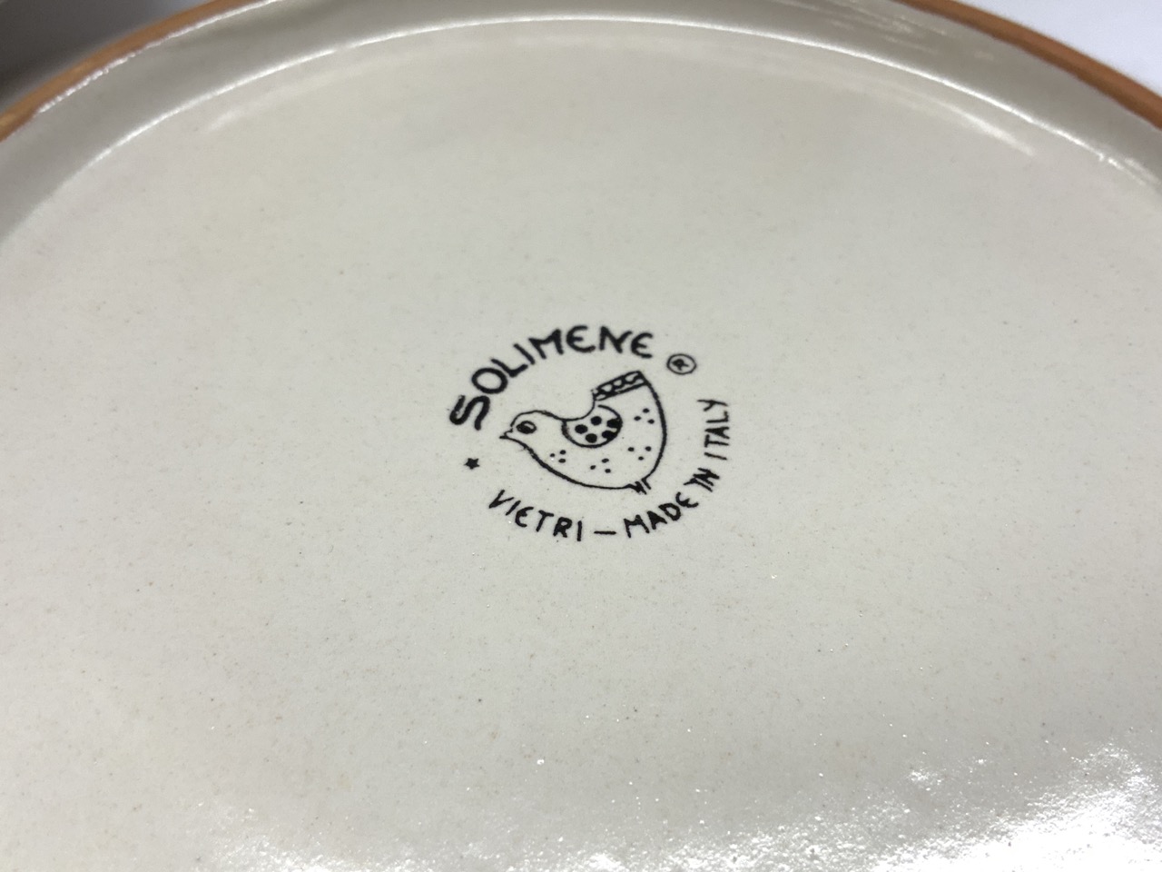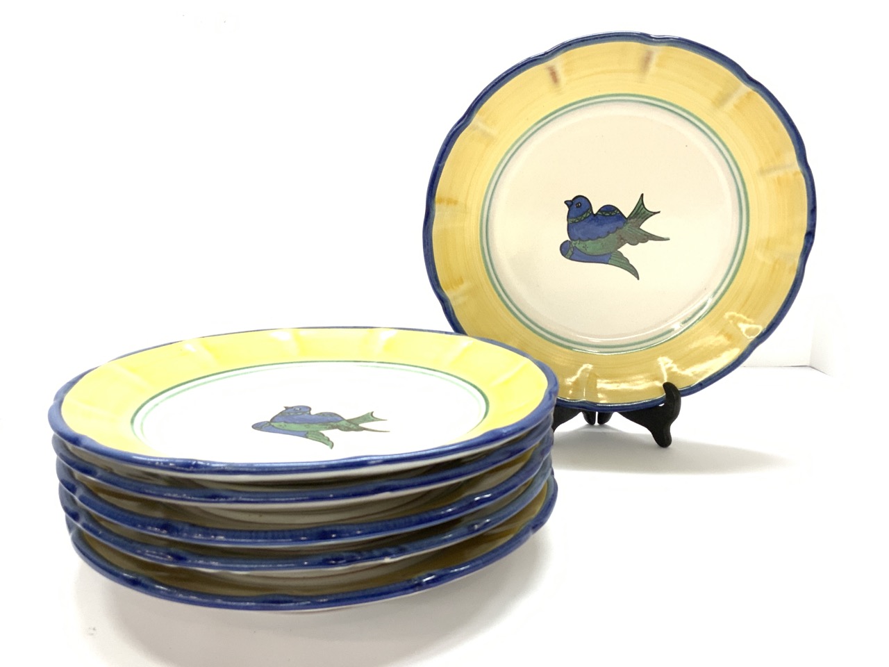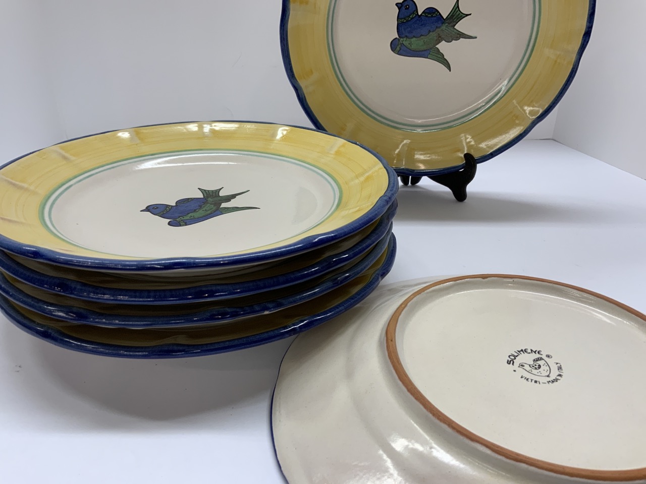 A set of six Solimene Vietri Italian dinner plates. Hand painted birds and florals. Made in ItalyDimensions: 10" diameter