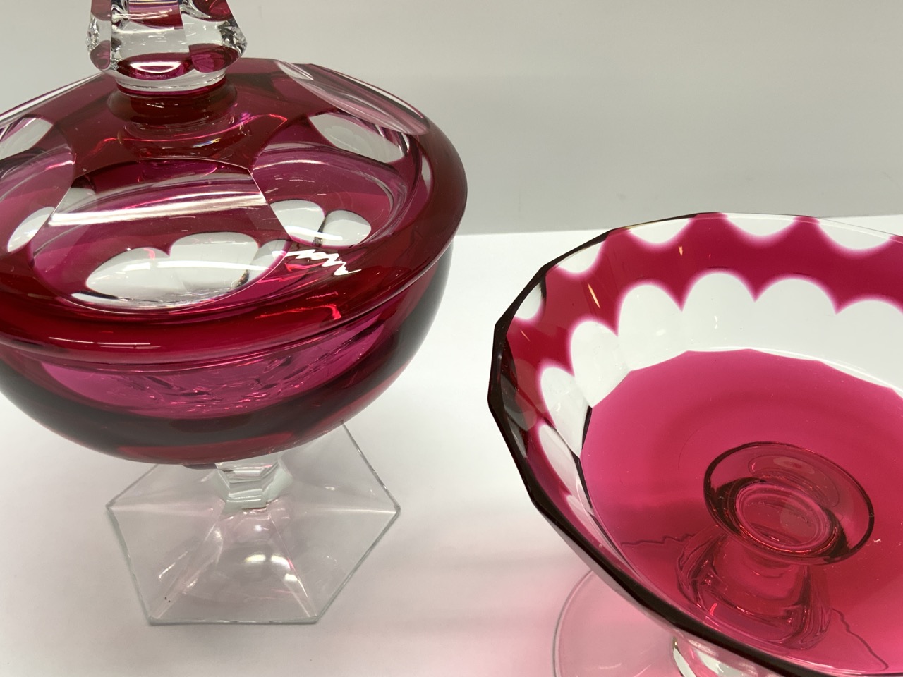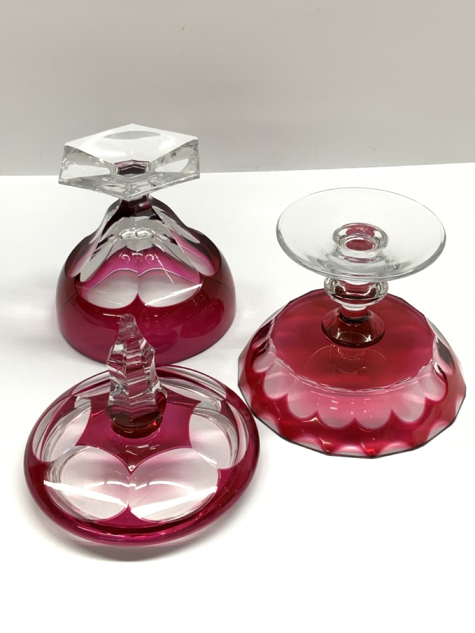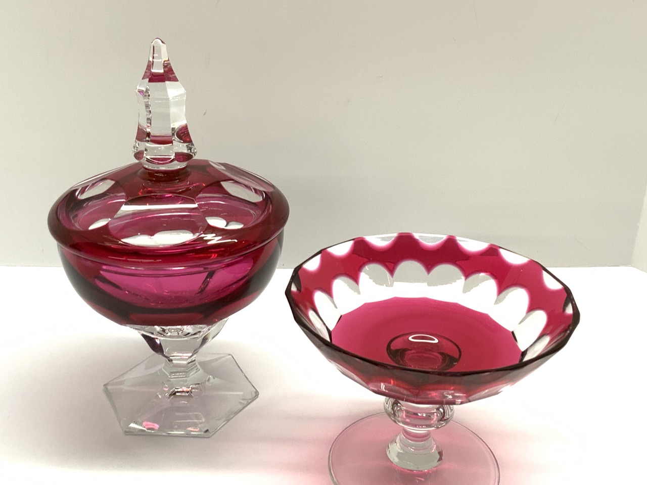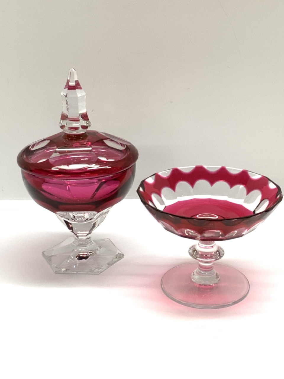 Val. St. Lambert cranberr y cut to clear lidded jar and compote. Signed at base.