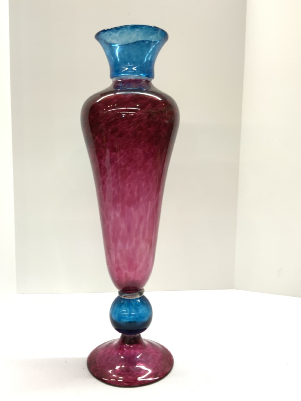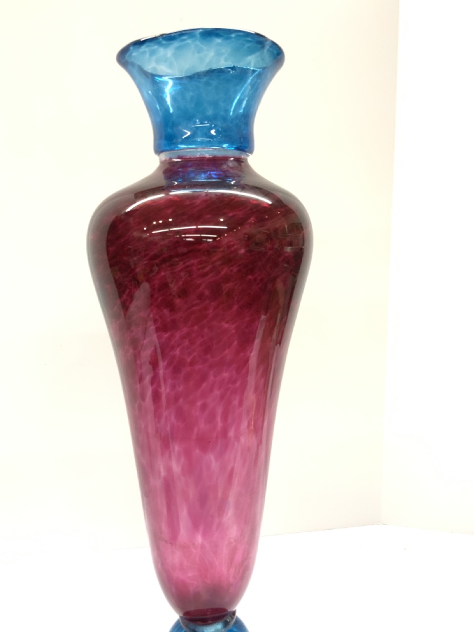 A large contemporary studio art glass vase. Vibrant cranberry and blue color.