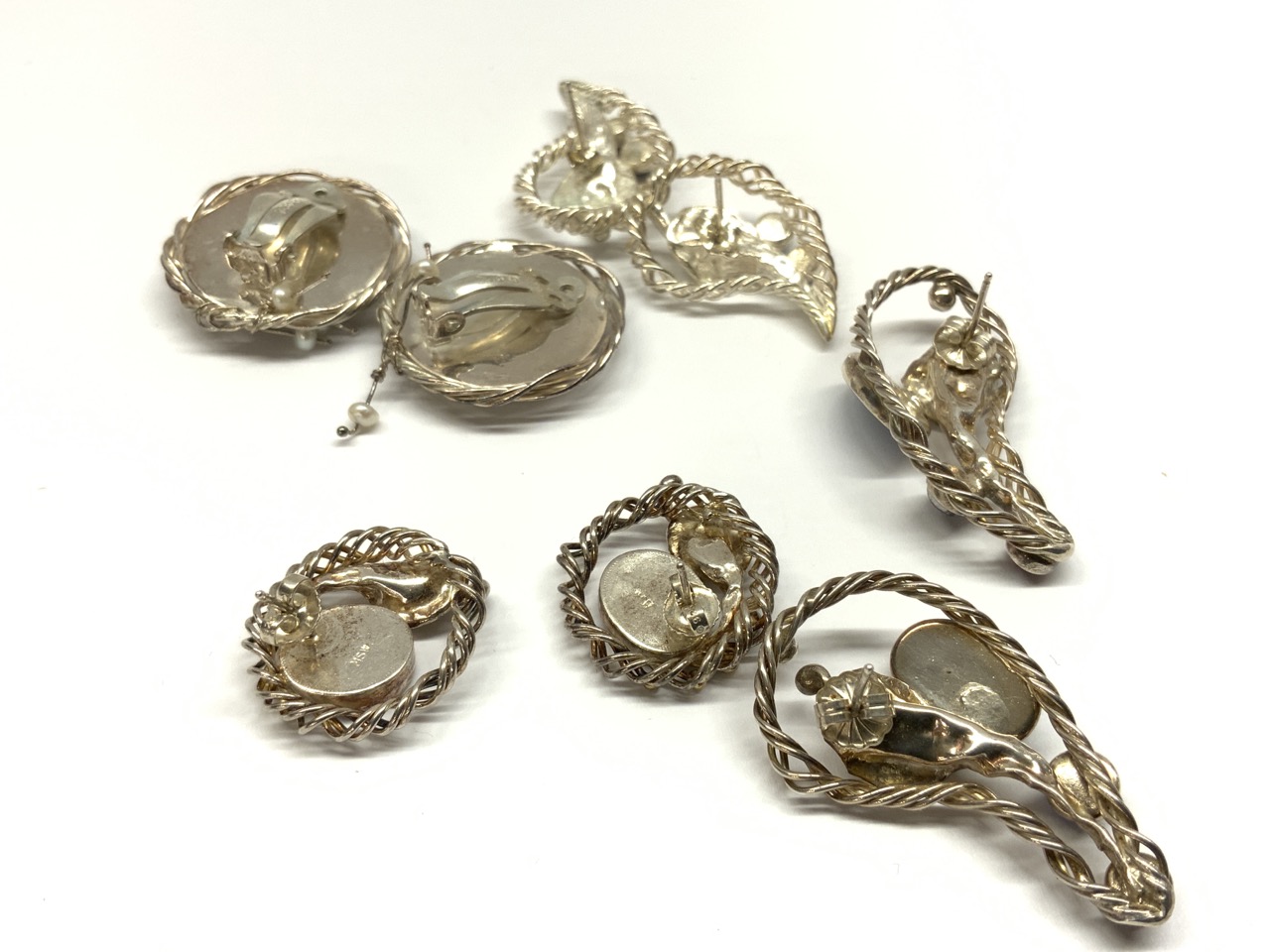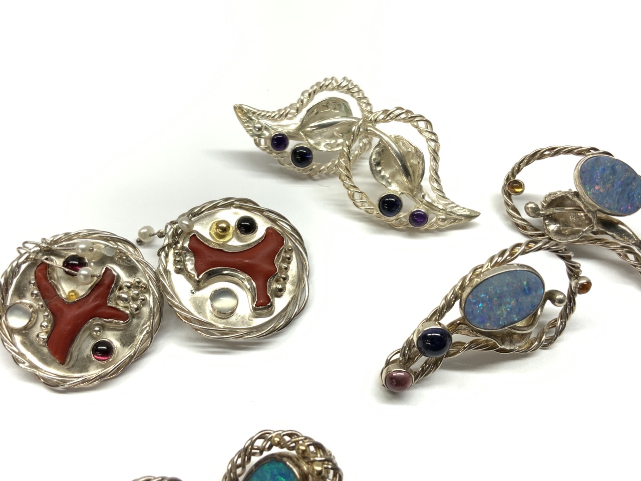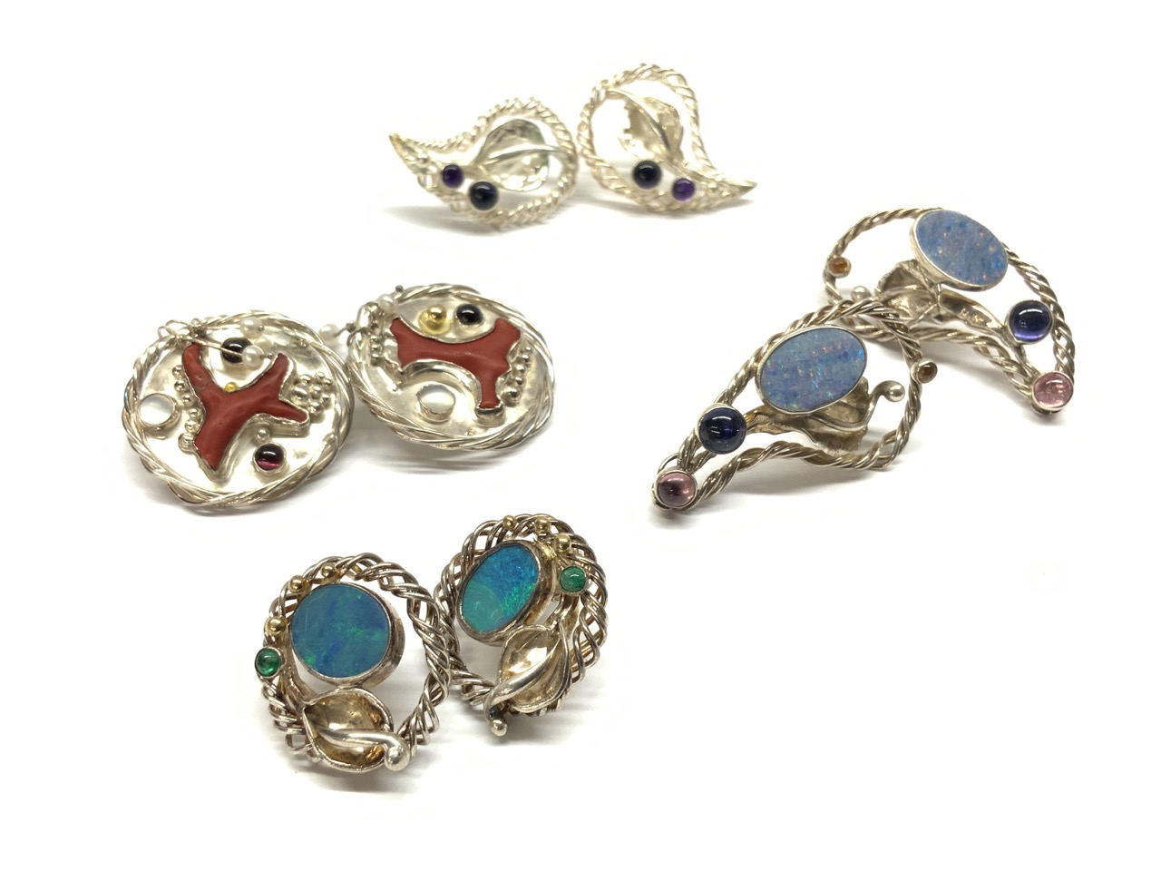 Four pairs of earrings. Sterling silver with Australian opal, amethyst, tourmaline and coral. Three pairs are pierced and earrings with coral are clip.