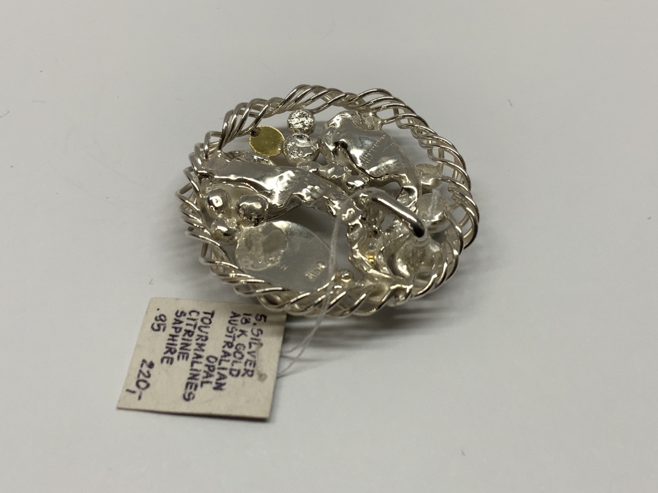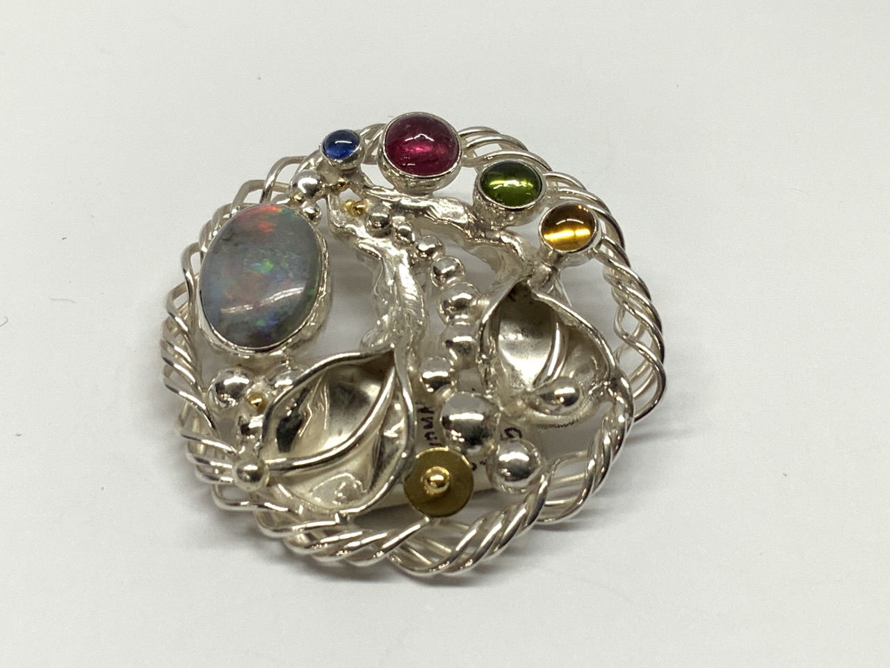 Round gemstone pendant. Sterling silver 18k gold, Australian opal, tourmalines, citrine and sapphire.