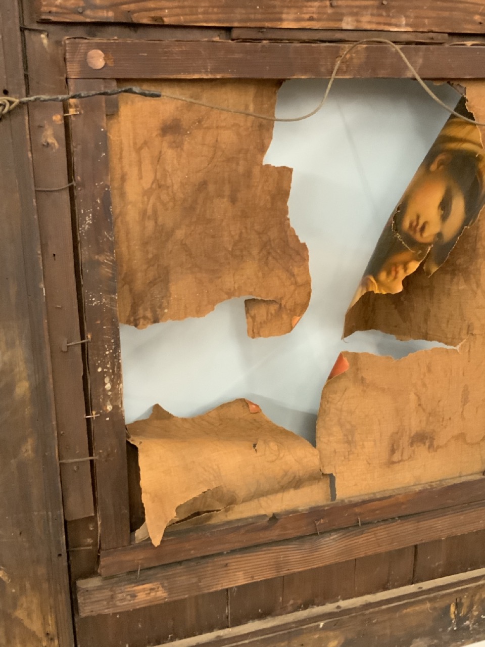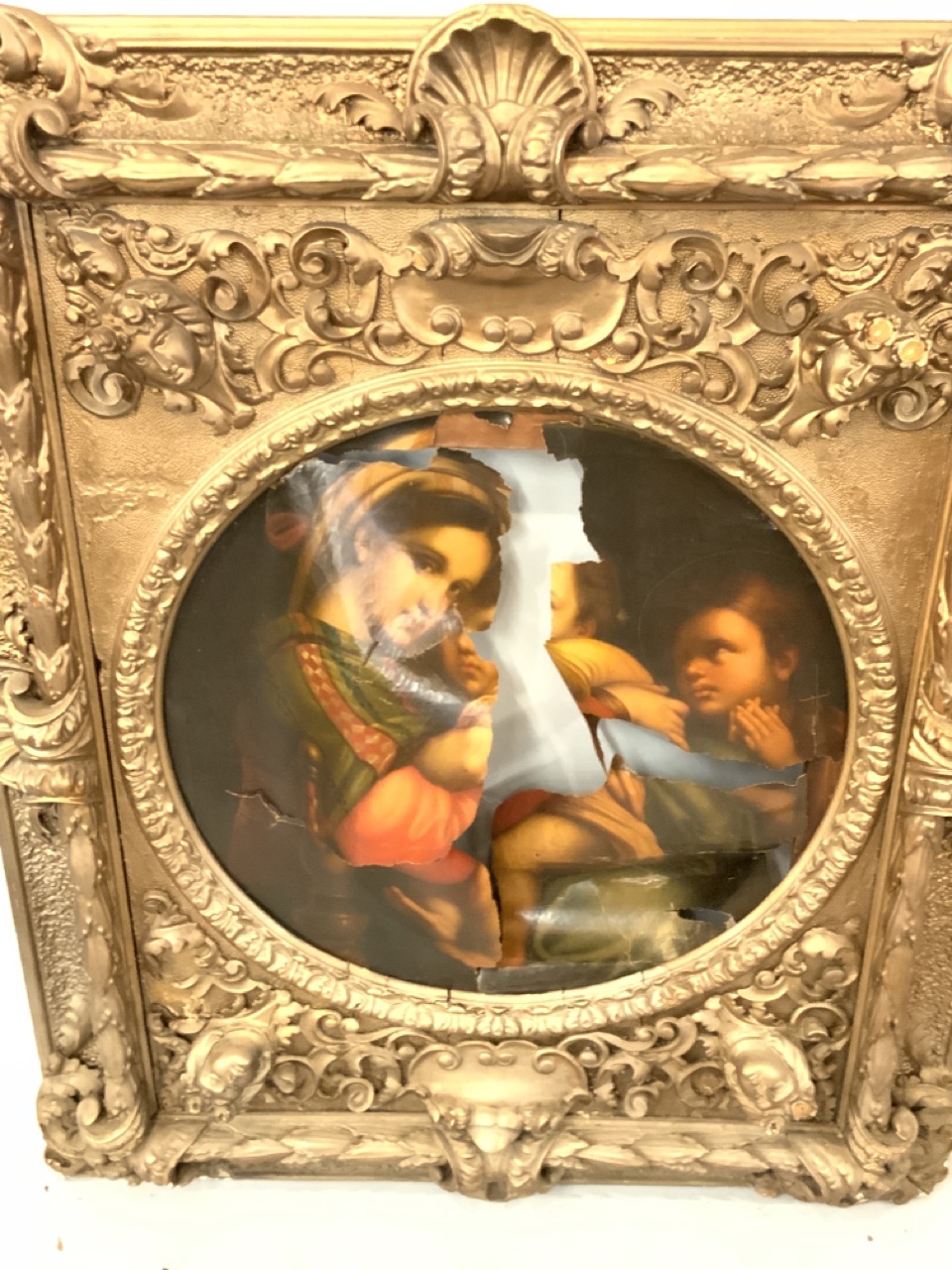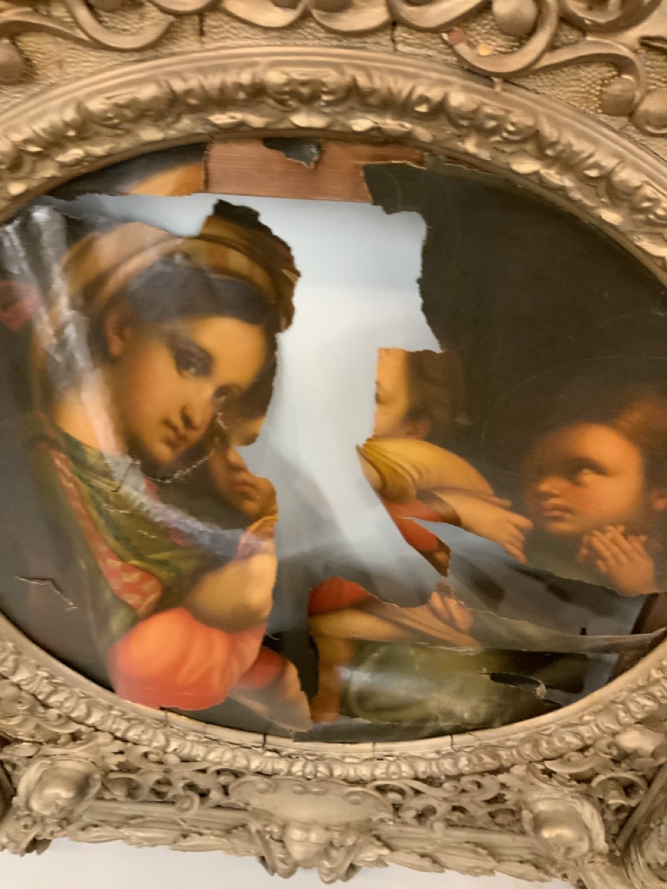 As found needing restoration. A badly torn up Madonna Della Seta.. after Raphael included.