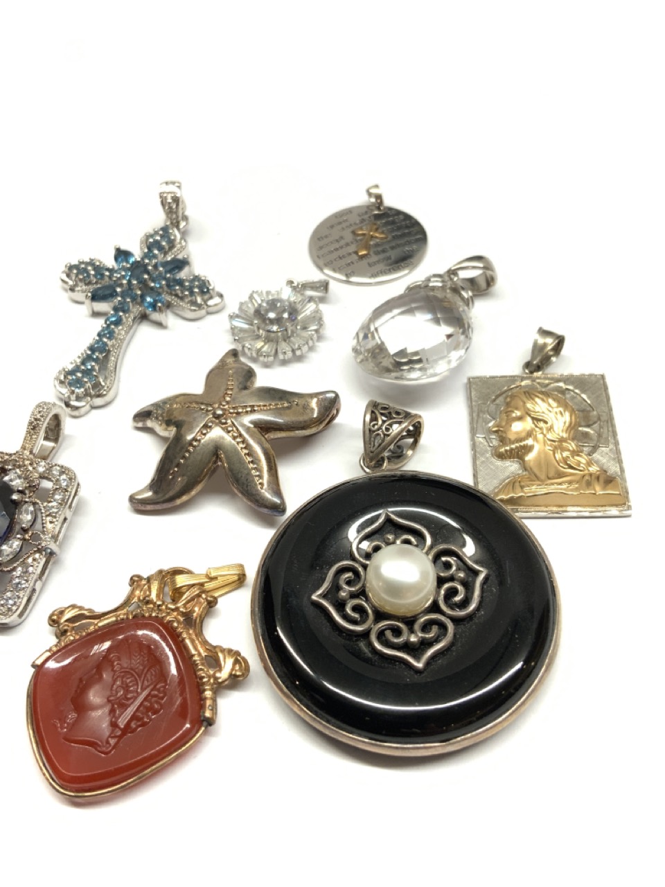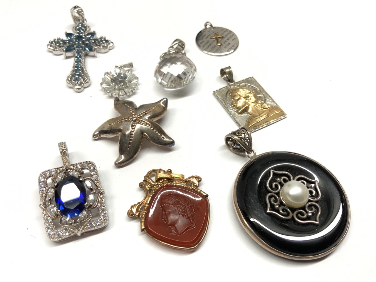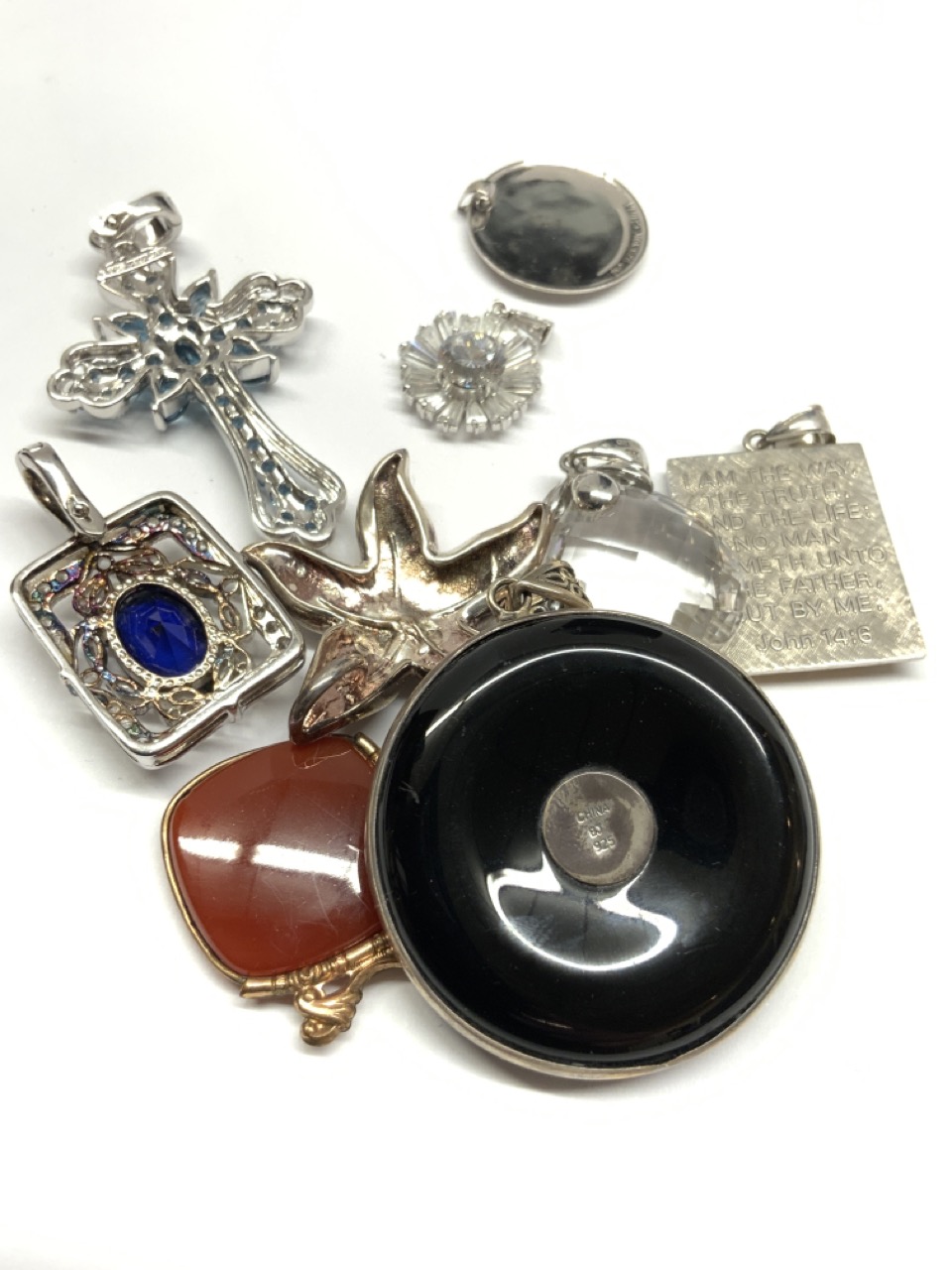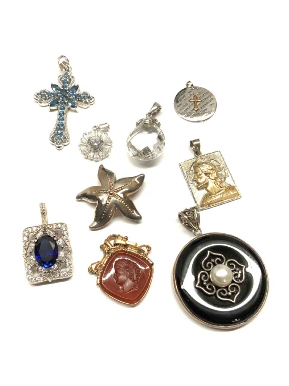 Nine (9) assorted pendants. Sterling silver crosses, onyx and carnelian etc.