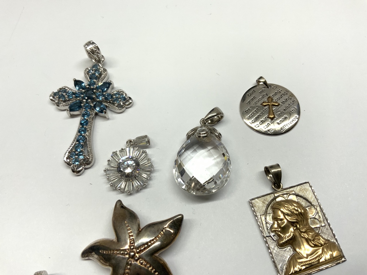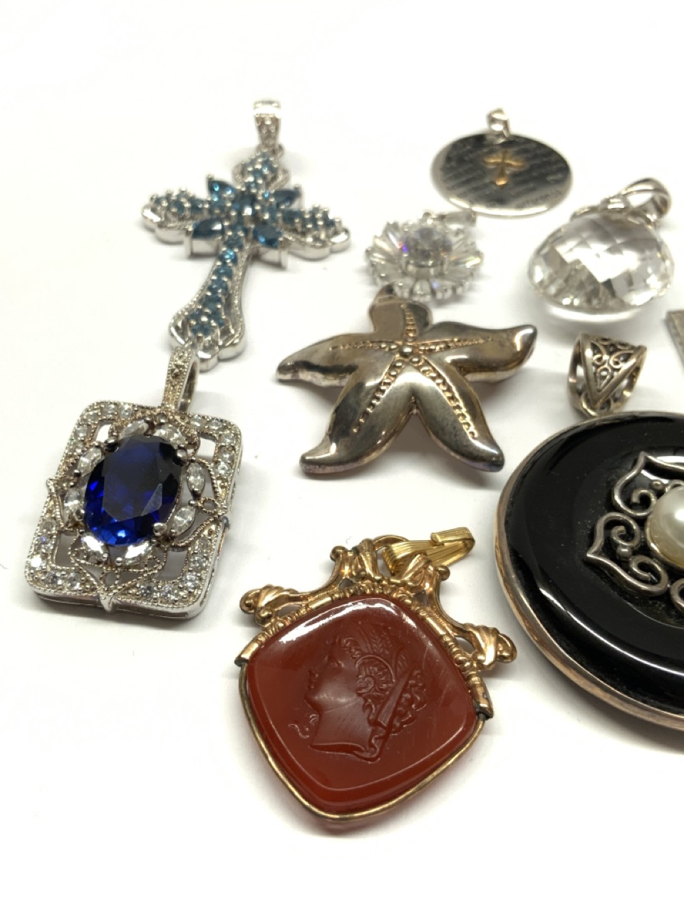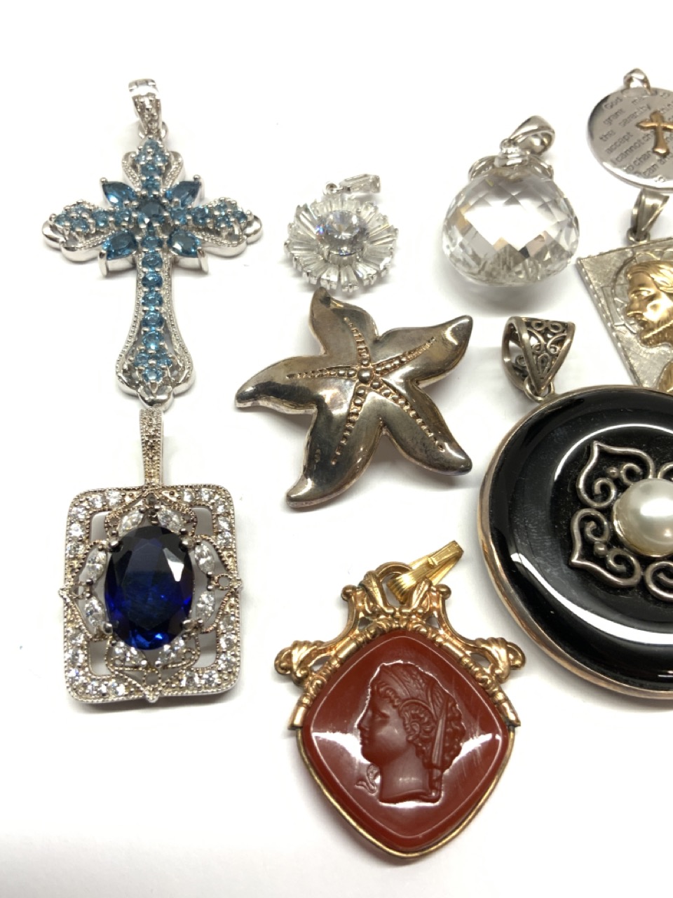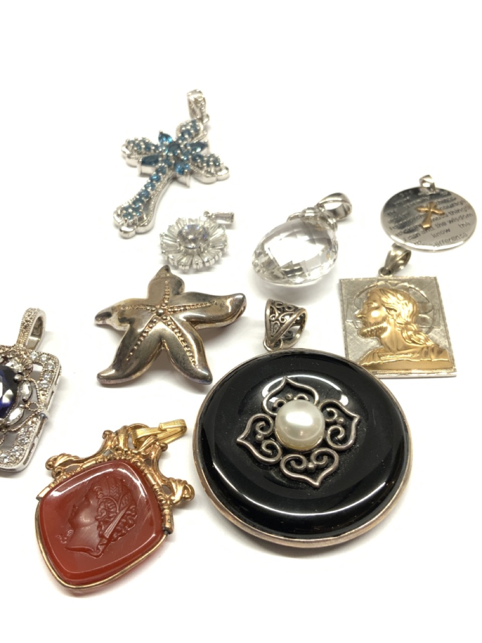 Nine (9) assorted pendants. Sterling silver crosses, onyx and carnelian etc.