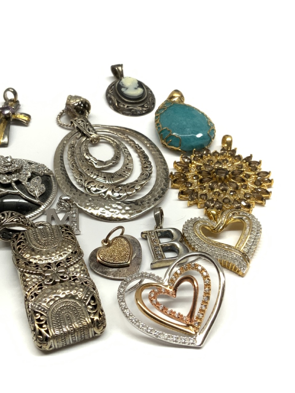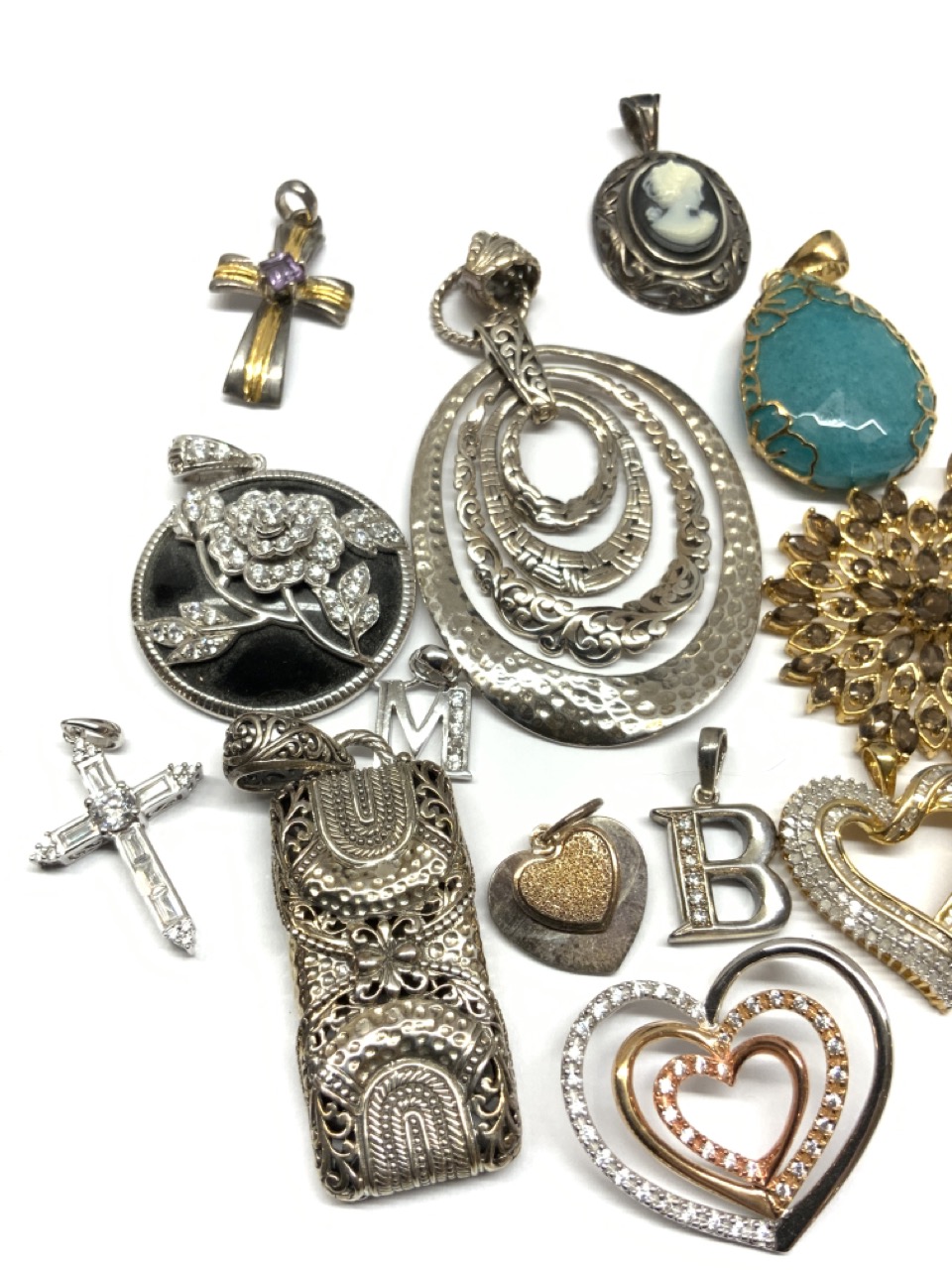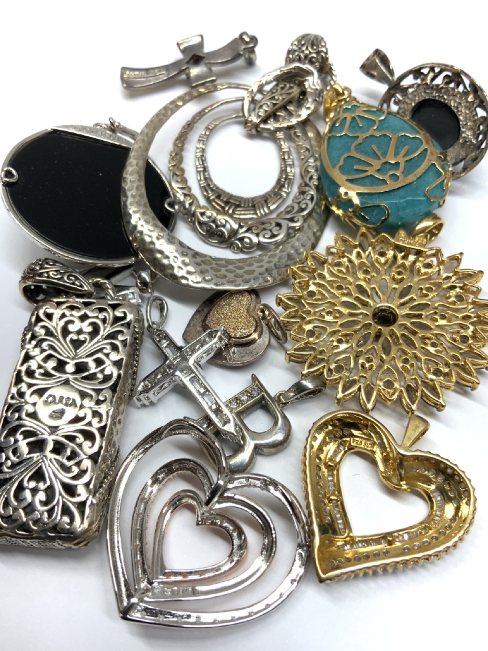 Assorted sterling silver jewelry pendants.