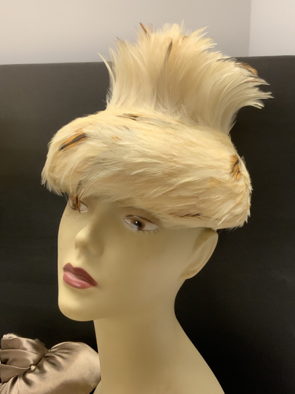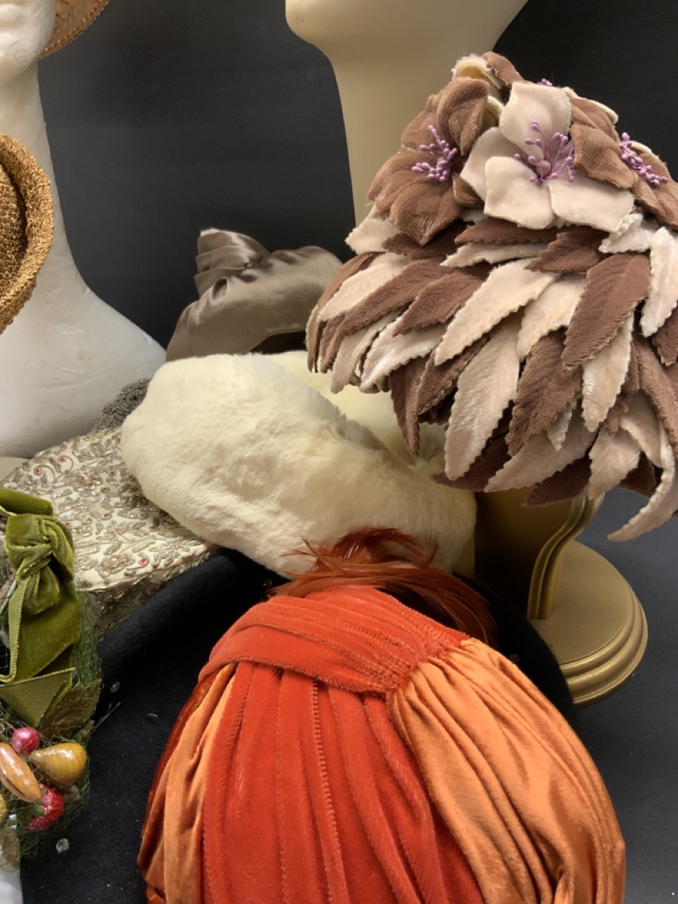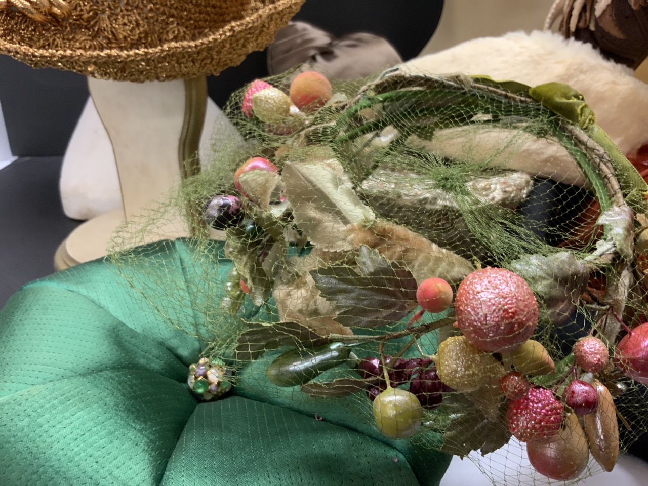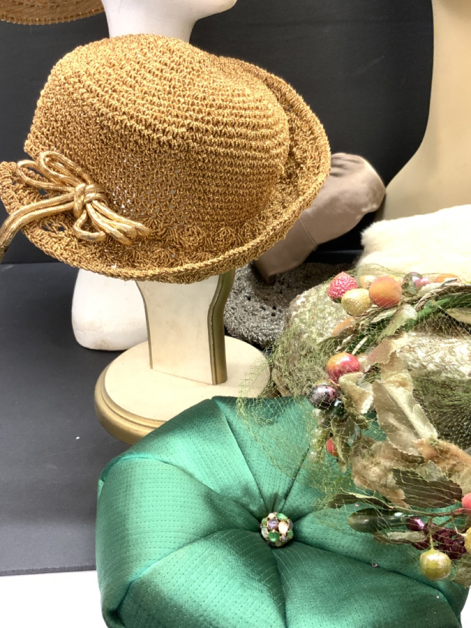 A compiled grouping of estate found vintage hats. Pristine special feather hat and the gold metal hat looks perfect on. Most 1940's,