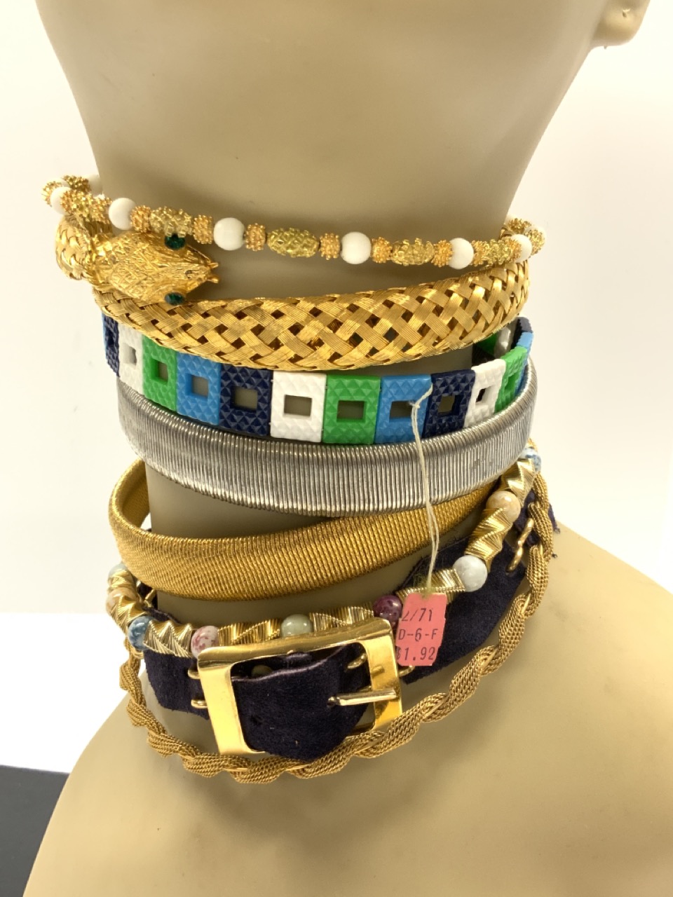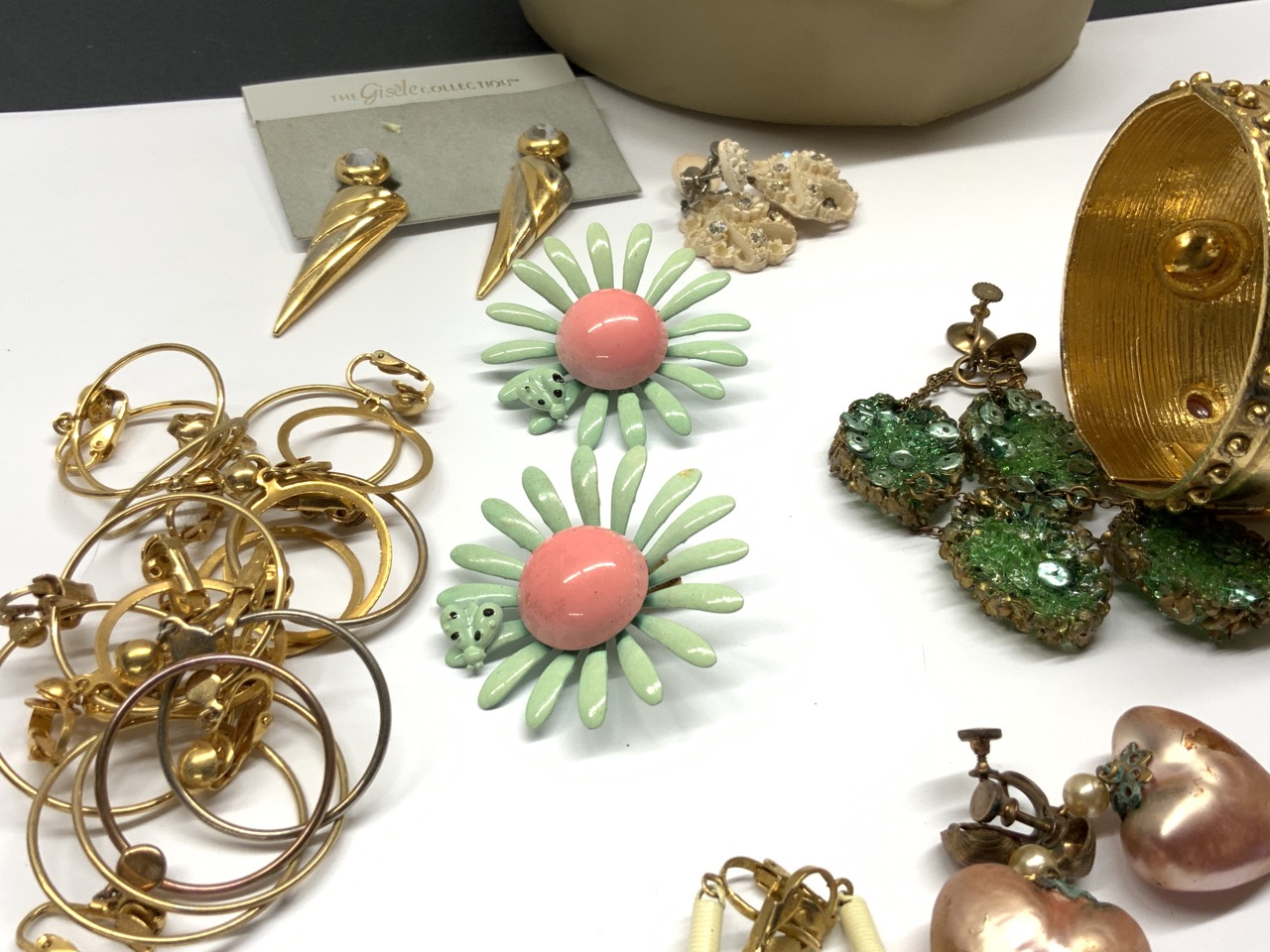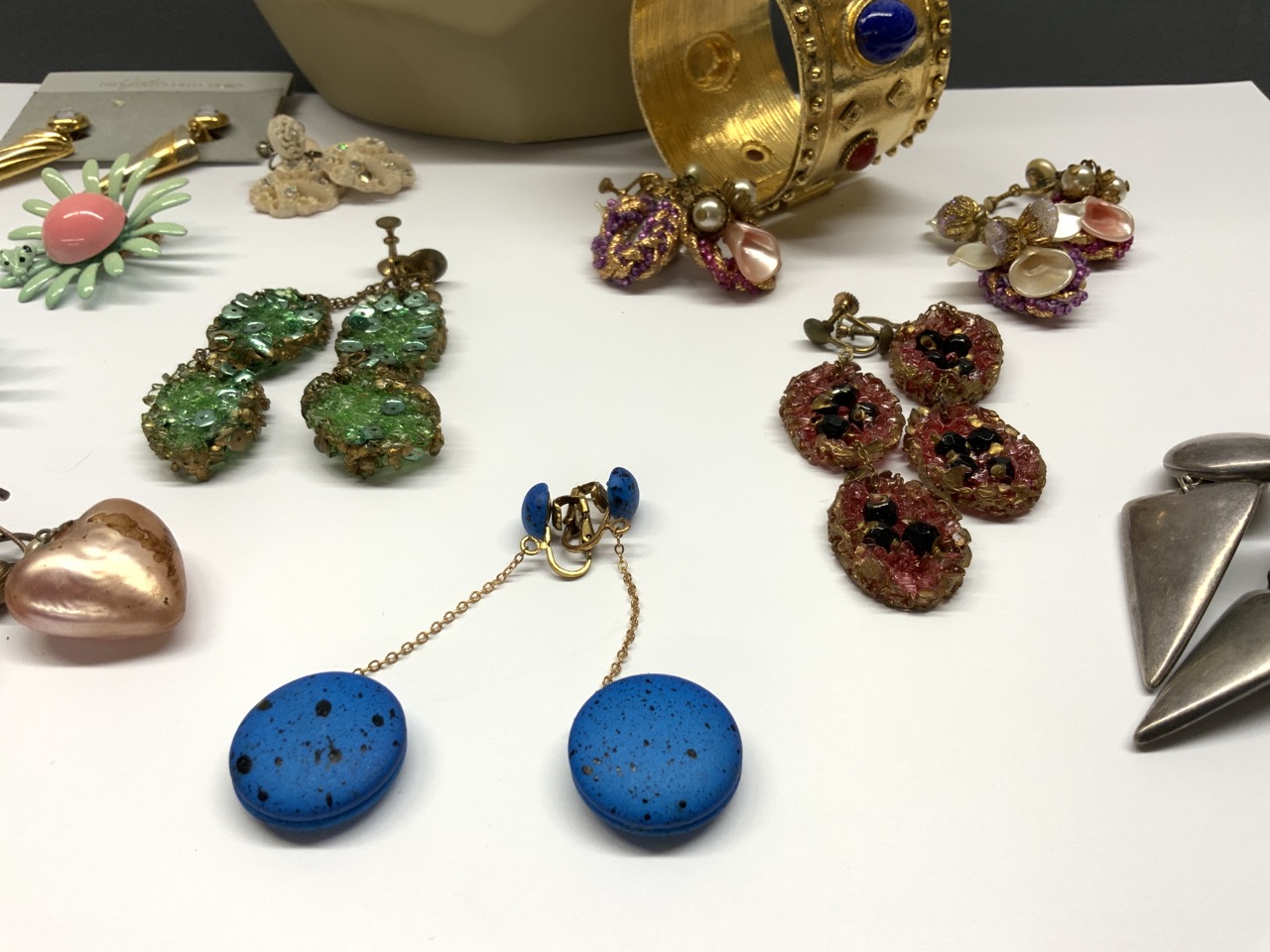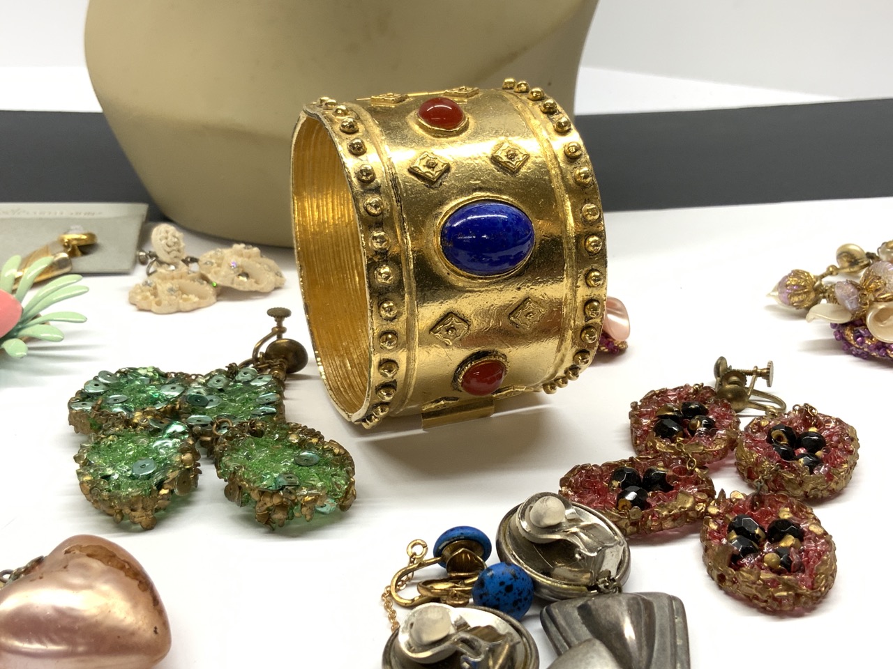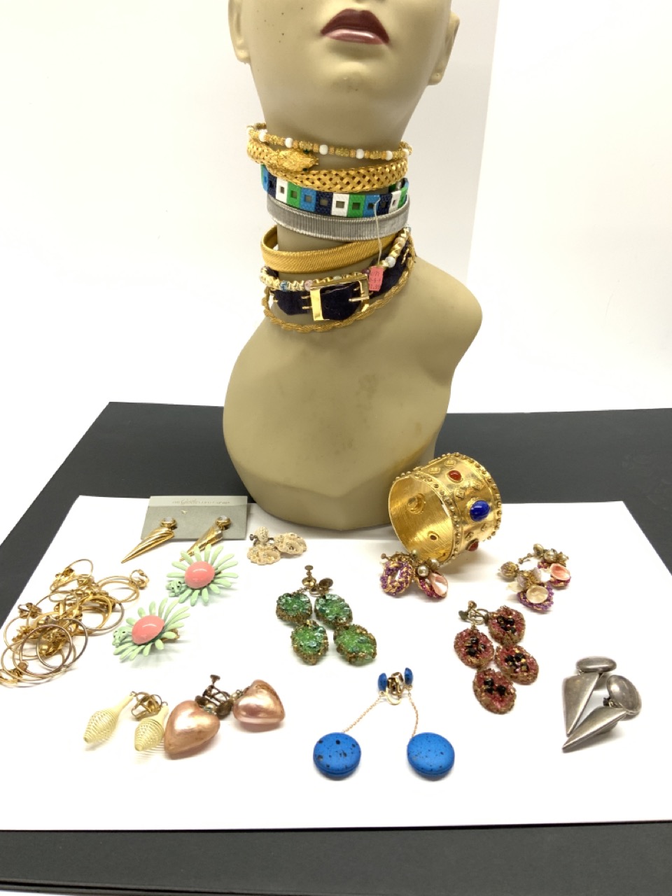Compiled vintage costume jewelry earrings and neck collars and chokers, quality gold tone bangle cuff.