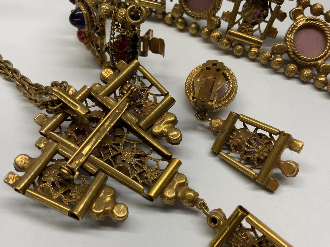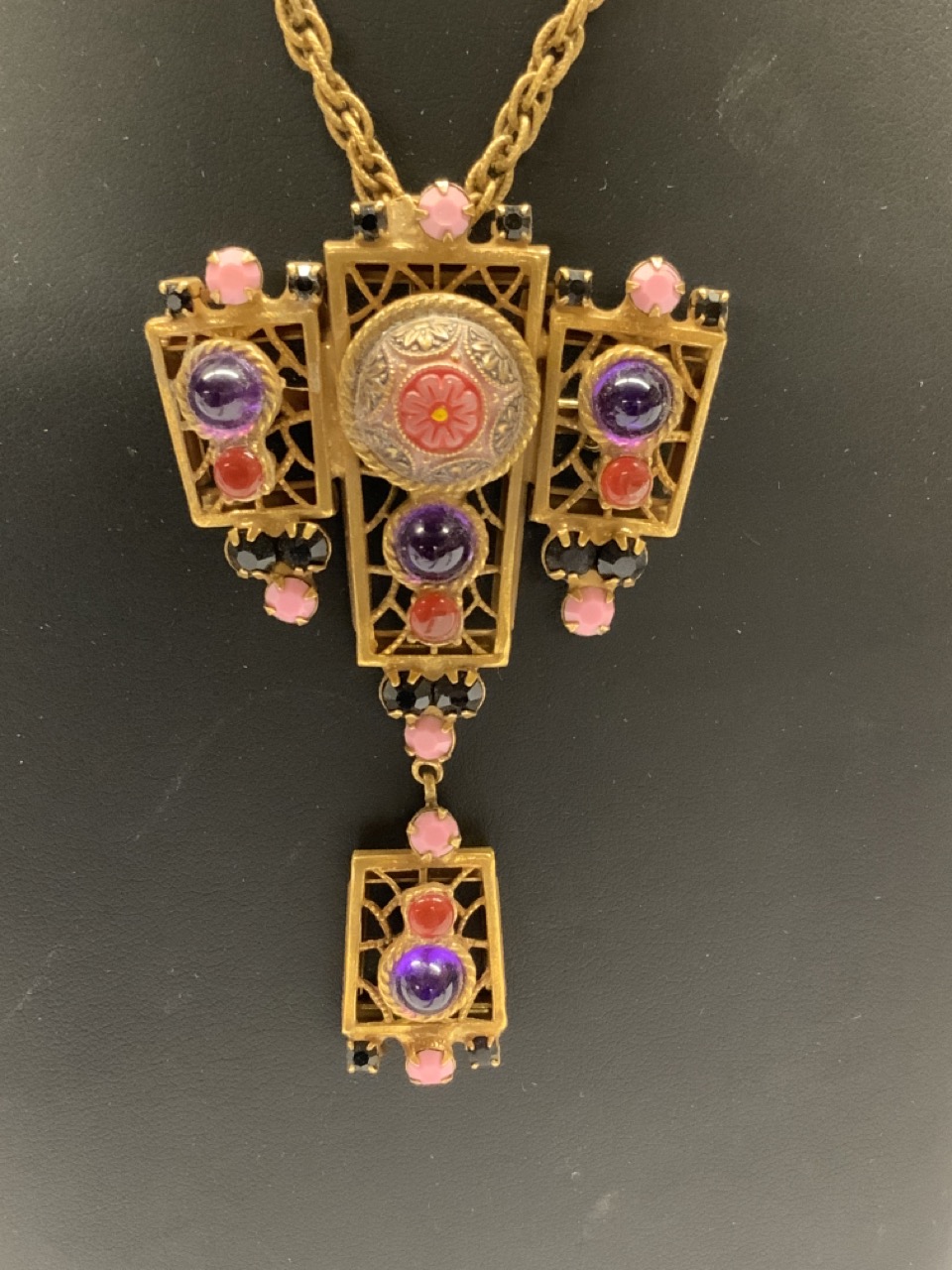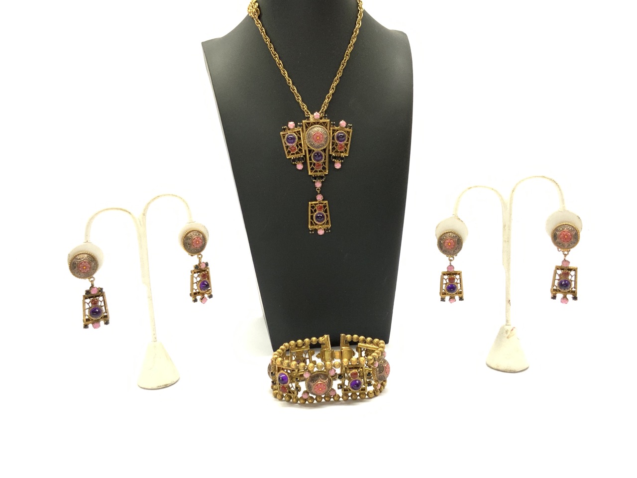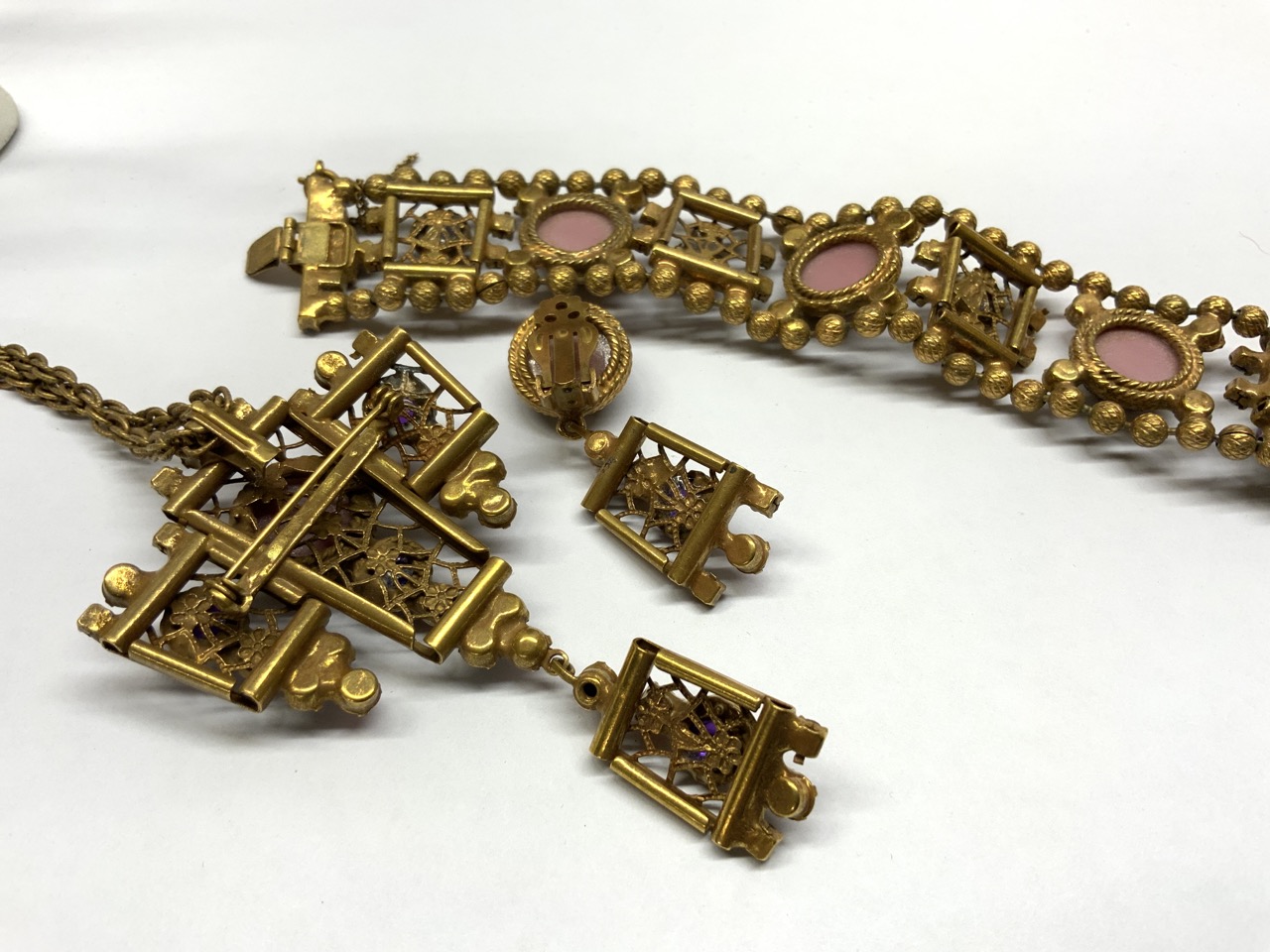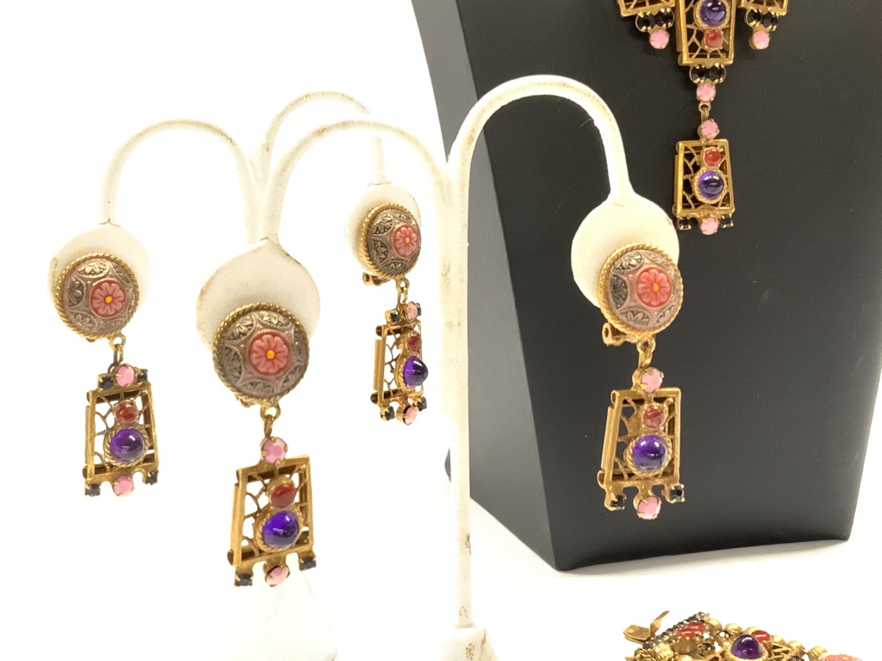 Matching necklace with brooch/pendant, bracelet and two pairs clip earrings.