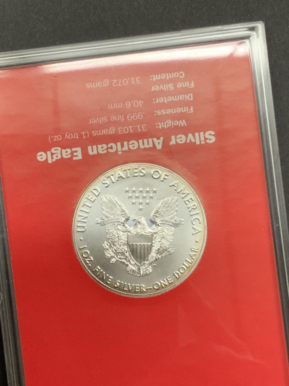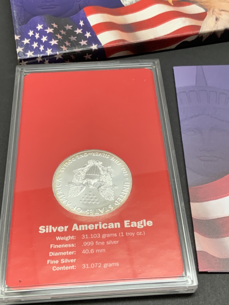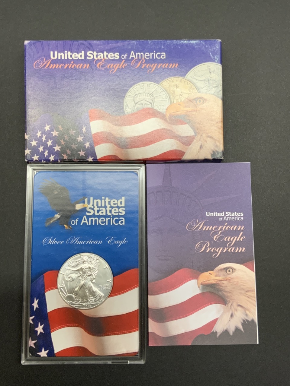2019 American silver eagle dollar housed in issued case and sleeve.