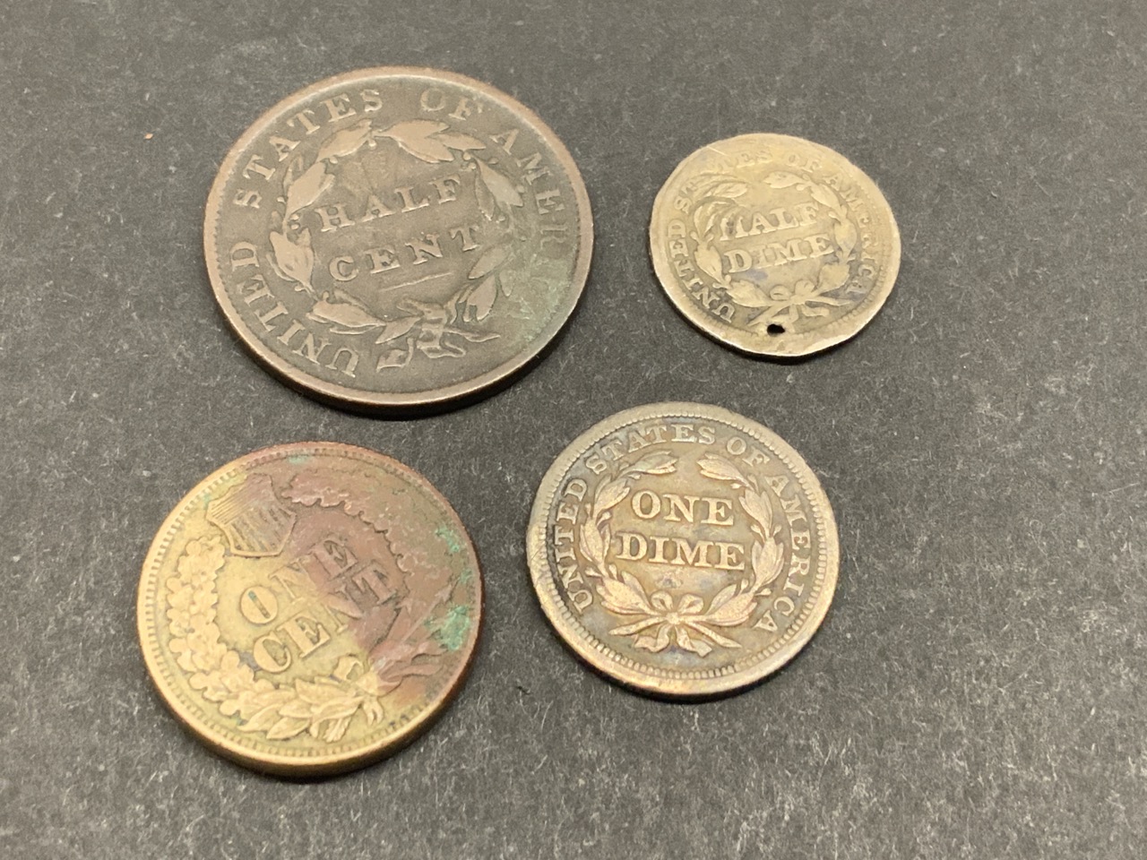 1800’s U.S. Coinage including 1864 Indian Head, 1835 Half Cent, 1853 w/ arrows half dime, 1853 w/arrows dime.