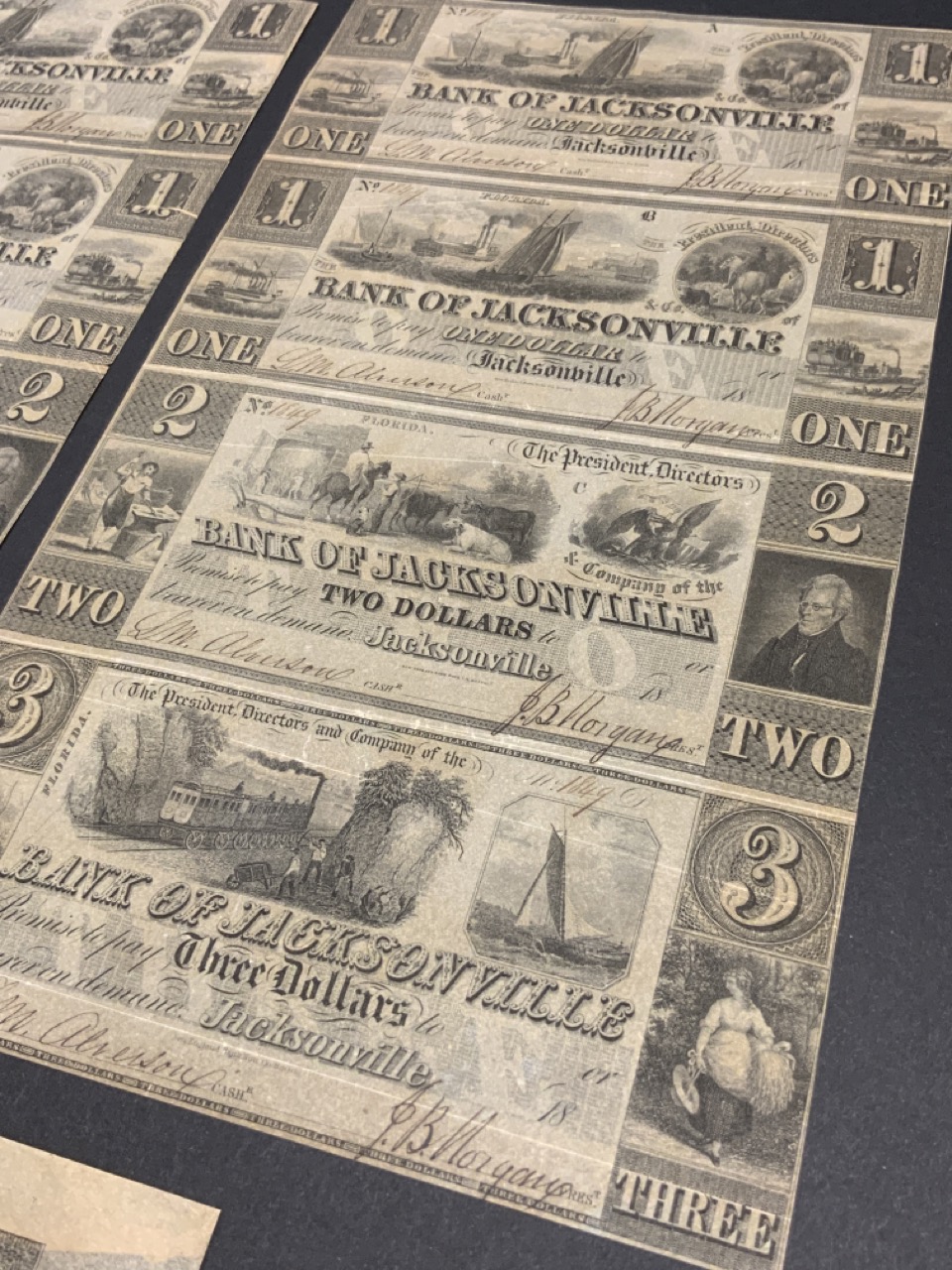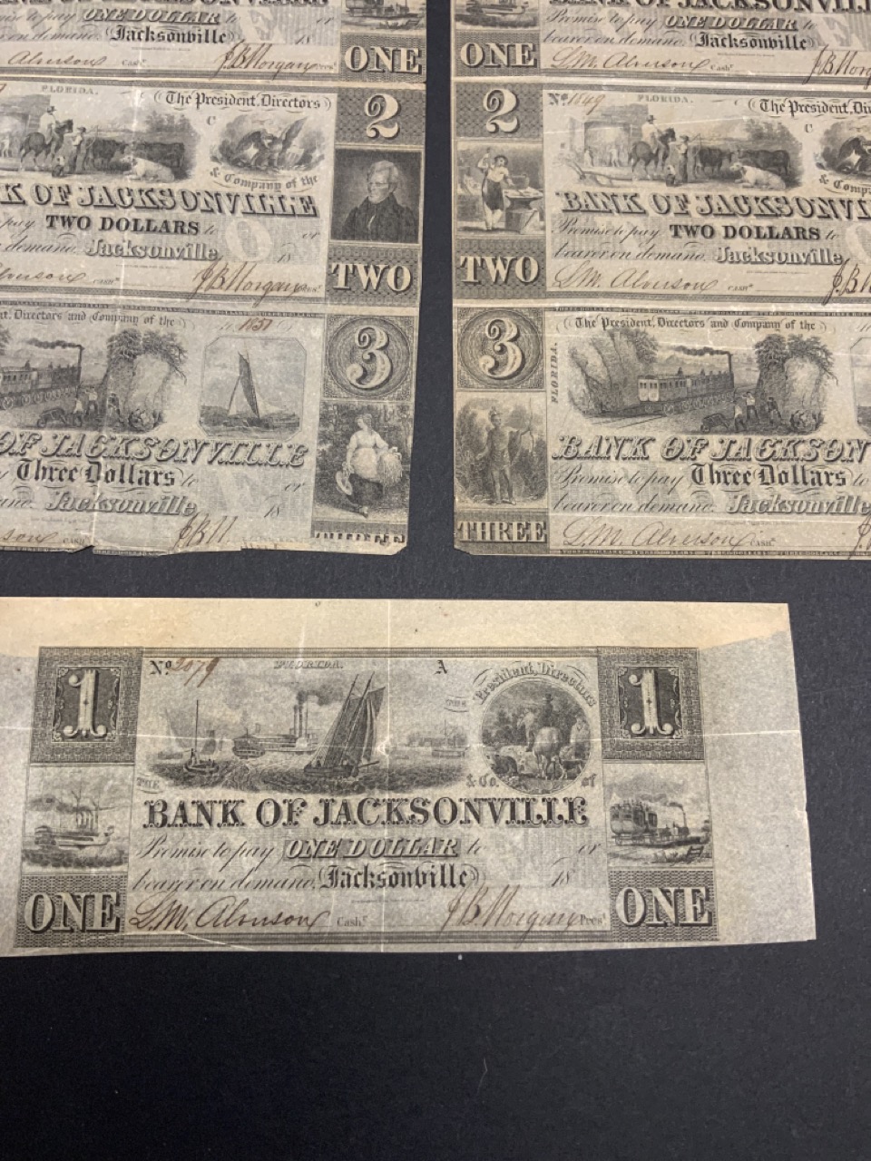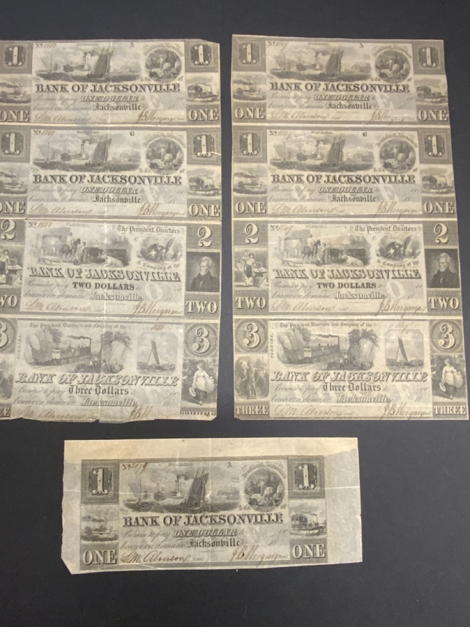 Bank Of Jacksonville, Florida. Two (2) uncut uncirculated sheets with four (4) $1 notes, two (2) $2 and Two (2) $3. Additional $1 note separate.