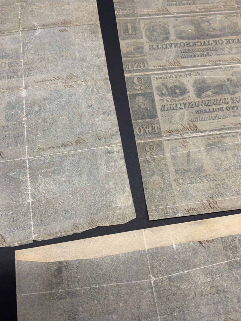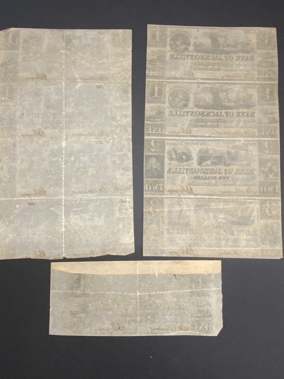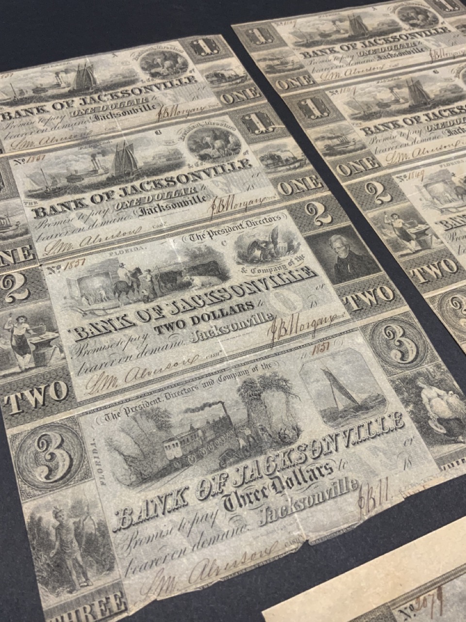 Bank Of Jacksonville, Florida. Two (2) uncut uncirculated sheets with four (4) $1 notes, two (2) $2 and Two (2) $3. Additional $1 note separate.
