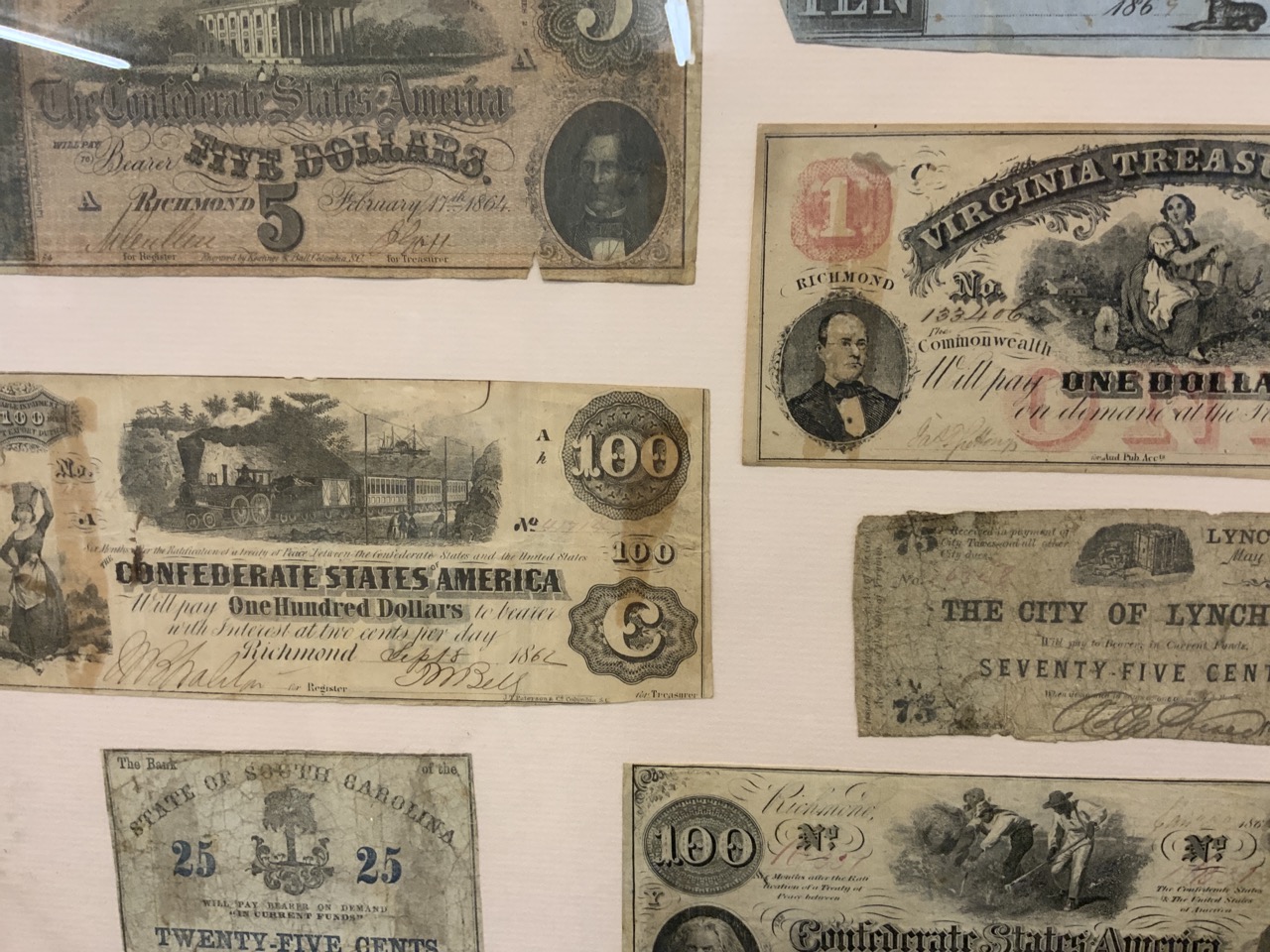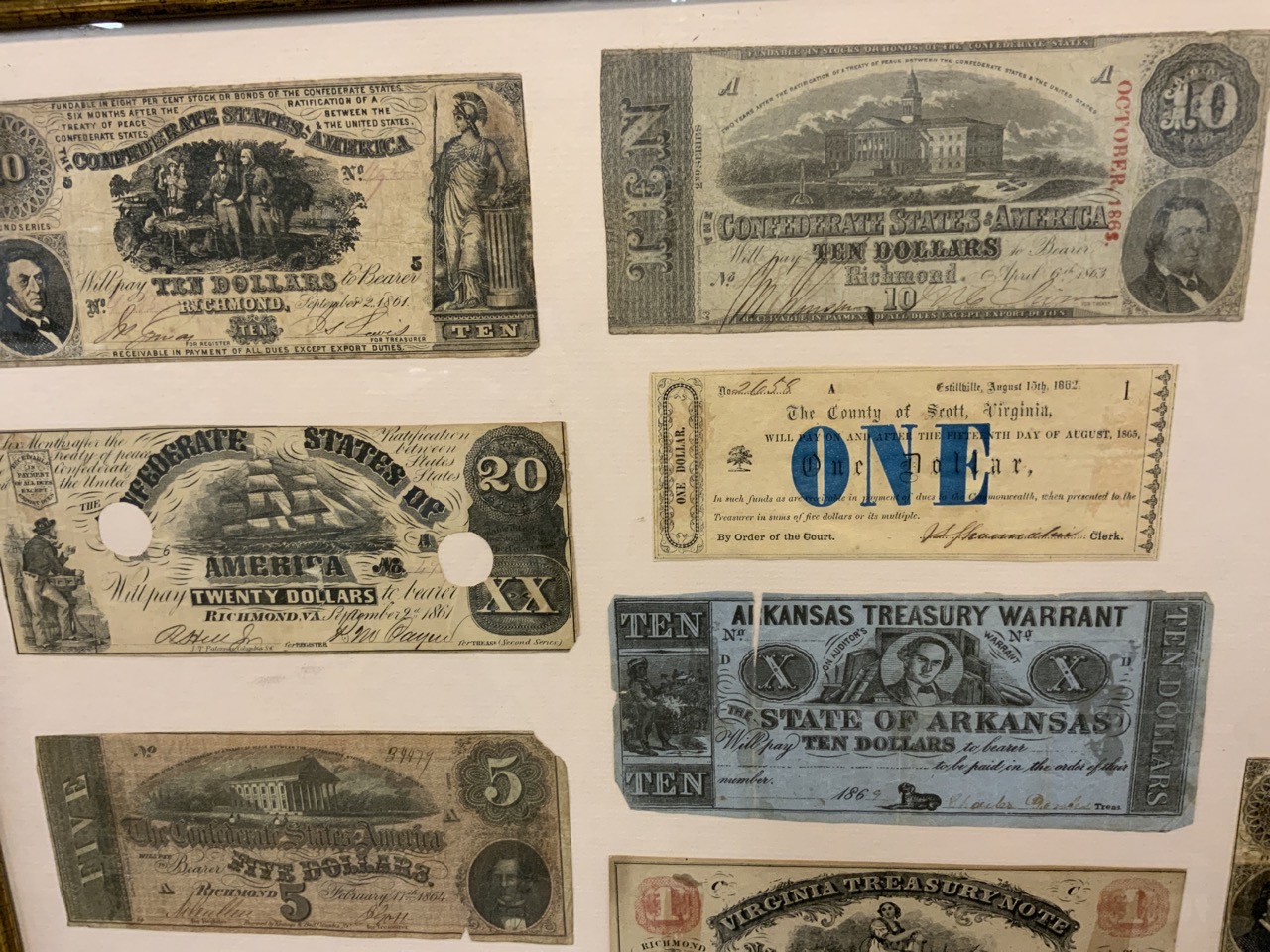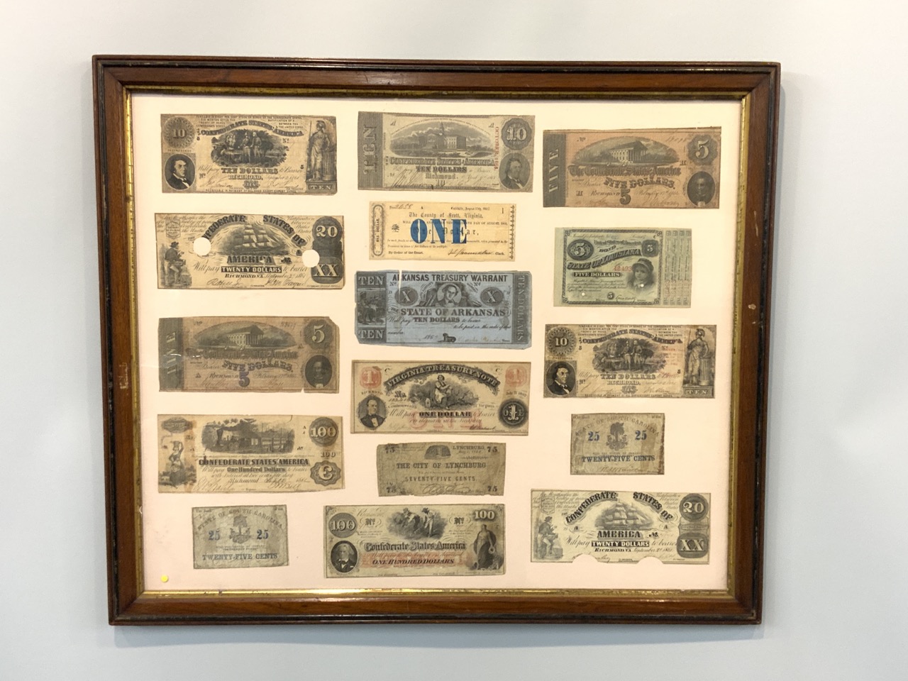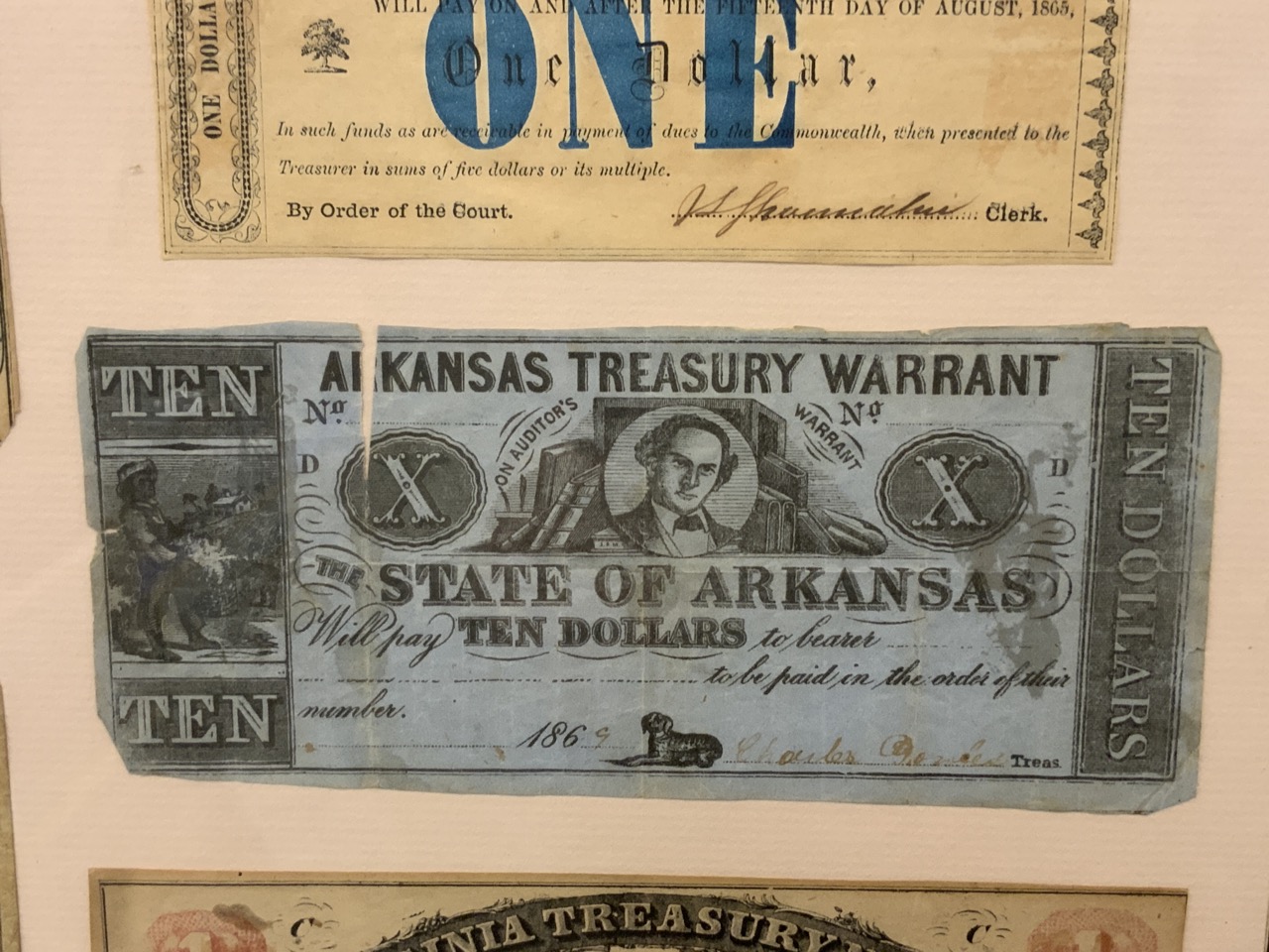 Sixteen (16) Confederate Bank Notes. Arkansas Treasury Warrant Note. Not removed from frame for inspection. Original notes. Please see photograph preview.
