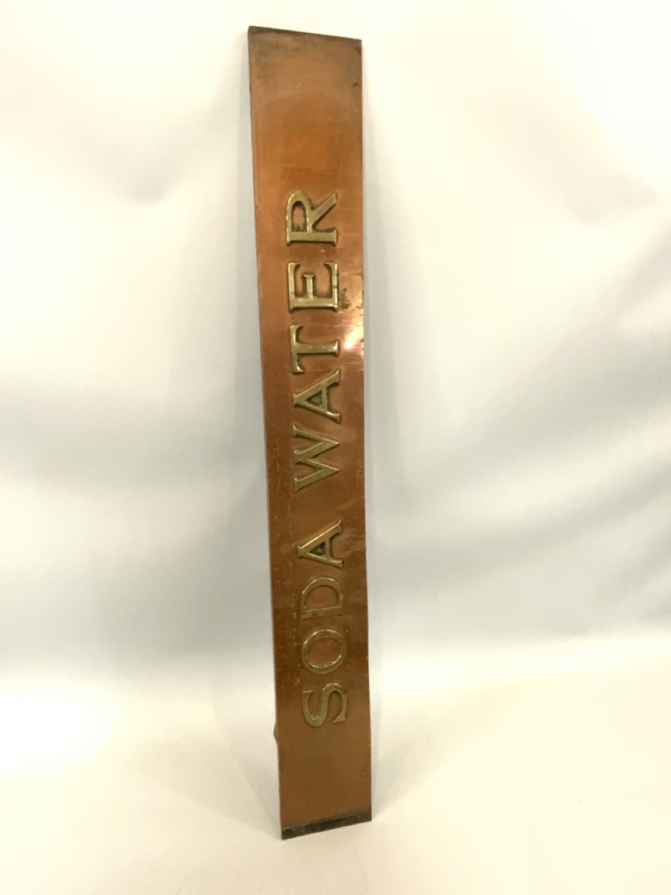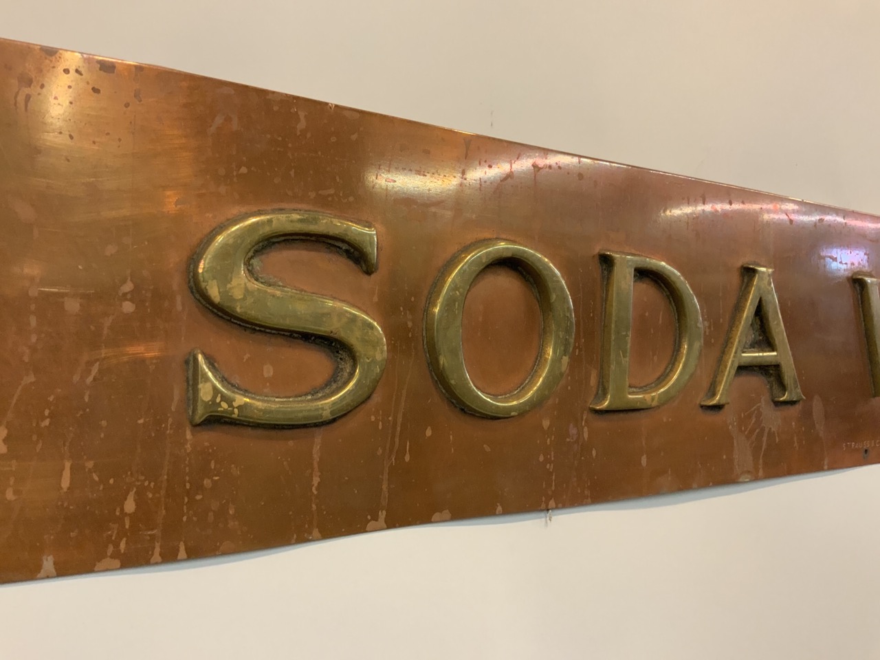 Early 20th century original "Soda Water" sign. Copper and brass construction. Signed Strauss & Co.