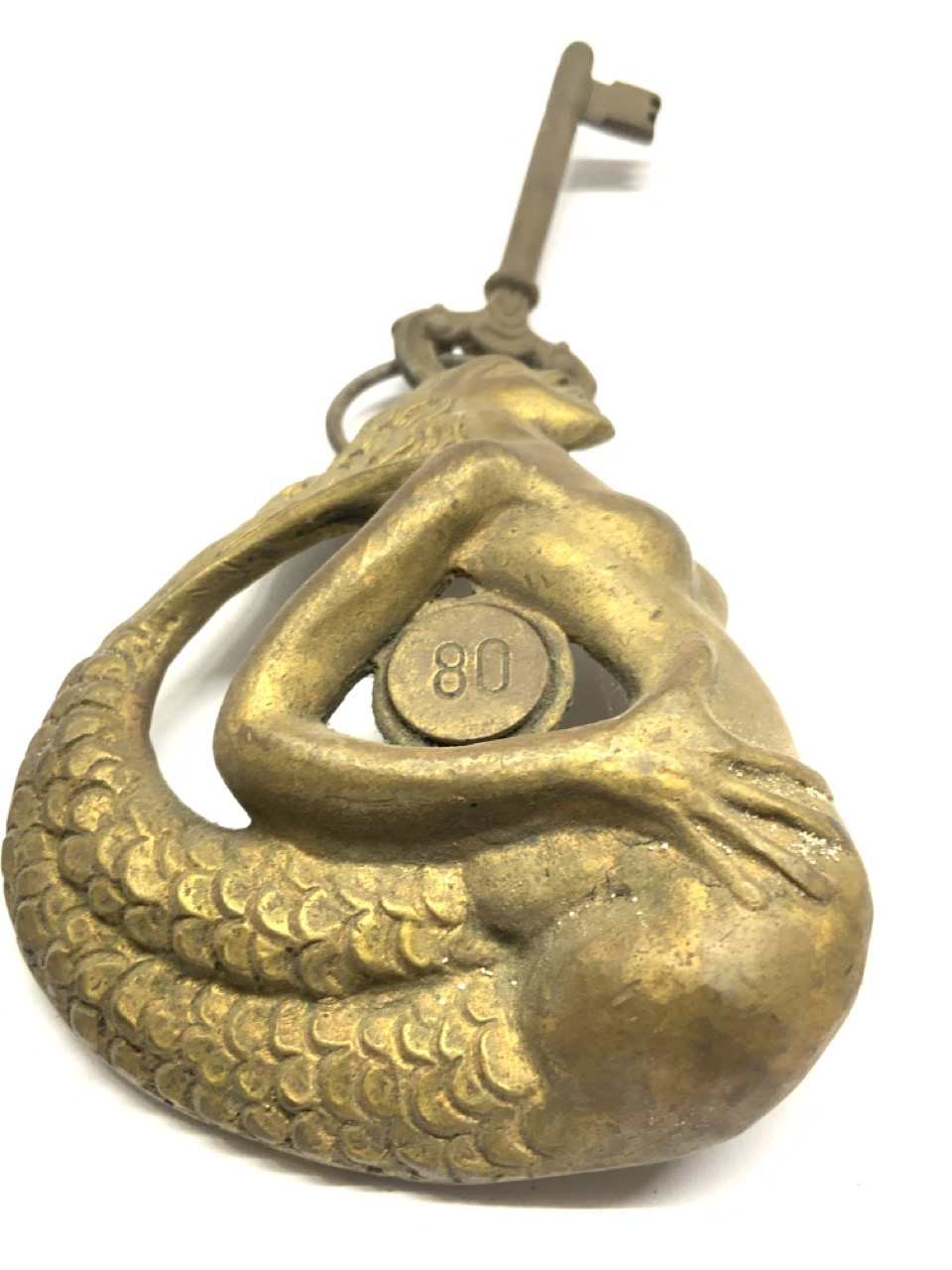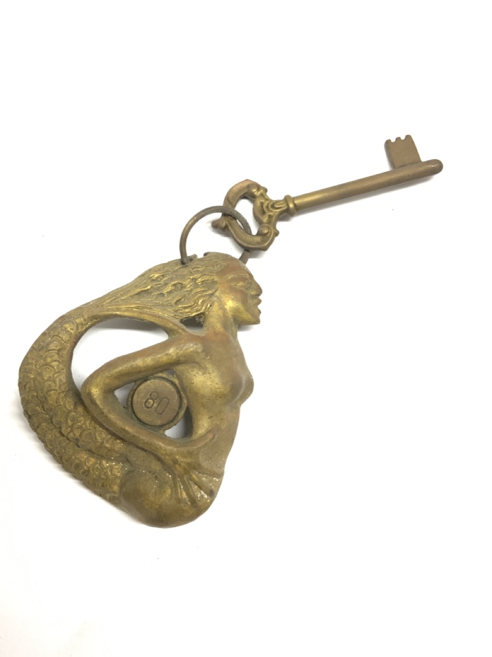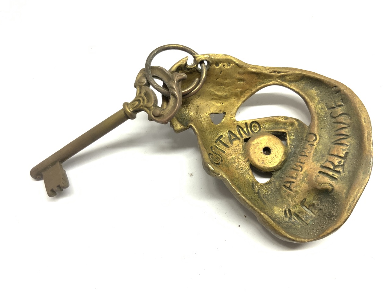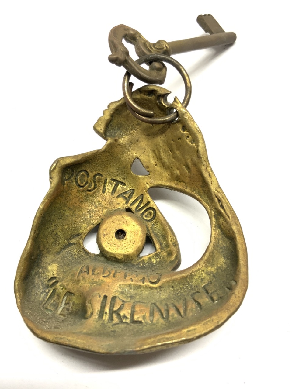 Early 20th century hotel room key at the "Albergo Le Sirenuse" in Positano, Italy. A figure solid brass/bronze mermaid key holder with key.