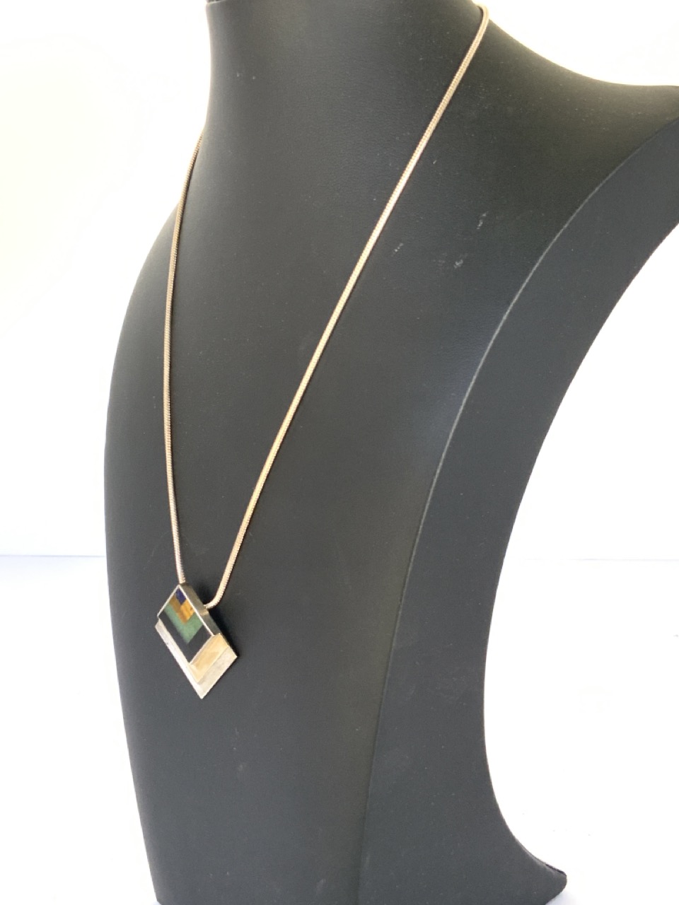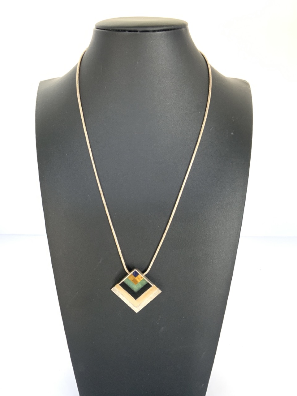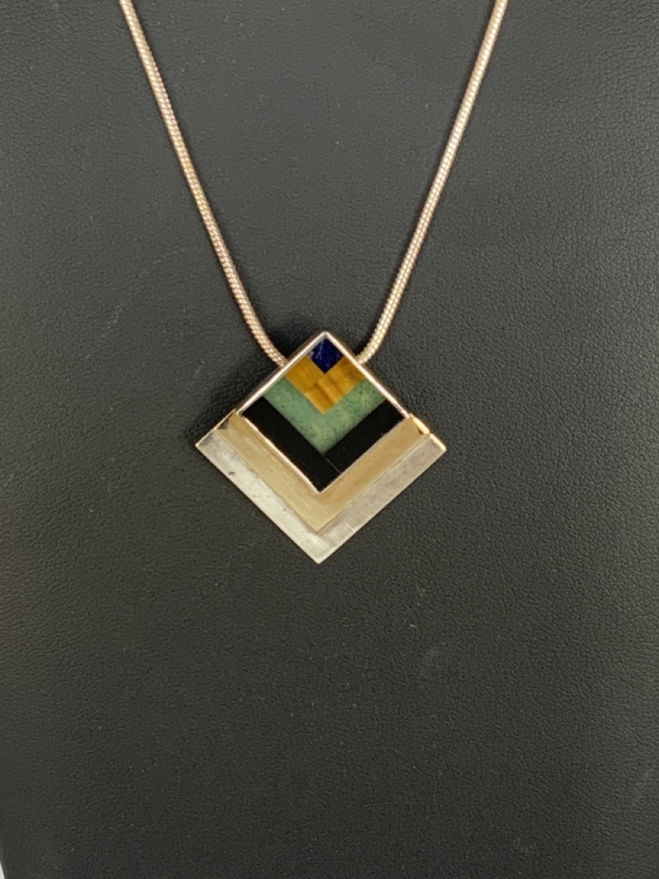 M&J Savitt sterling silver and 14k gold malachite, lapis, cat's eye and onyx pendent necklace in a 1980's pyramid design.