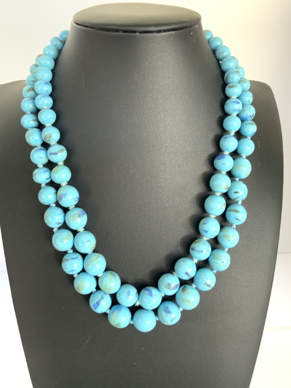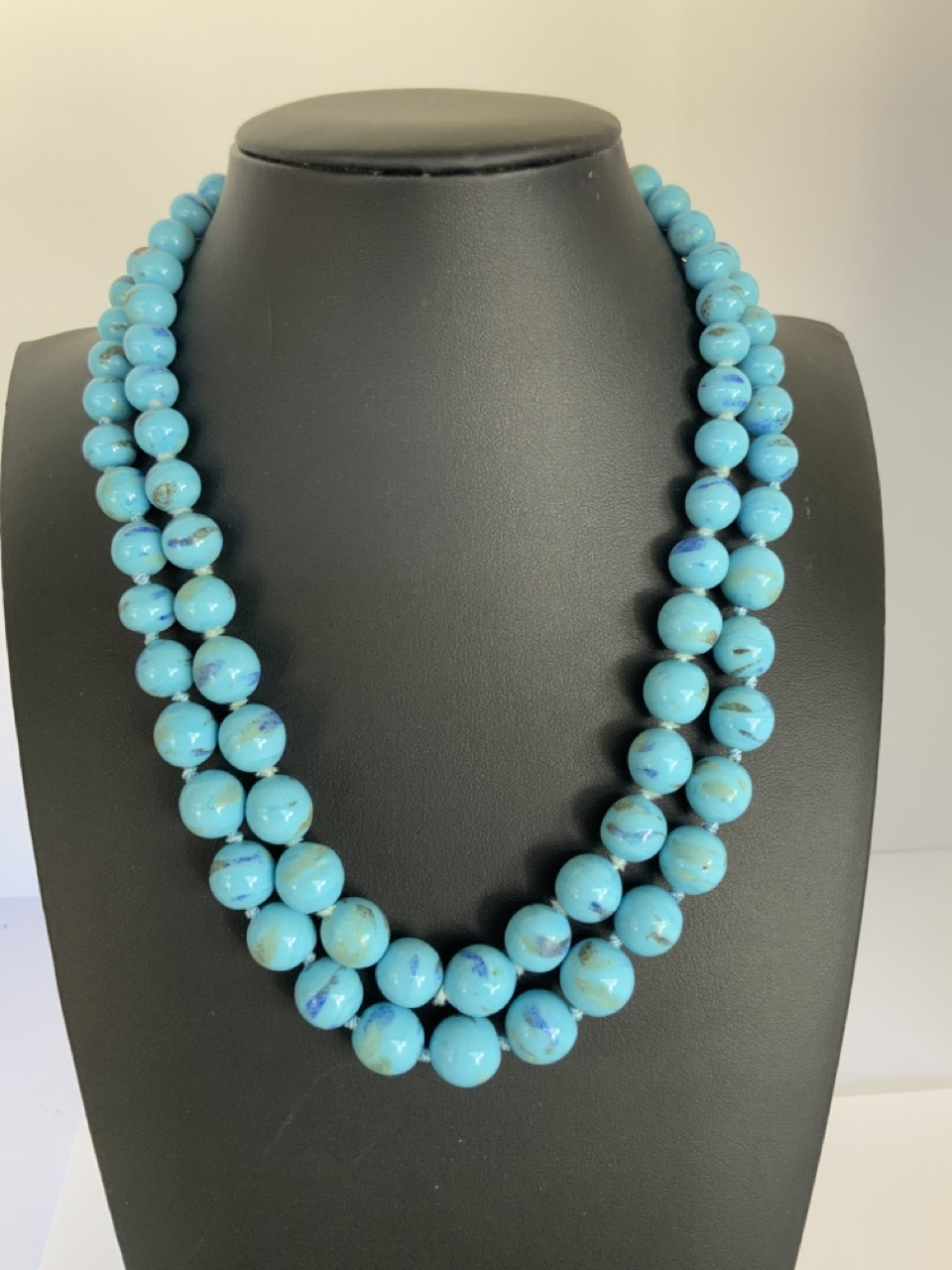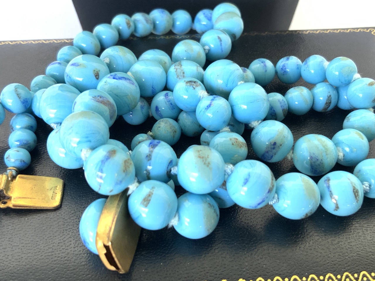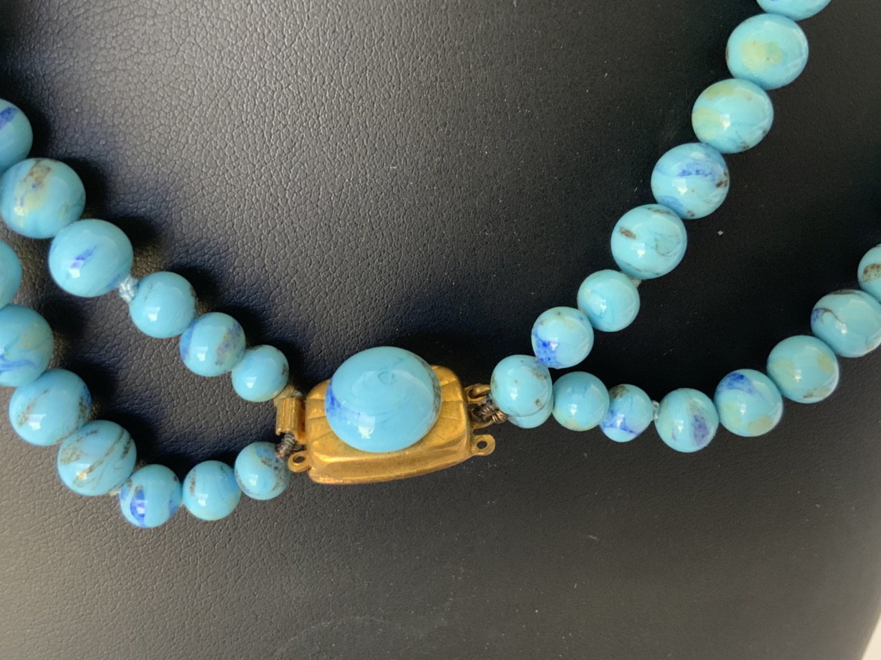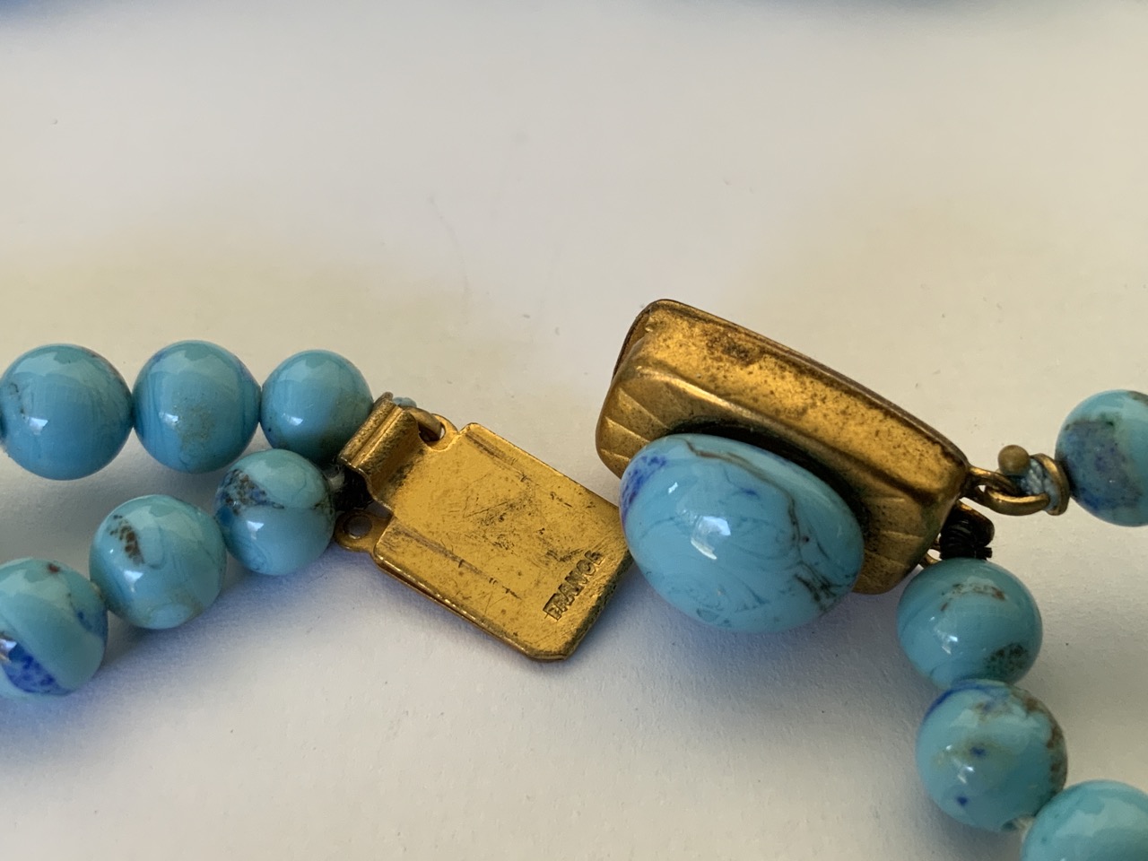 A vintage blue glass double strand necklace. Marked France on clasp.