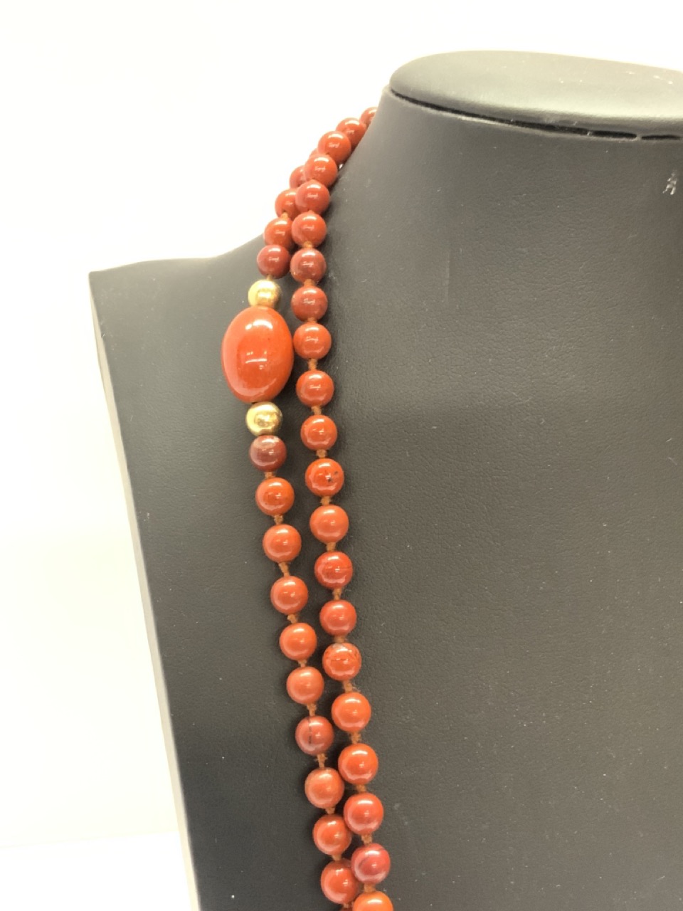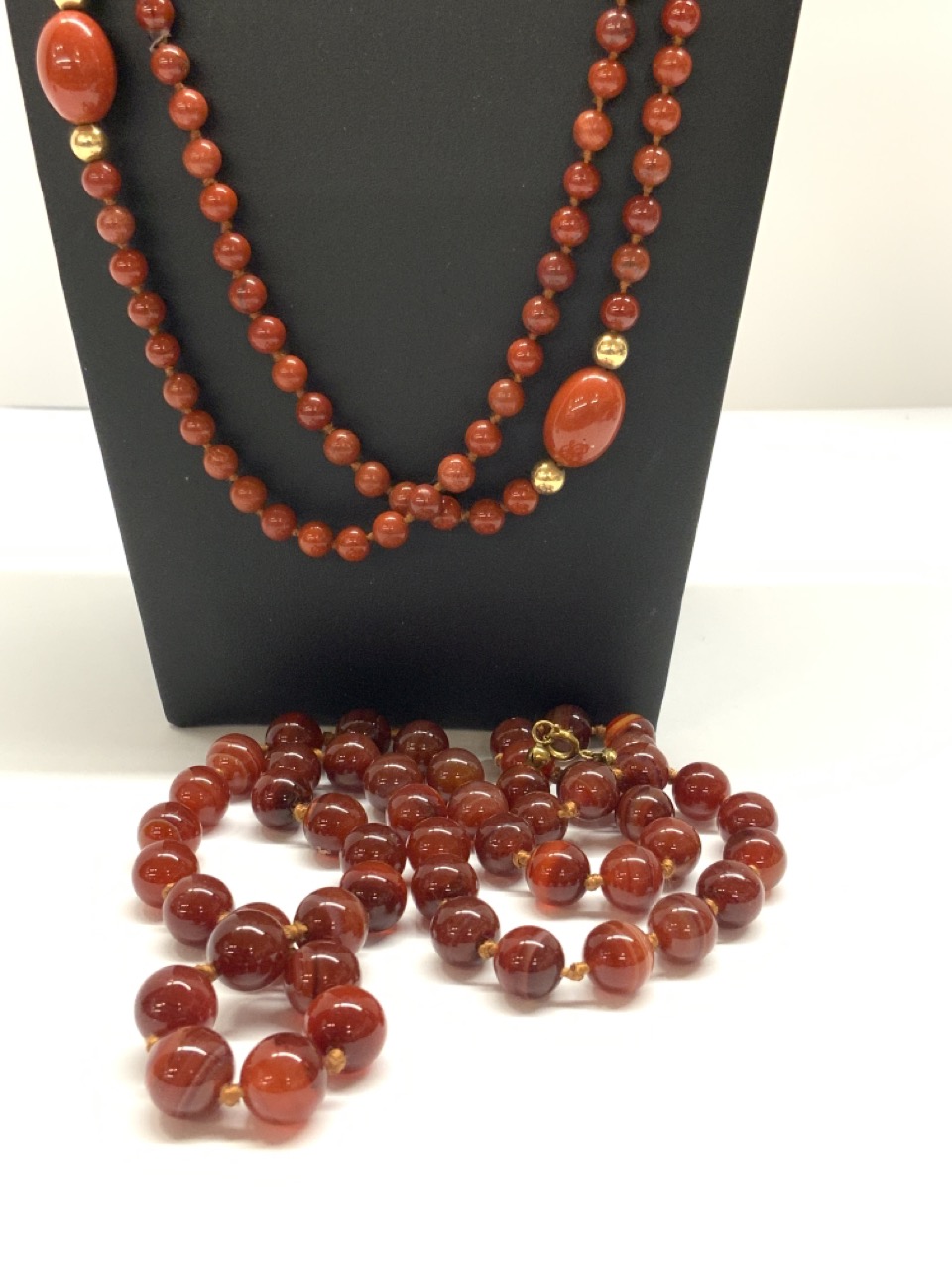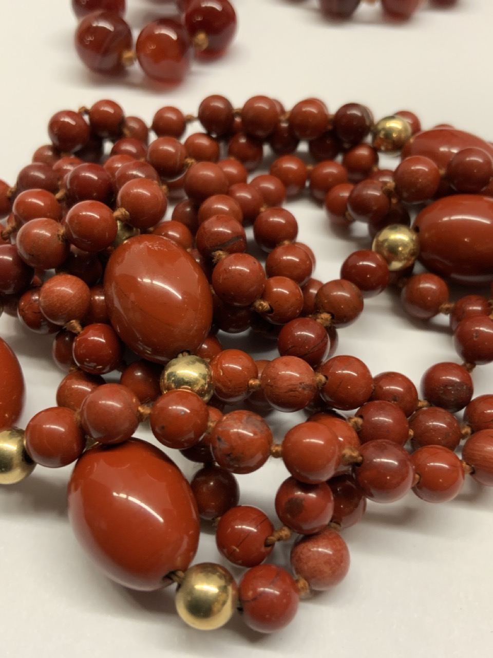 Fine agate strung beads and carnelian beads with 14k gold ball spacers.