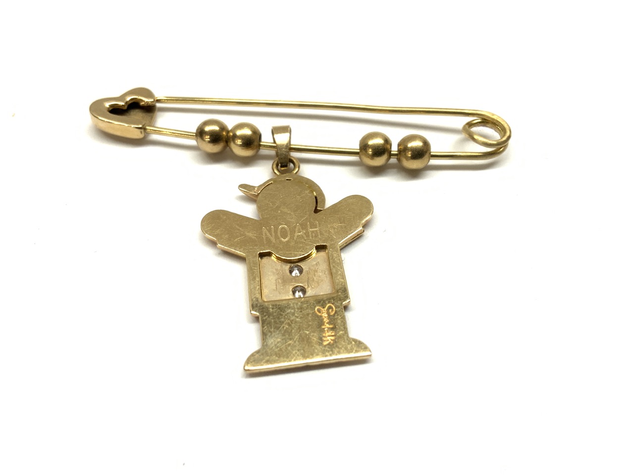 A 14k boy with baseball cap charm pendant with diamond slid on a 14k yellow gold safety pin.