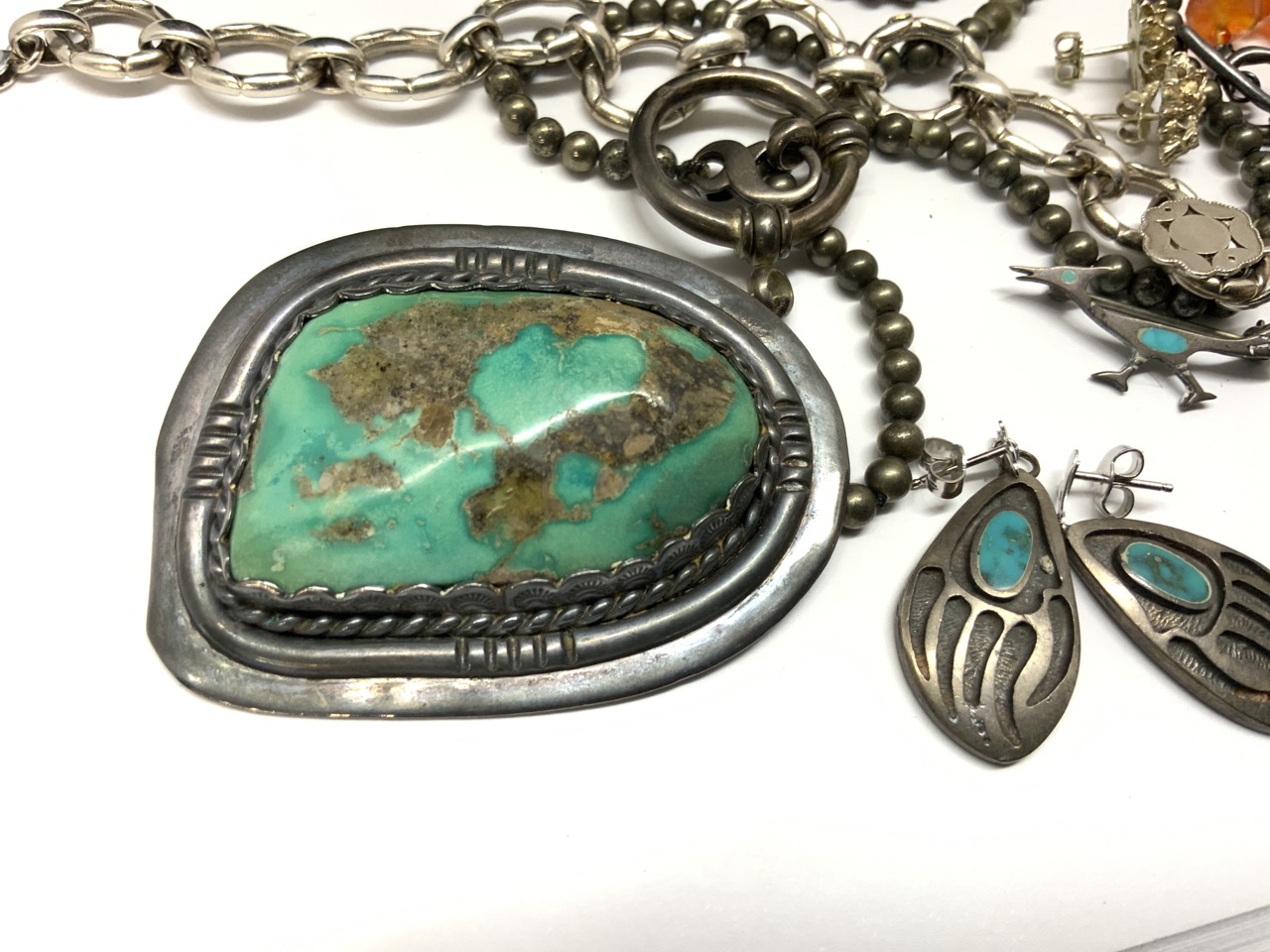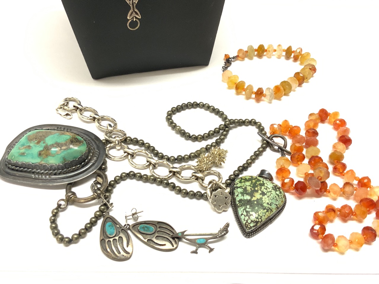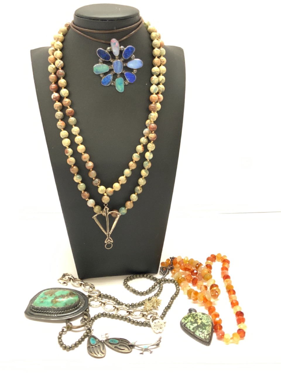 Compiled estate jewelry. Sterling silver large turquoise brooch 2” x 2 3/4” , Fire Opal sterling pendant necklace 2” Diameter, Sterling & 18k gold bracelet, Bear claw earrings, “Open Heart Warrior” stone necklace, Agate necklace and bracelet with sterling etc.