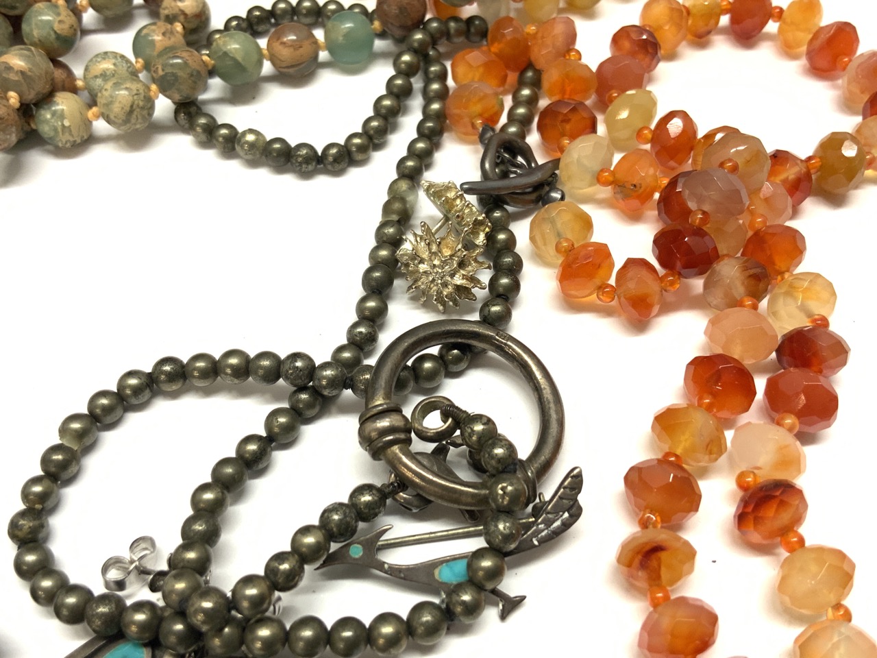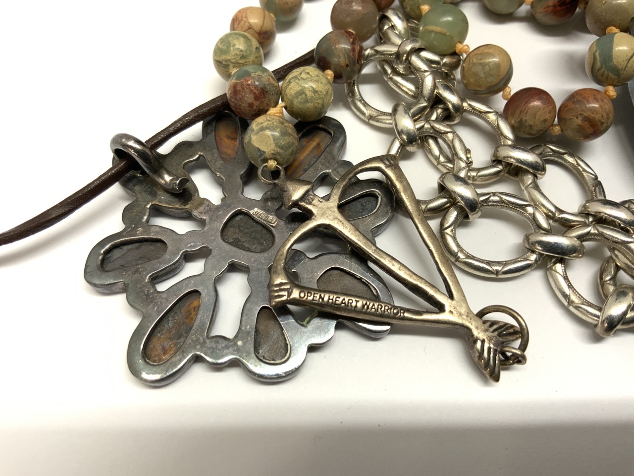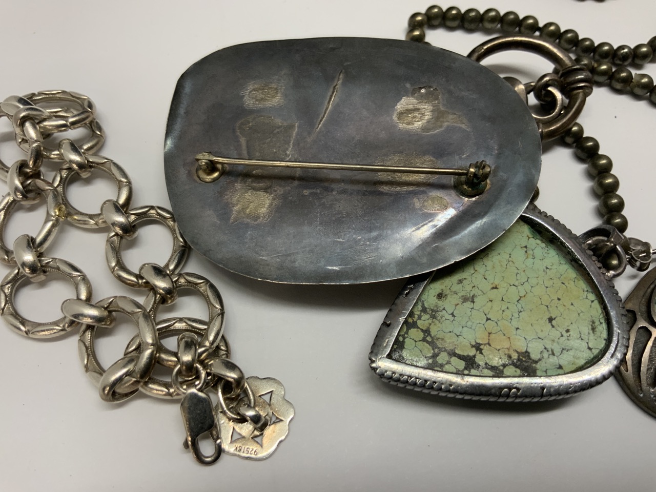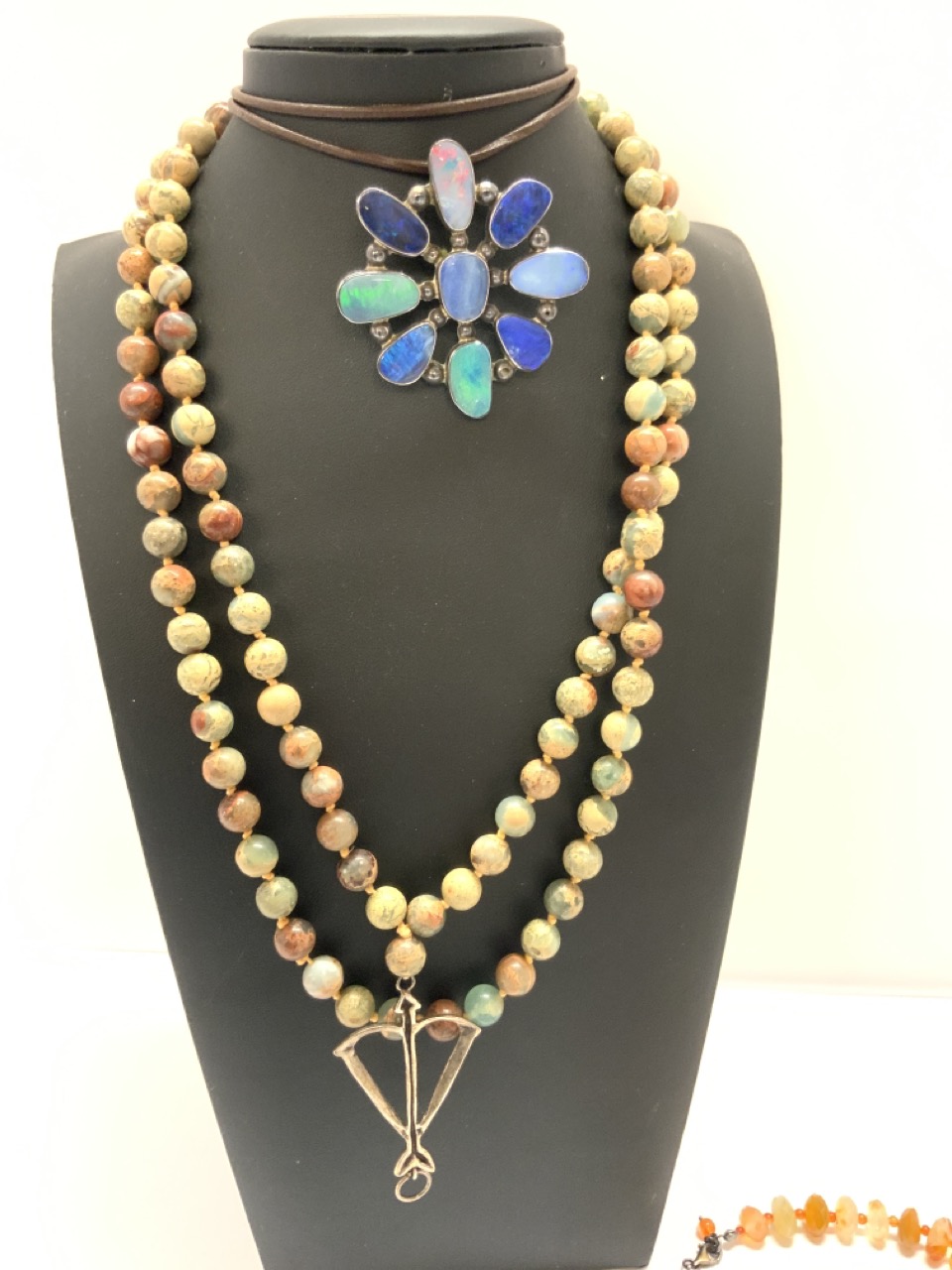 Compiled estate jewelry. Sterling silver large turquoise brooch 2” x 2 3/4” , Fire Opal sterling pendant necklace 2” Diameter, Sterling & 18k gold bracelet, Bear claw earrings, “Open Heart Warrior” stone necklace, Agate necklace and bracelet with sterling etc.