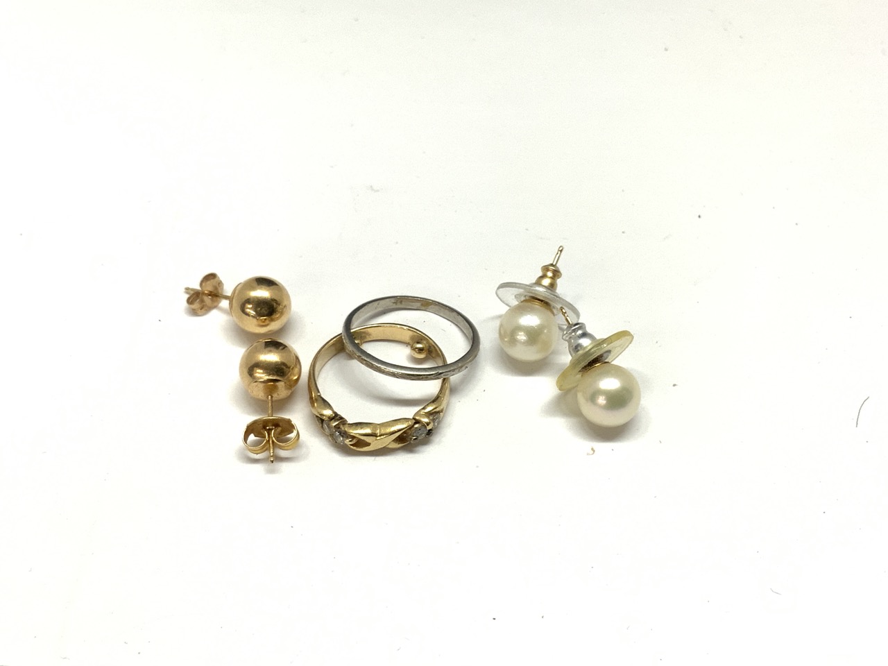Compiled estate jewelry. Size 3 14k gold diamond ring, platinum wedding band size 3, 14k ball earrings, 14k pearl earrings.