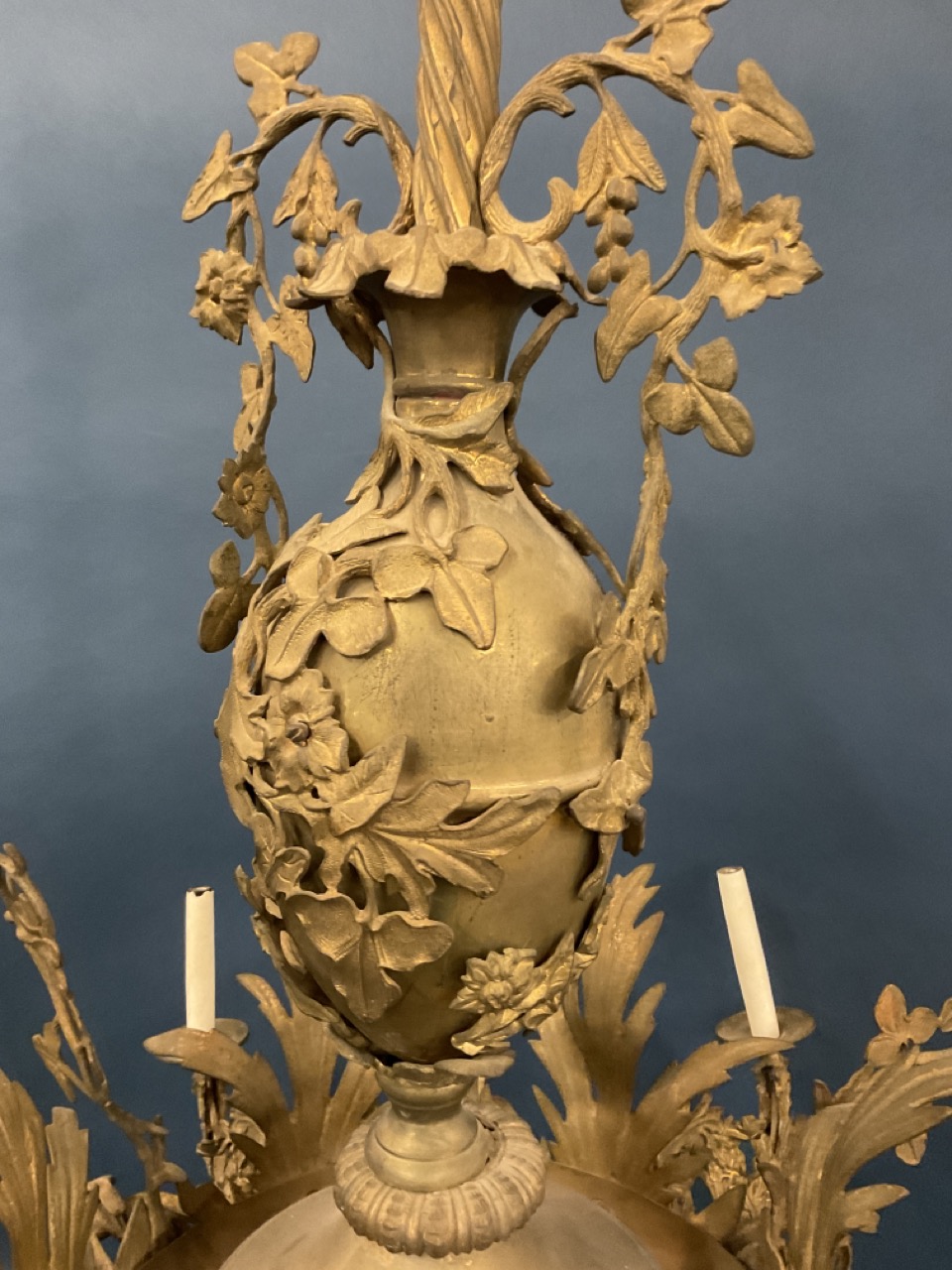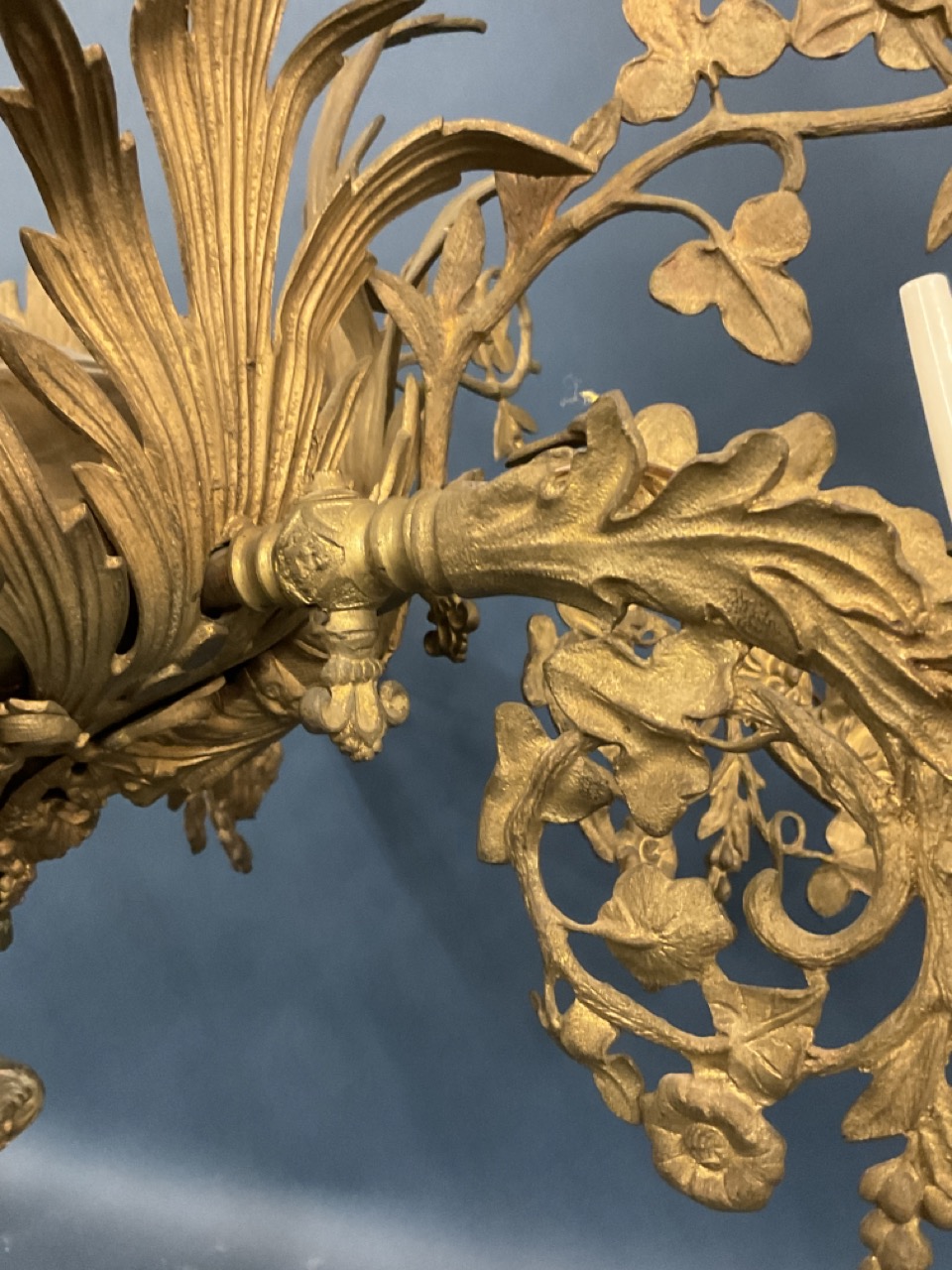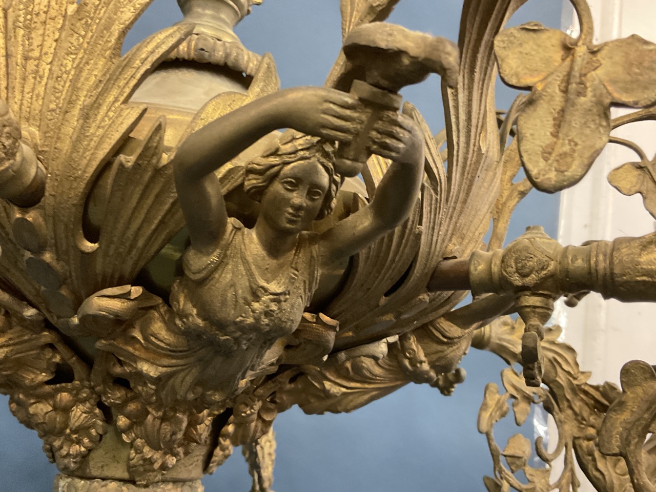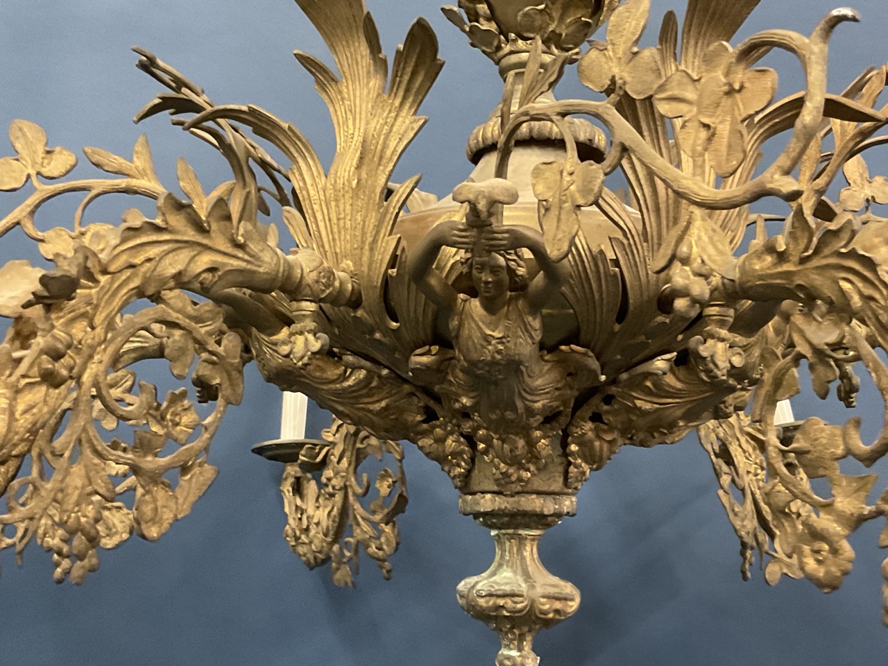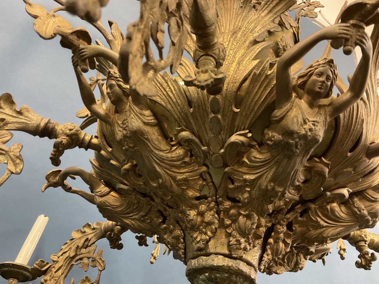 A fine pair of gilded brass or bronze chandeliers. Originally gas fixtures, late 19th century converted to electric. Six arm figure highly ornate design with foliage and figural full body females holding birds.