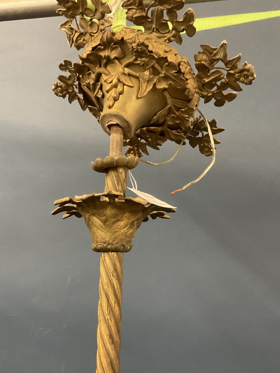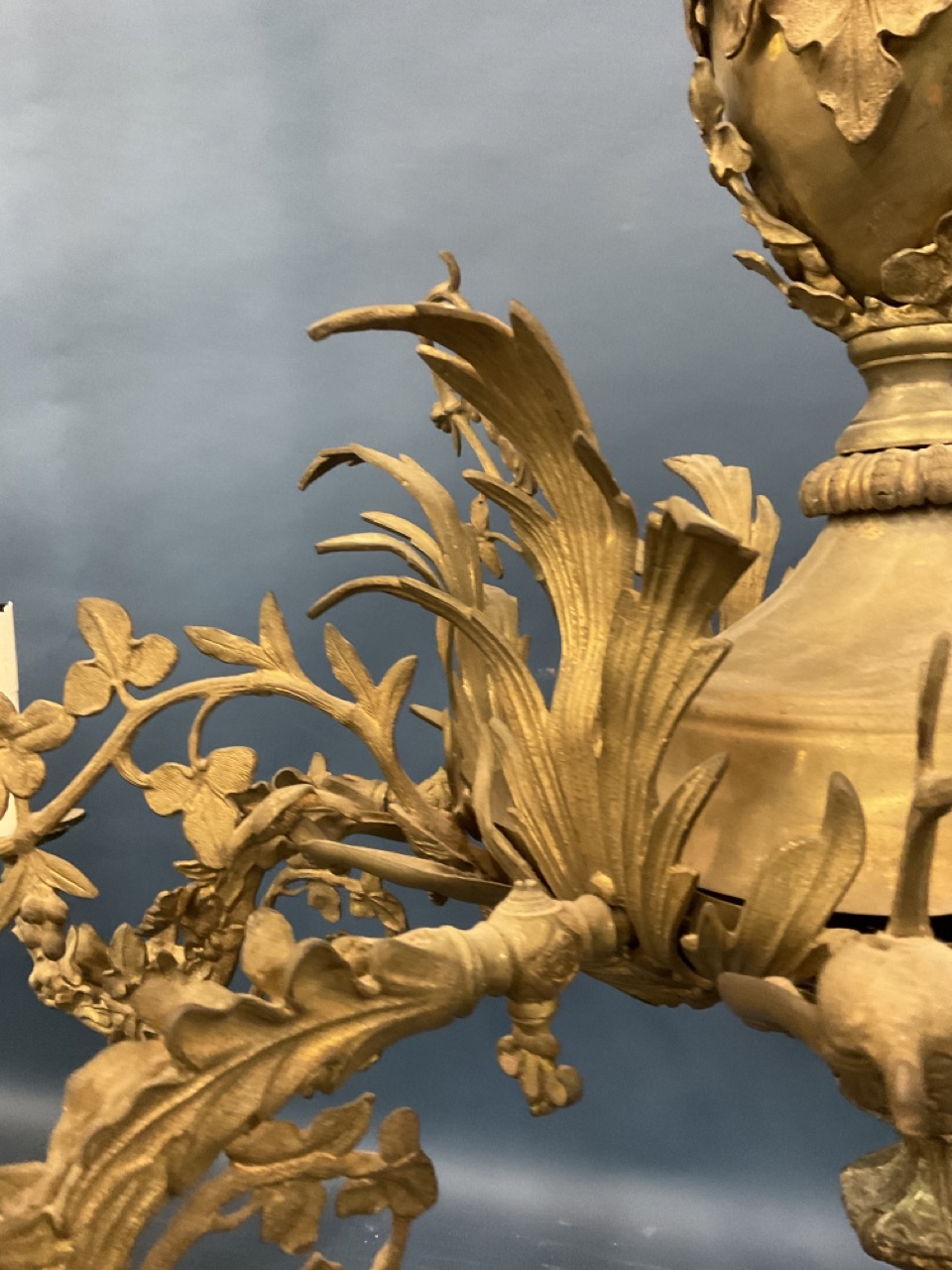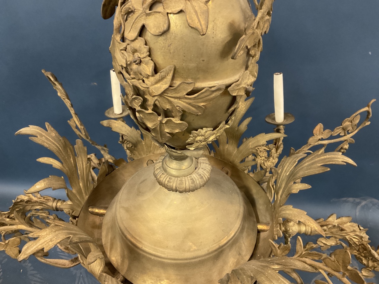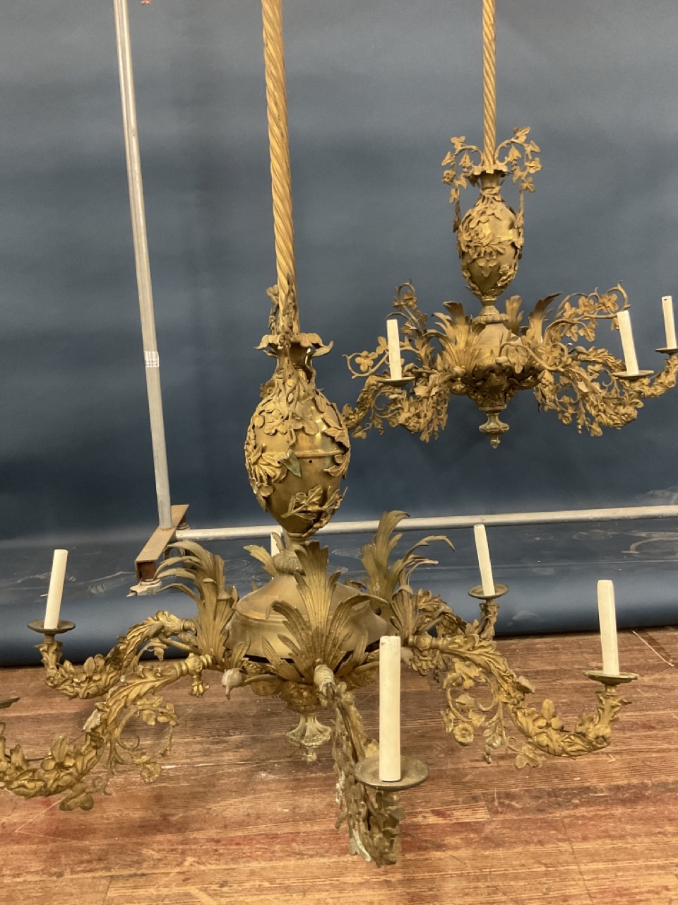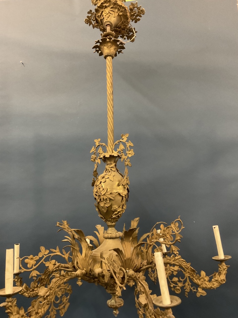 A fine pair of gilded brass or bronze chandeliers. Originally gas fixtures, late 19th century converted to electric. Six arm figure highly ornate design with foliage and figural full body females holding birds.