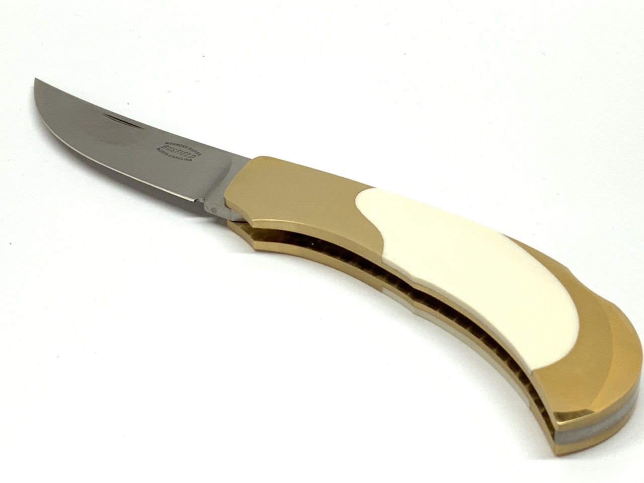 Jack Busfield Rearlock Trailing Point Blade Knife. Custom with 18k solid gold handled and bone inlay. Documented c.2003