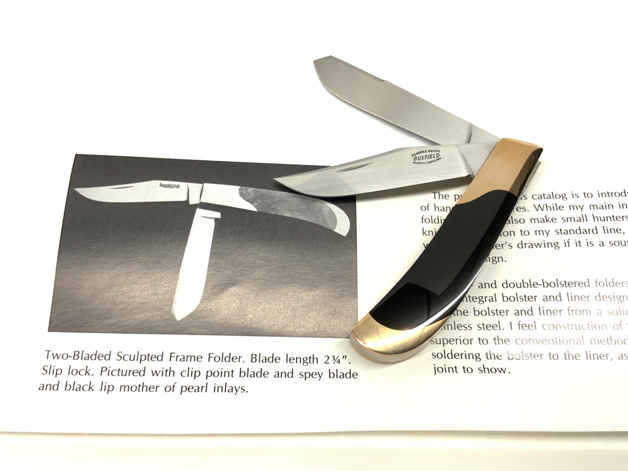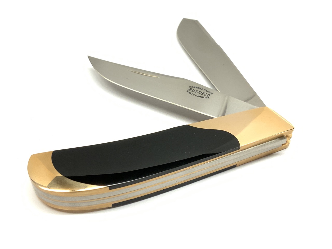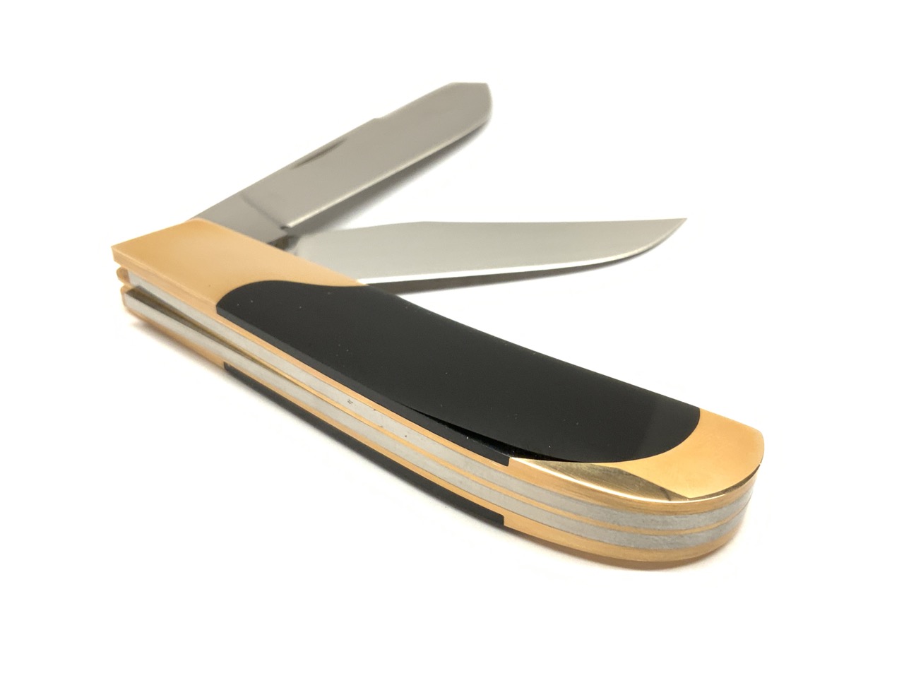 Two-Bladed sculpted frame folder. Blade length 2 3/4”. Slip lock. Clip lint and Spey blade with onyx inlay and 18K solid yellow gold handle with black onyx.