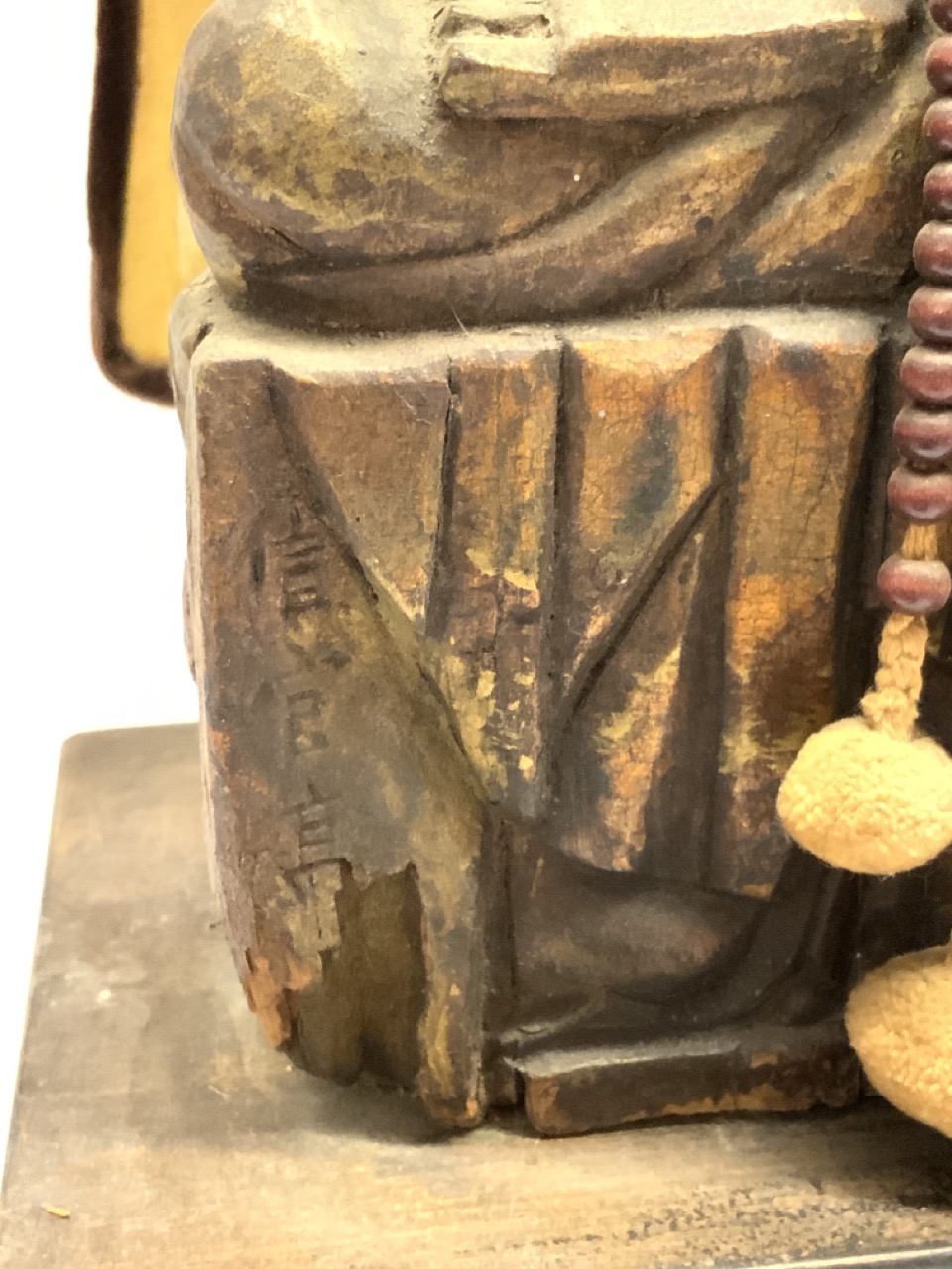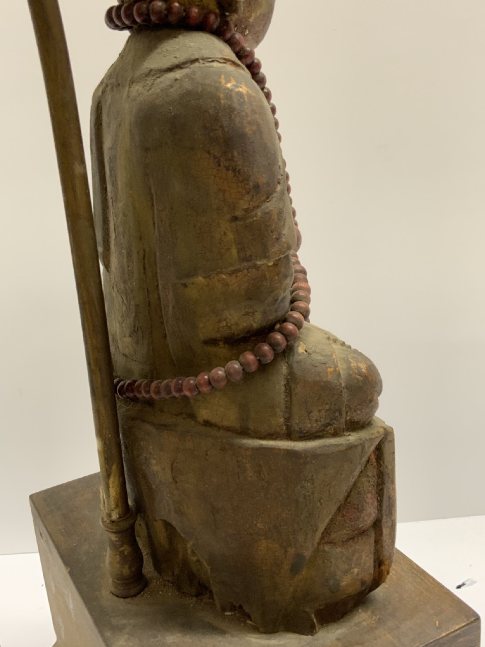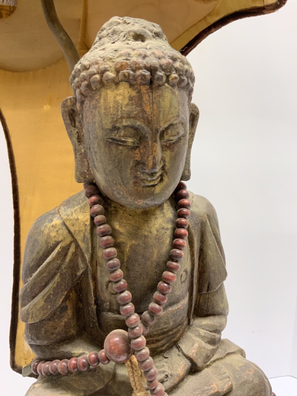 An early carved wood Buddha statue mounted on base and shownn as a lamp. Chinese chop marks seen on front side of Buddha. Please see photograph preview or call.