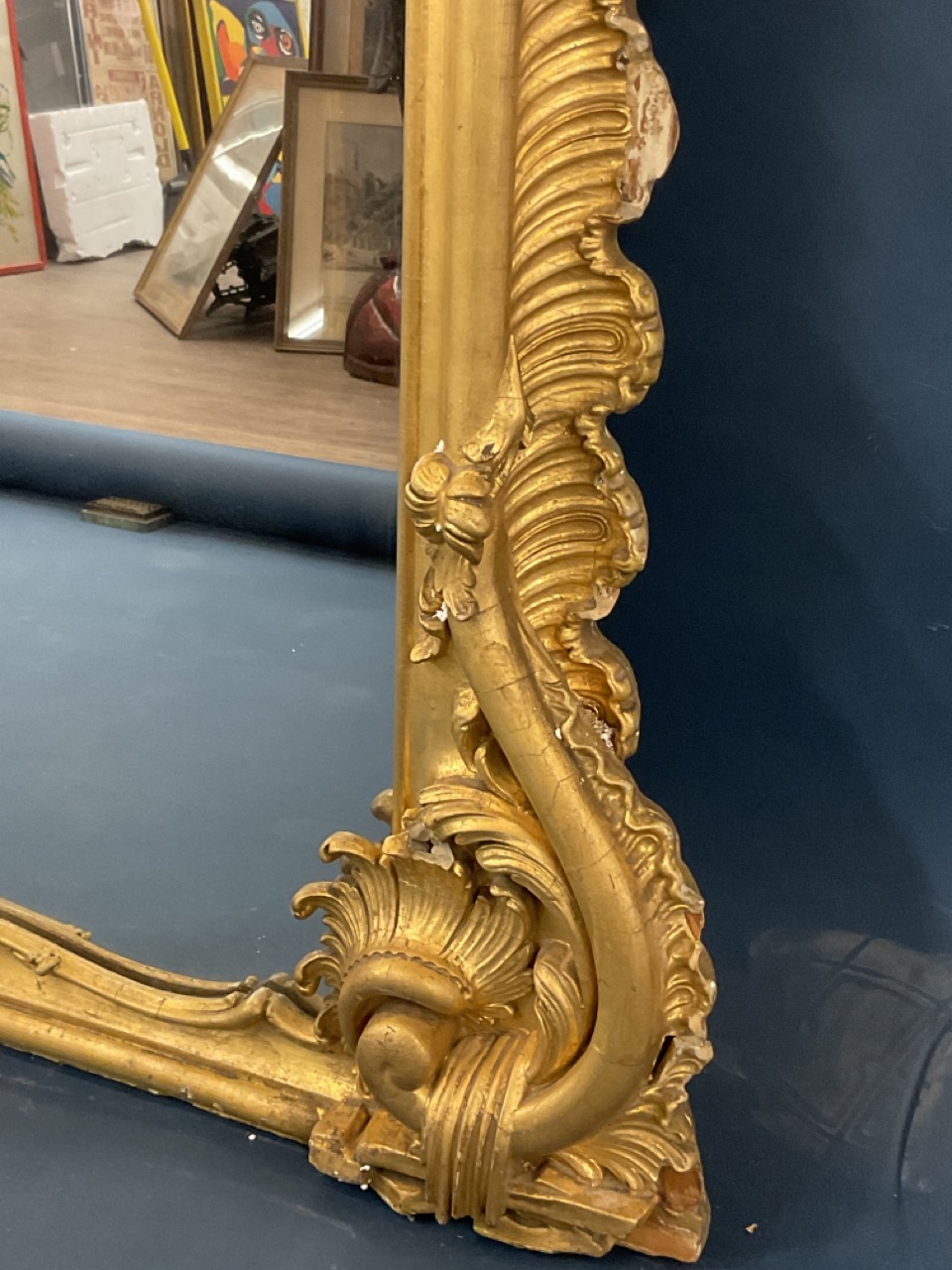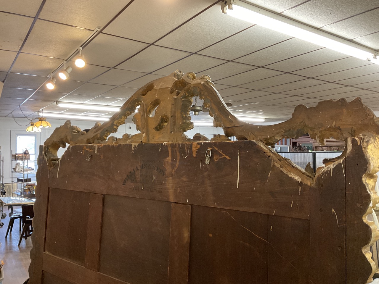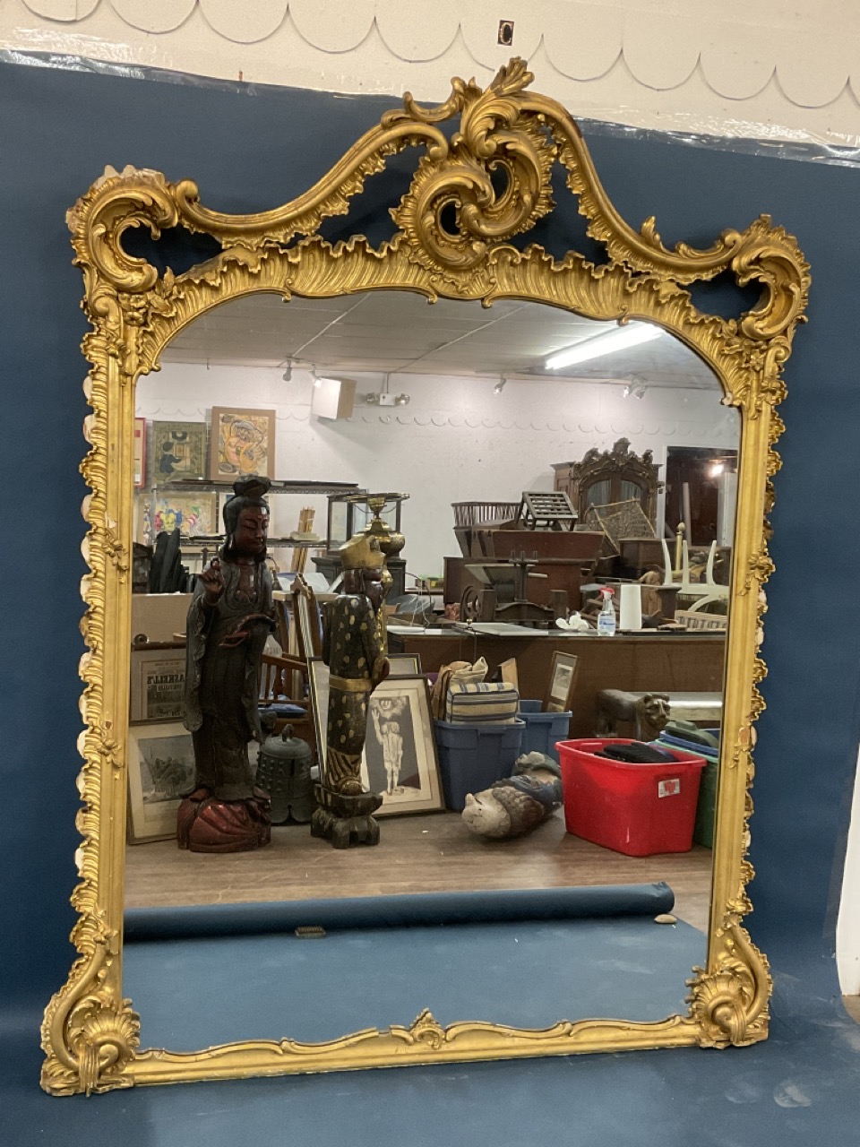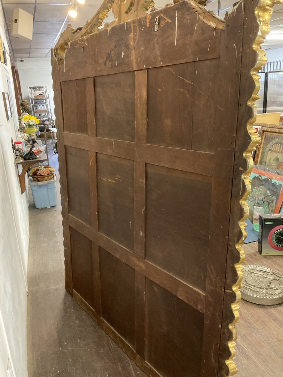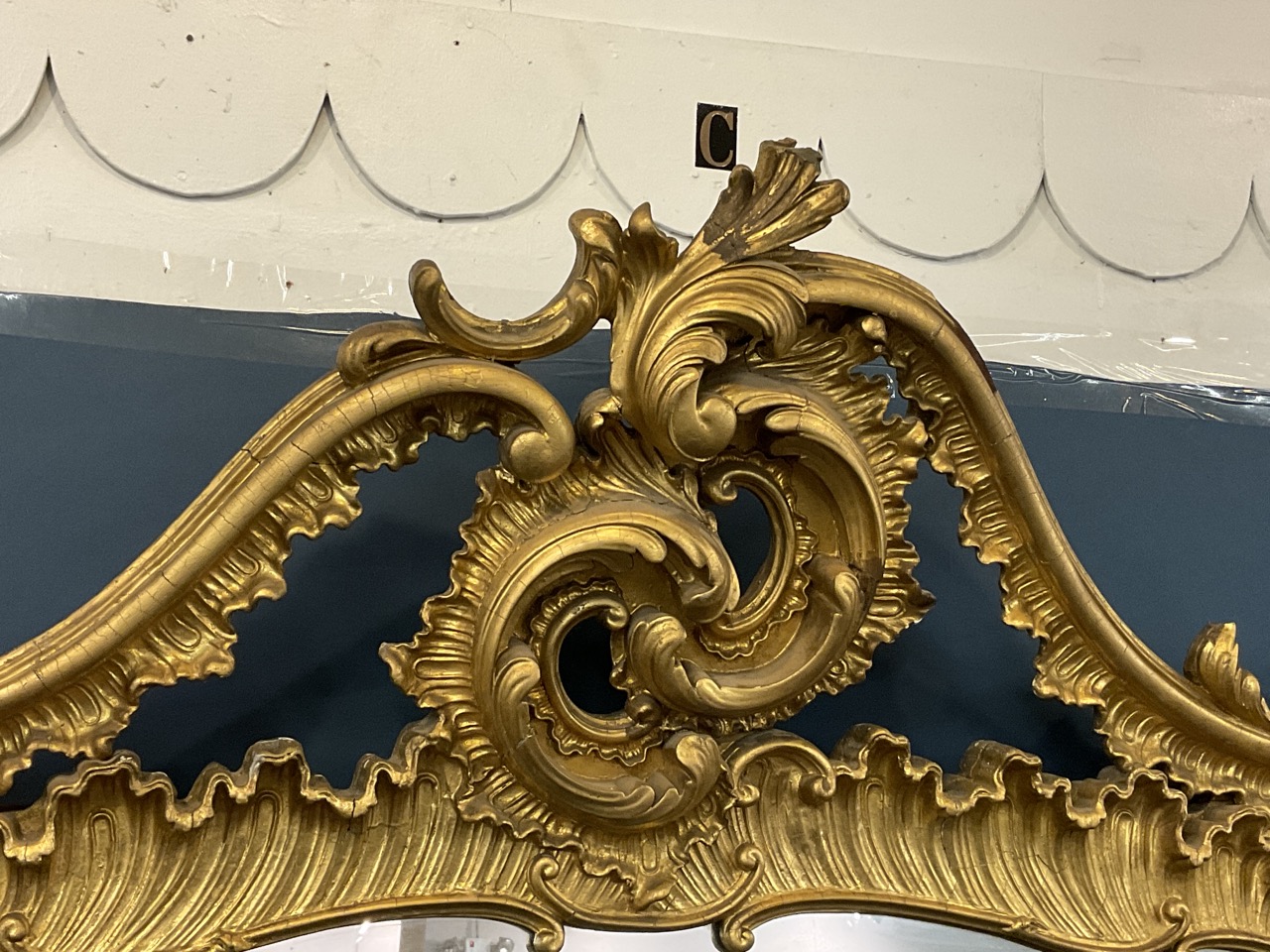 19th c. Monumental size Victorian period gilt wood mirror with scroll crest and foliage. Previously installed over mantel.