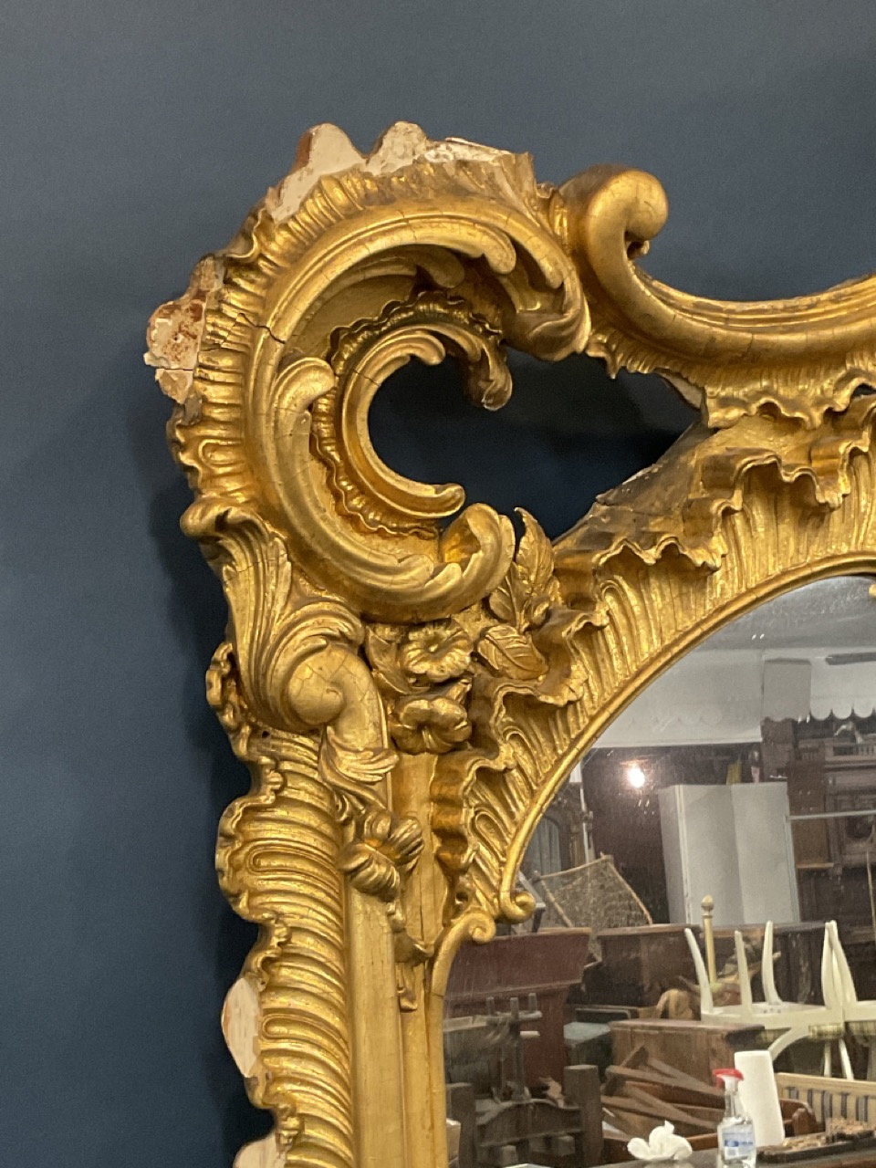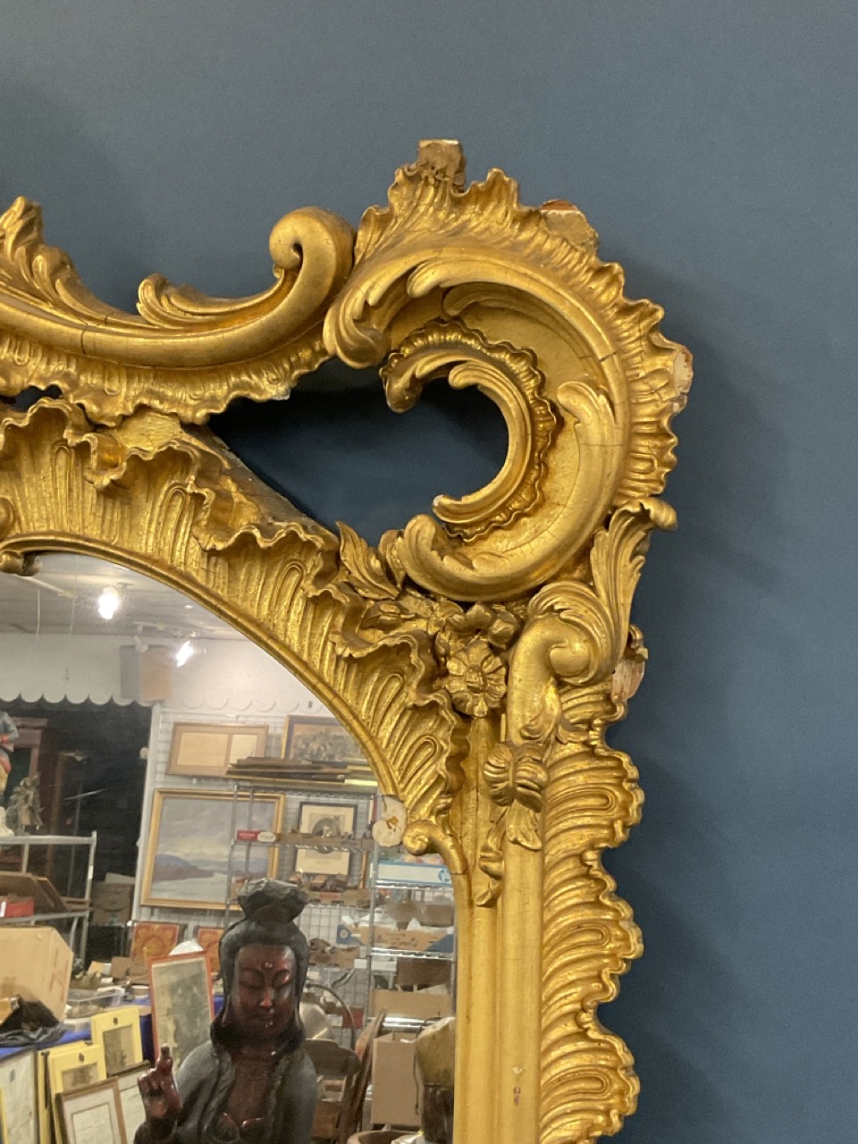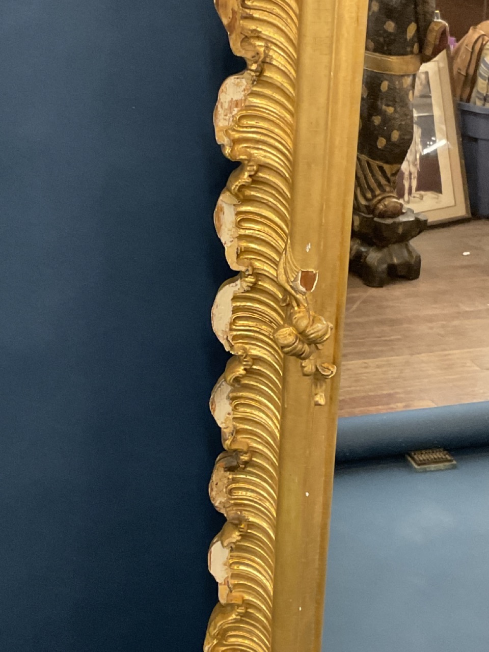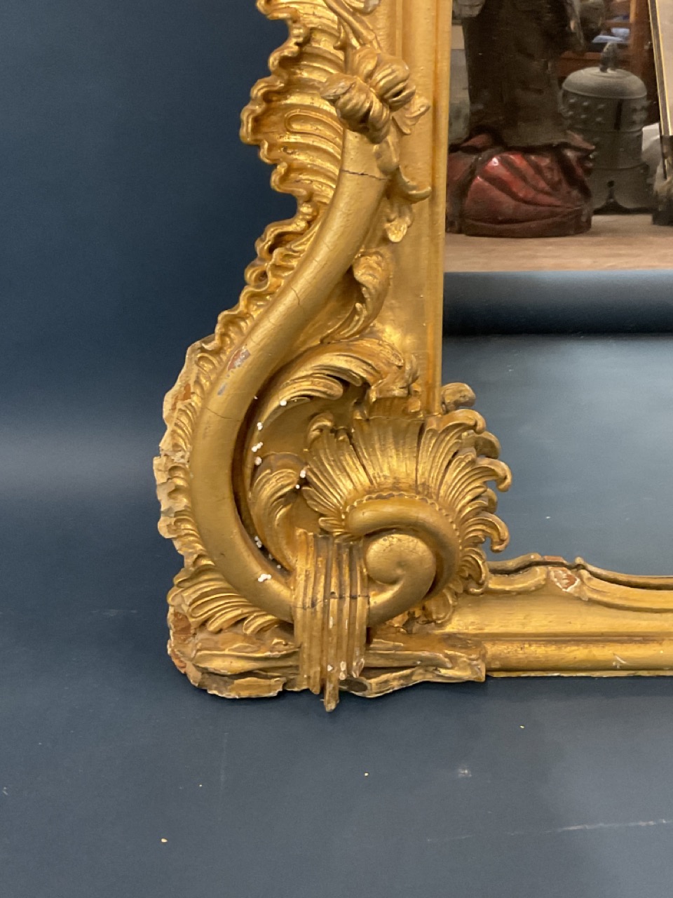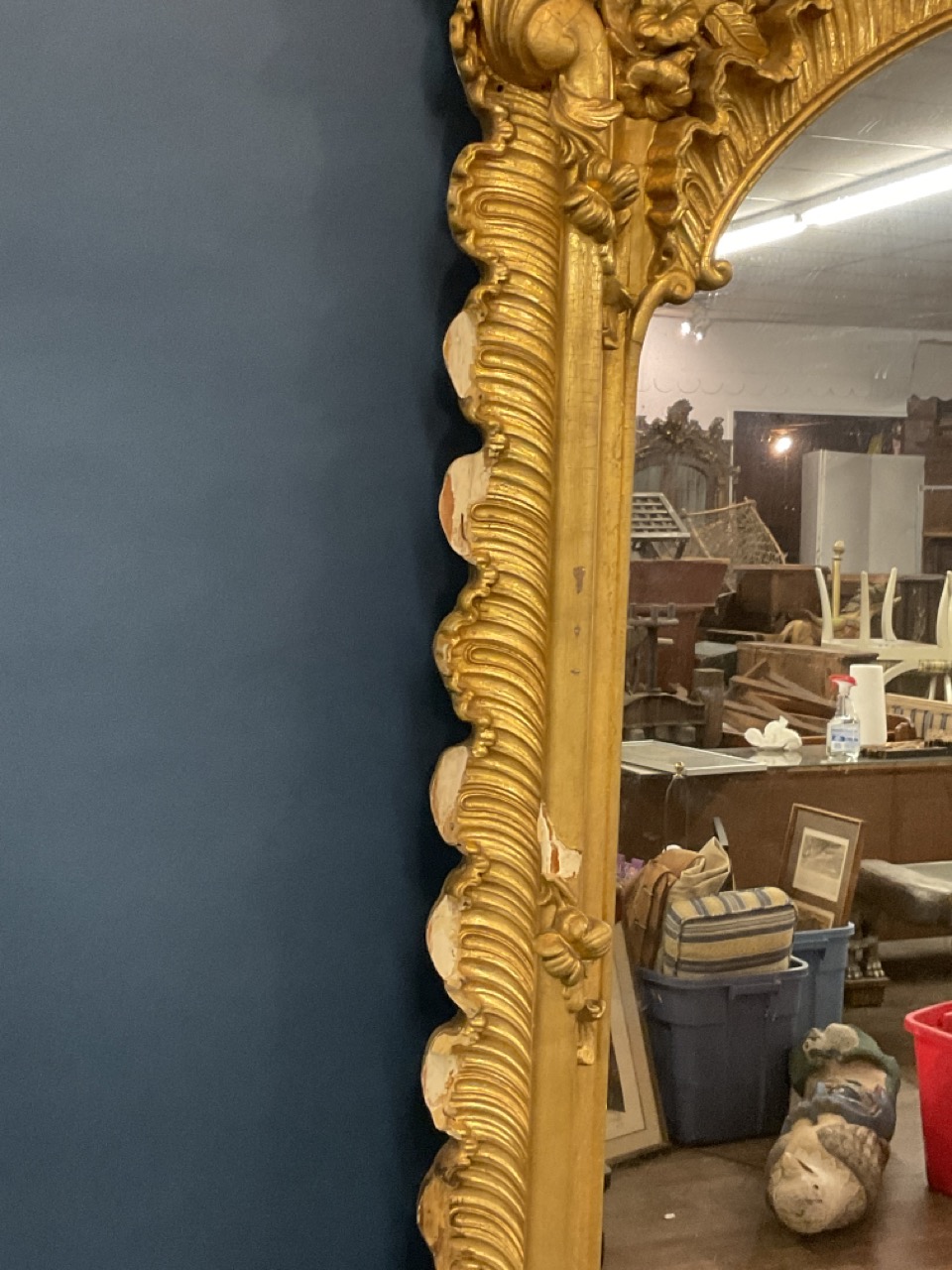 19th c. Monumental size Victorian period gilt wood mirror with scroll crest and foliage. Previously installed over mantel.