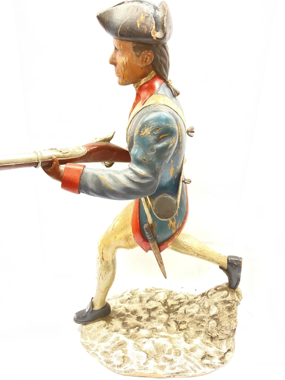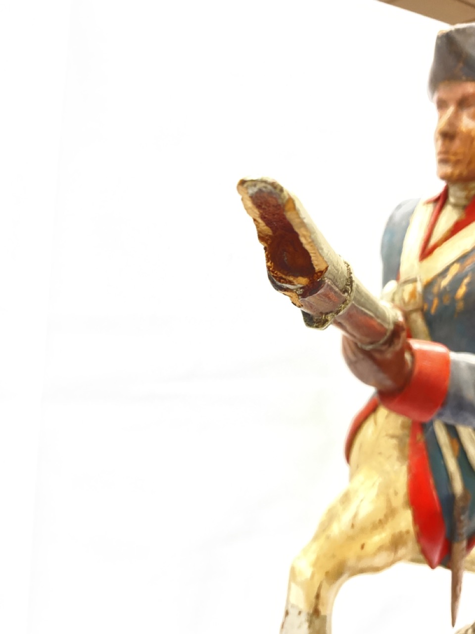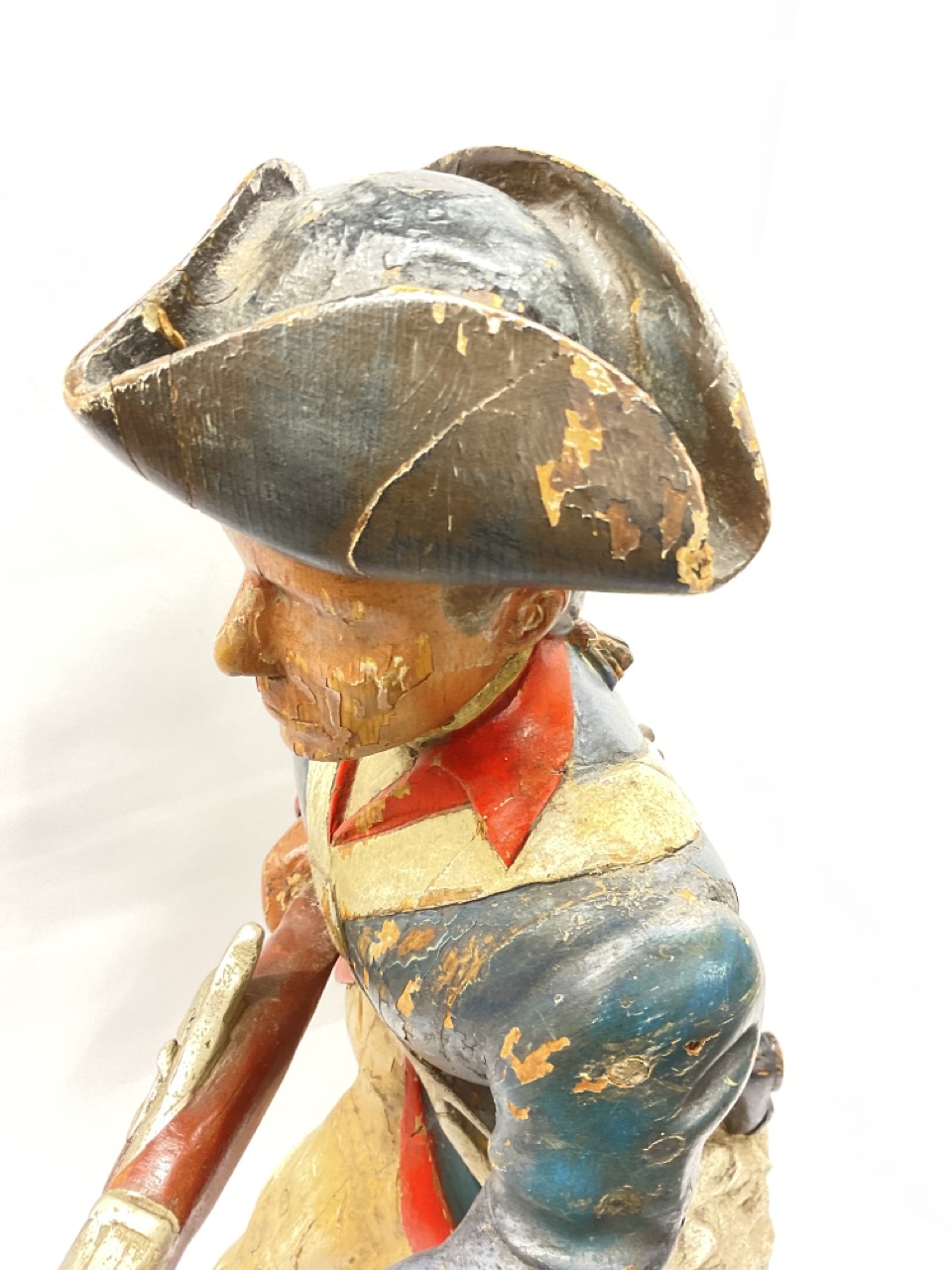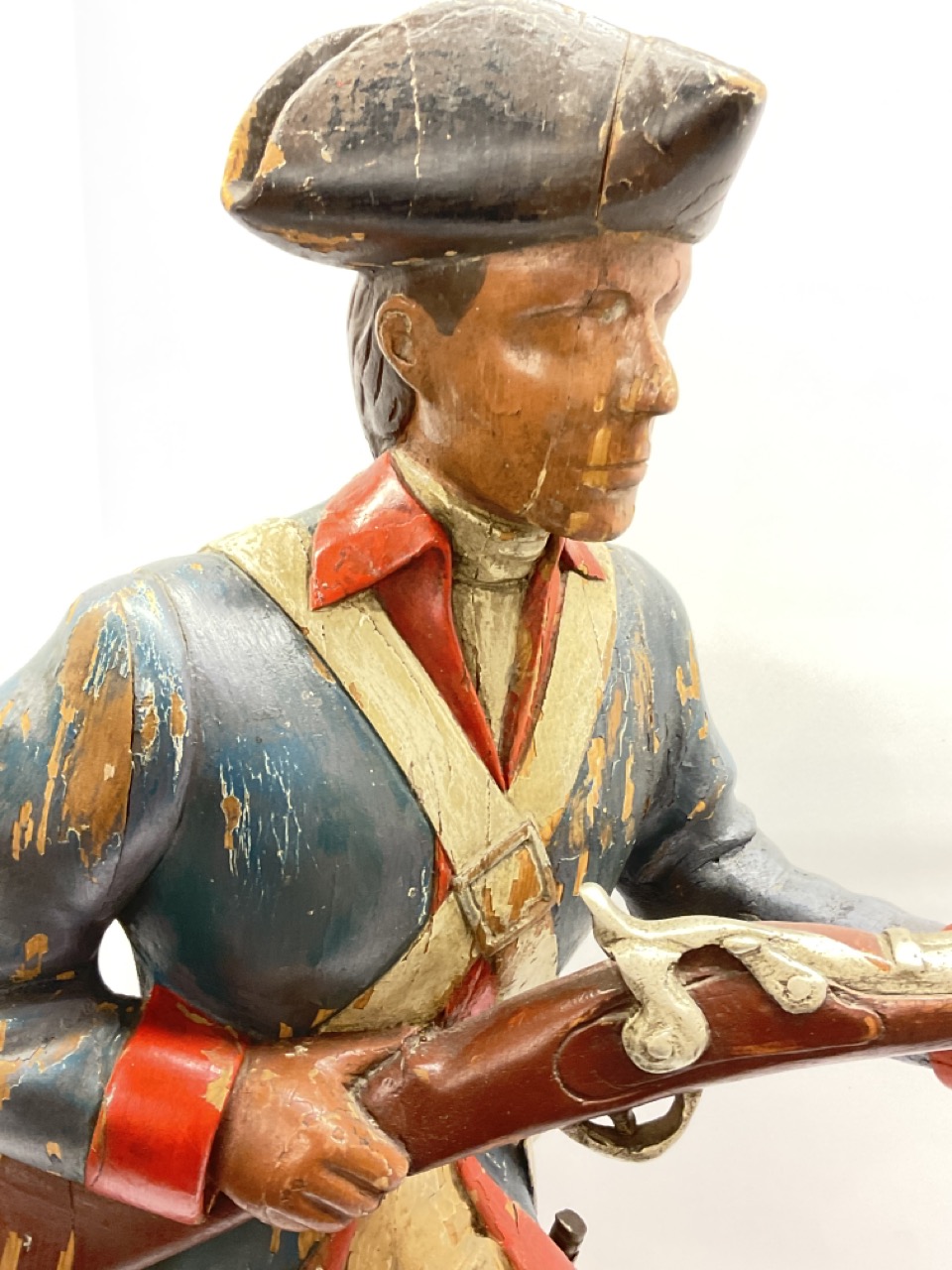 19th c. Americana wood sculpture depicting a Revolutionary War "Minutemen" A receipt from 1973 showing expert restoration done. A new arm and base were made. The tip of gun is chipped off. Please see photograph preview.