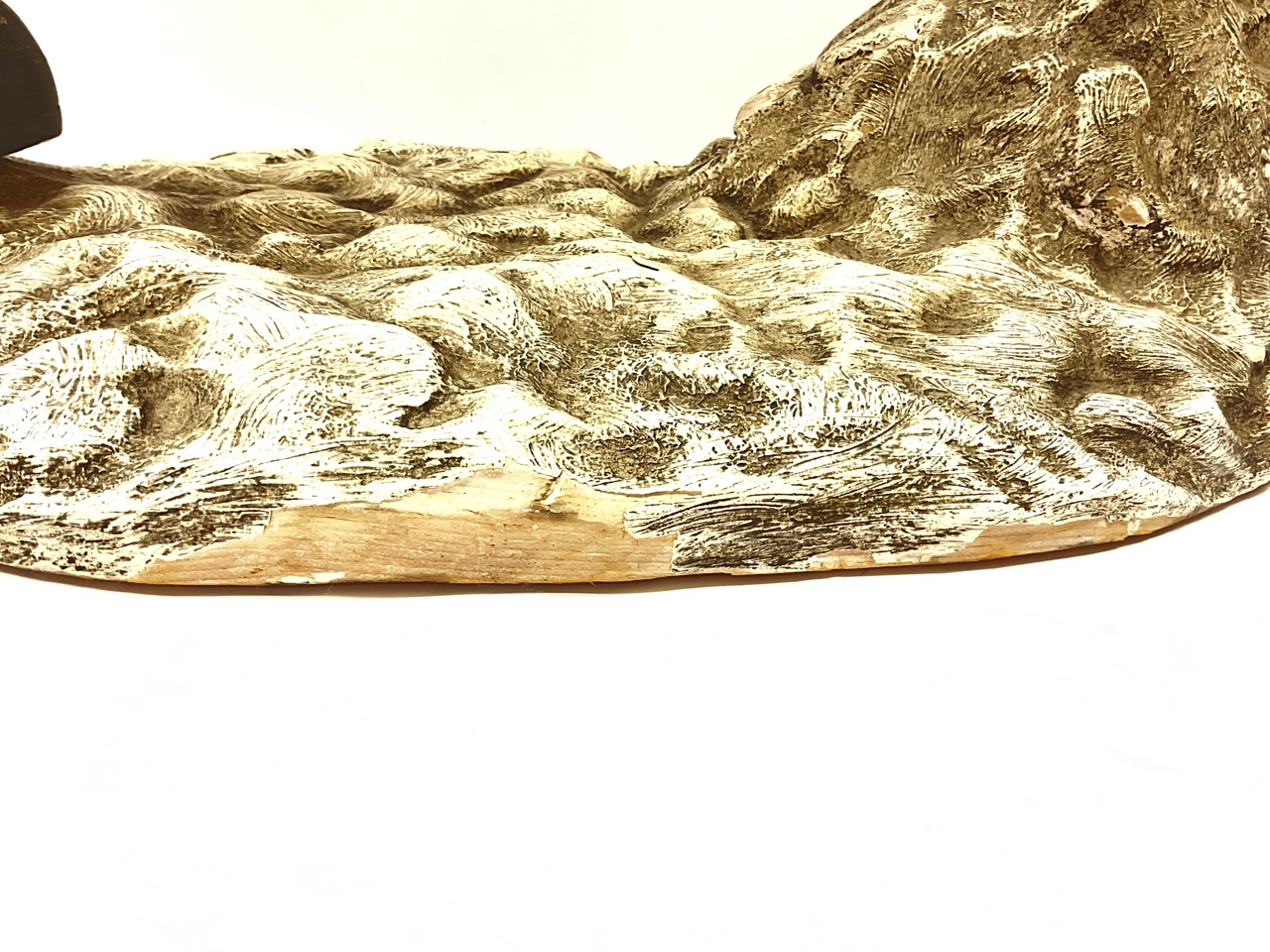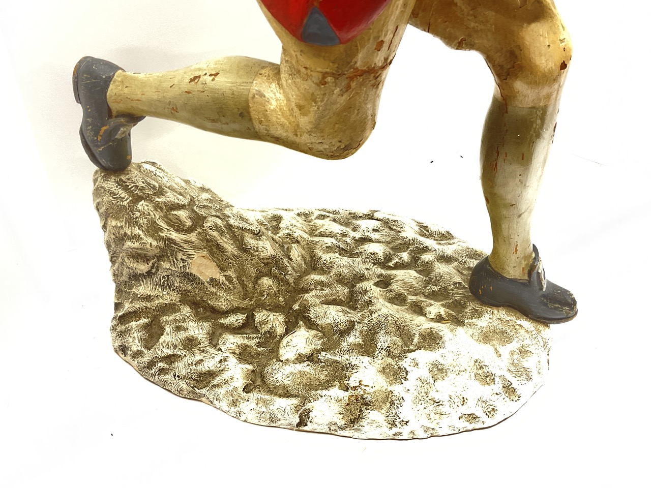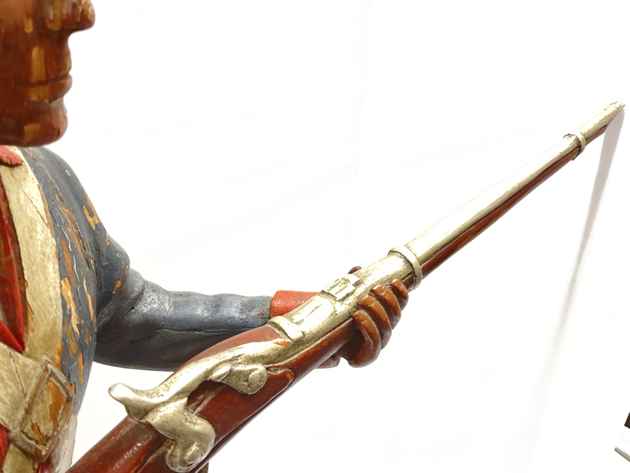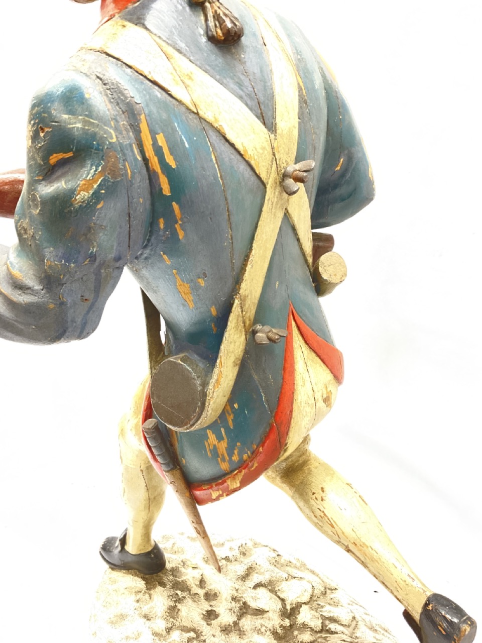 19th c. Americana wood sculpture depicting a Revolutionary War "Minutemen" A receipt from 1973 showing expert restoration done. A new arm and base were made. The tip of gun is chipped off. Please see photograph preview.