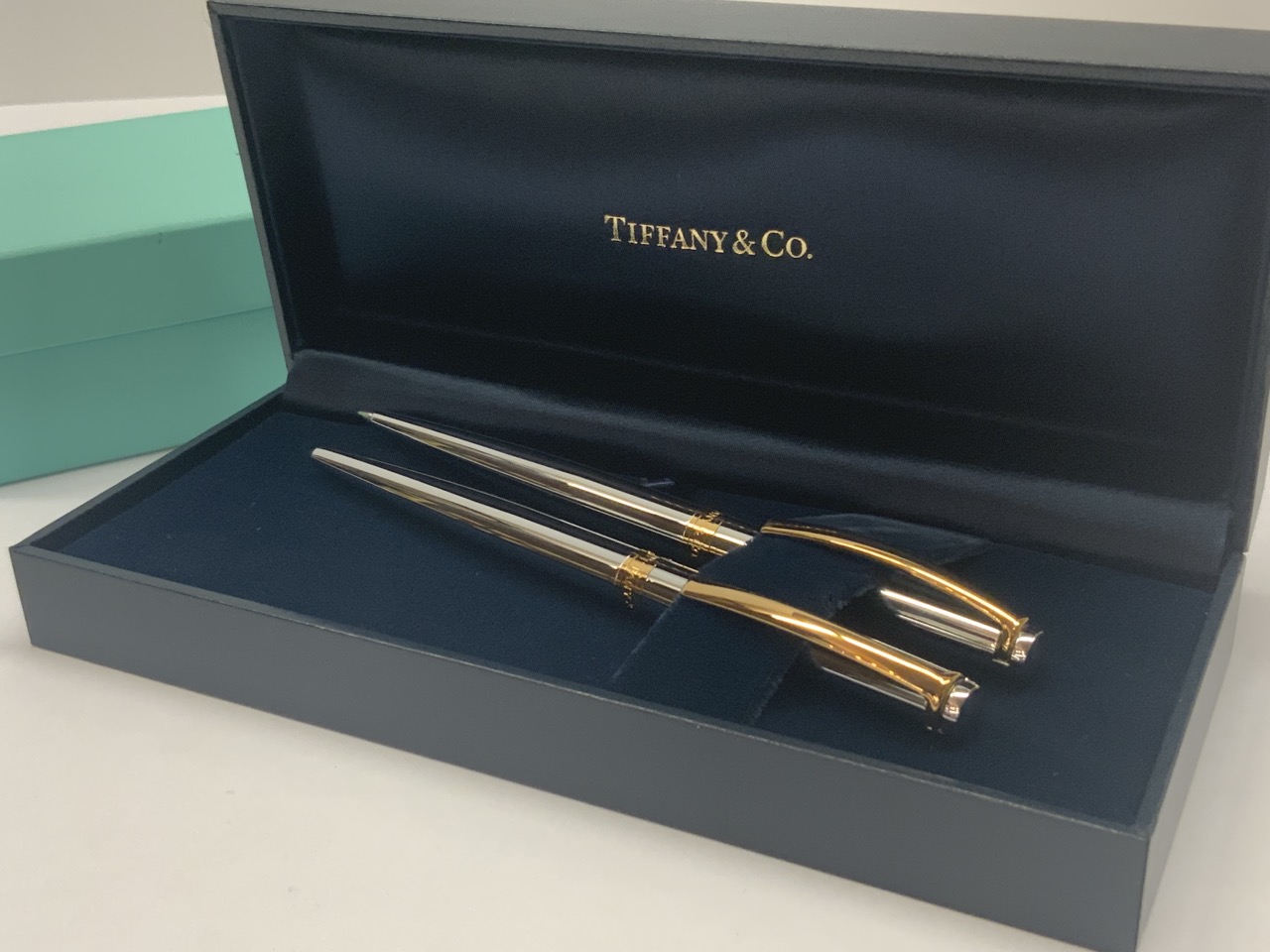 Two (2) piece Tiffany & Company pen set. Blue and black ink pens. Working order. Housed in presentation case and box.