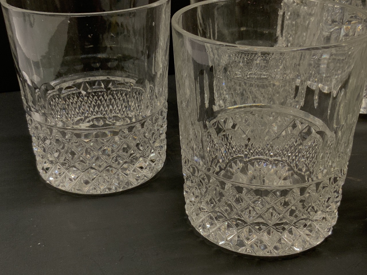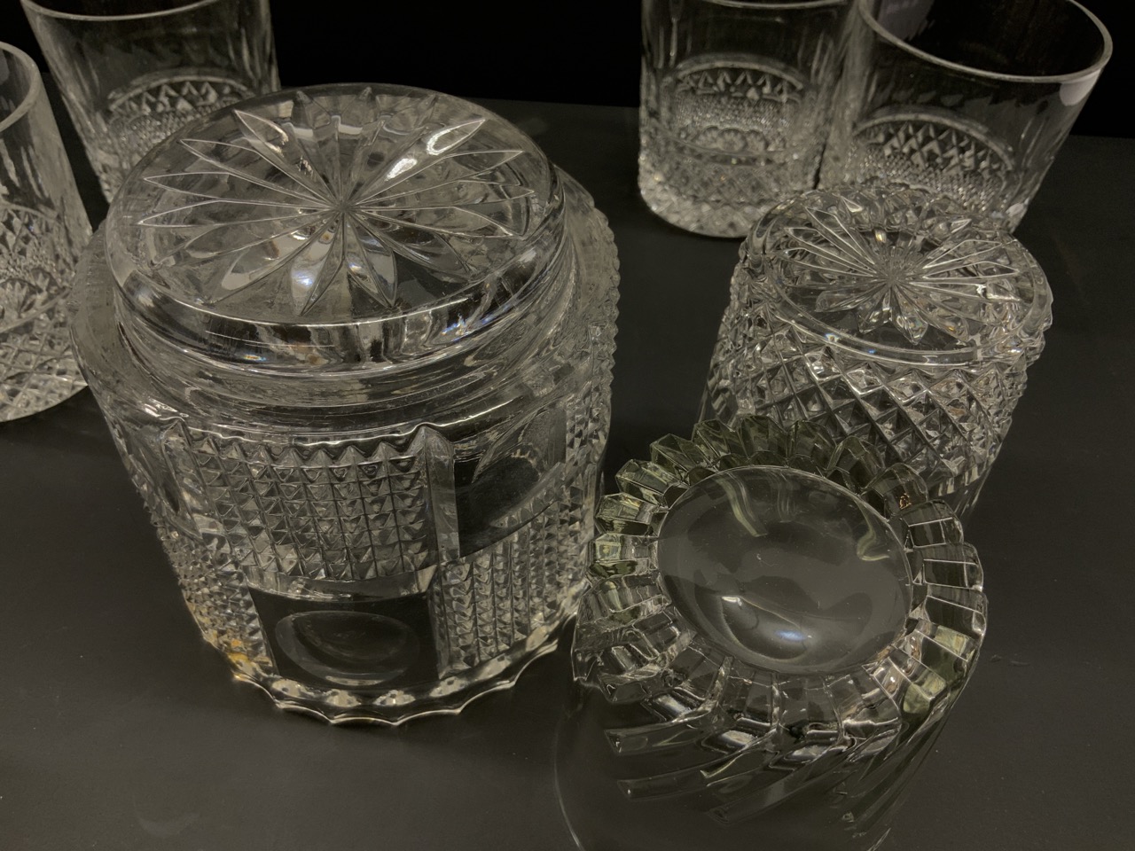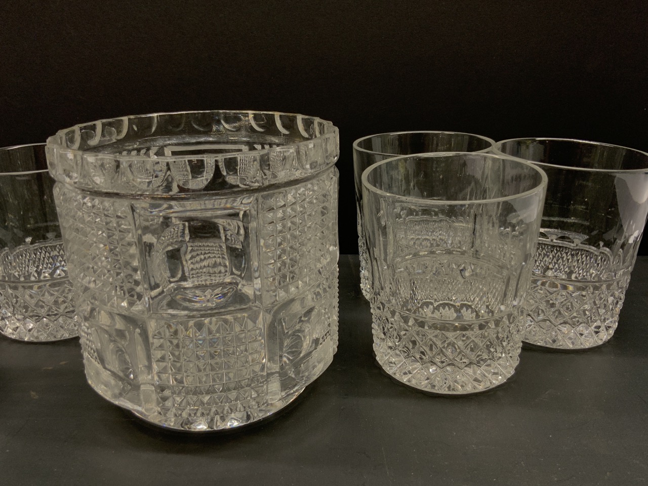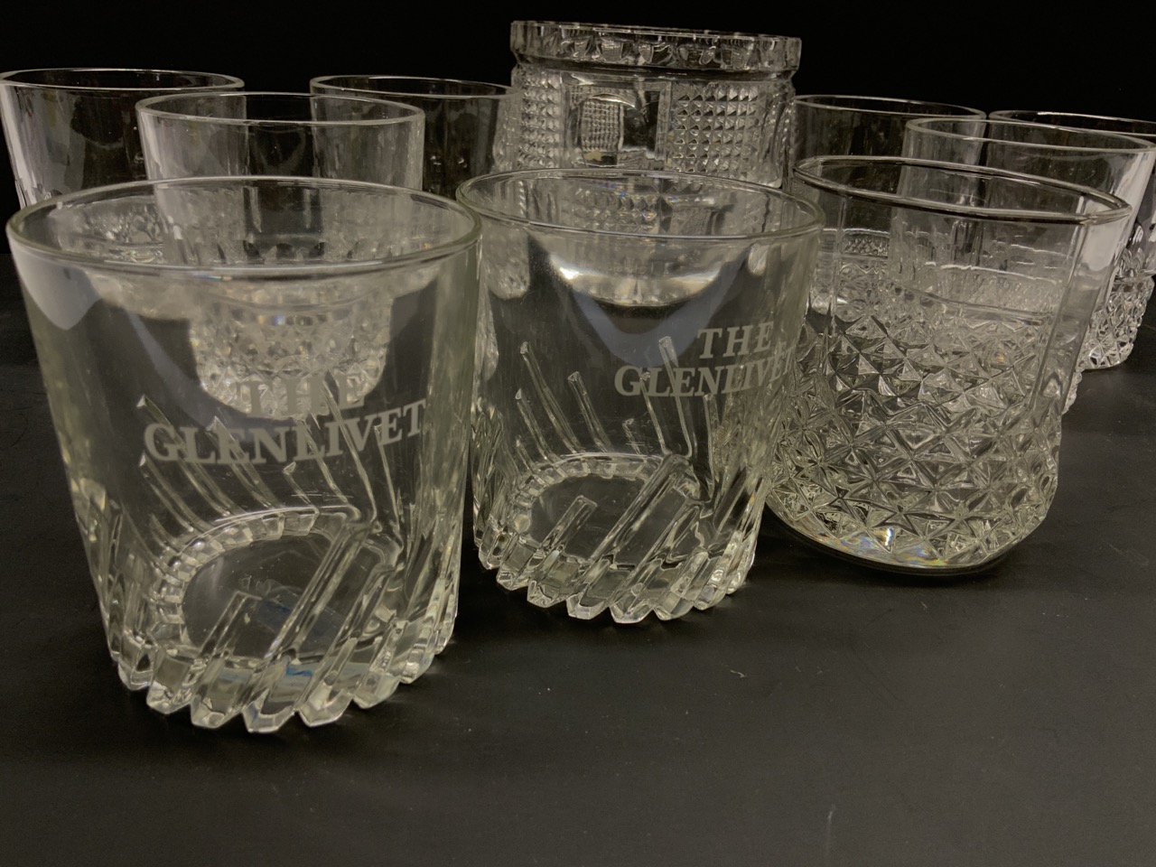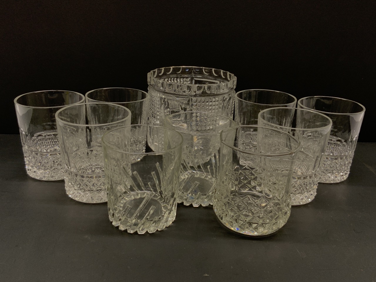 Compiled group of Rock or Whiskey glasses (9) and glass ice bucket.