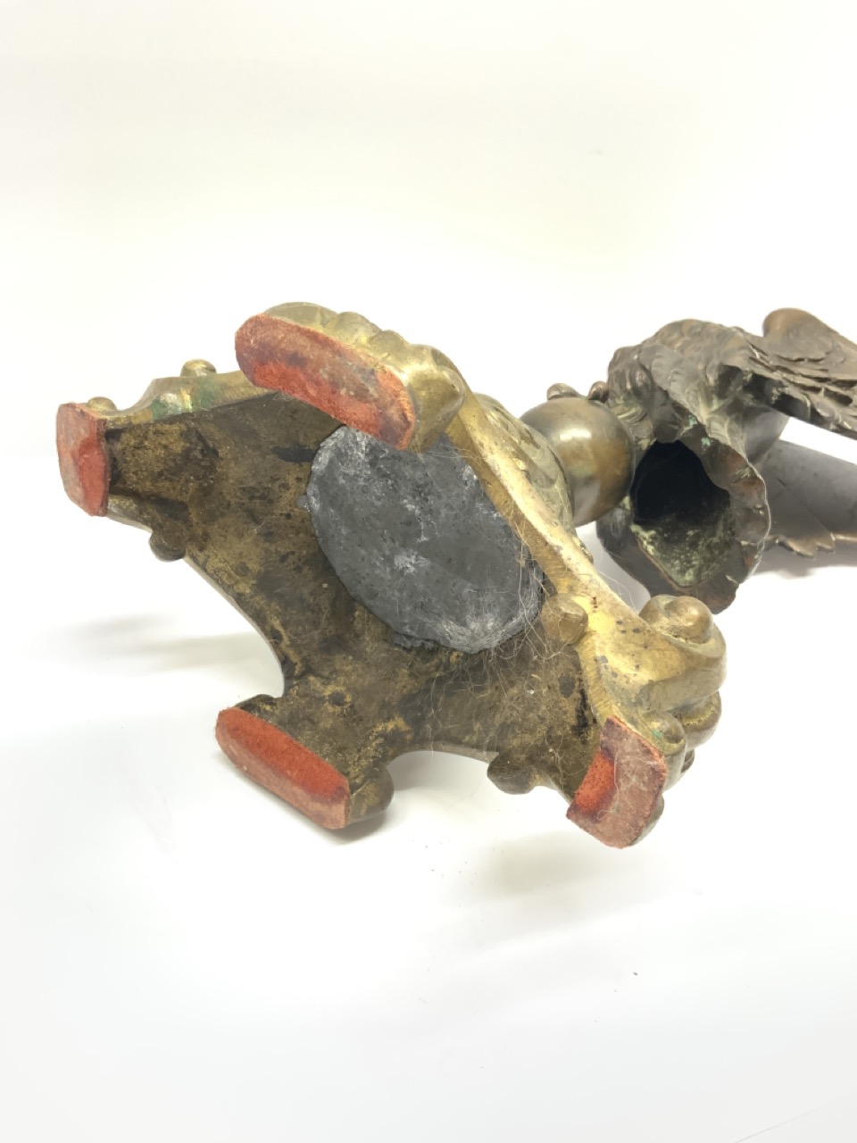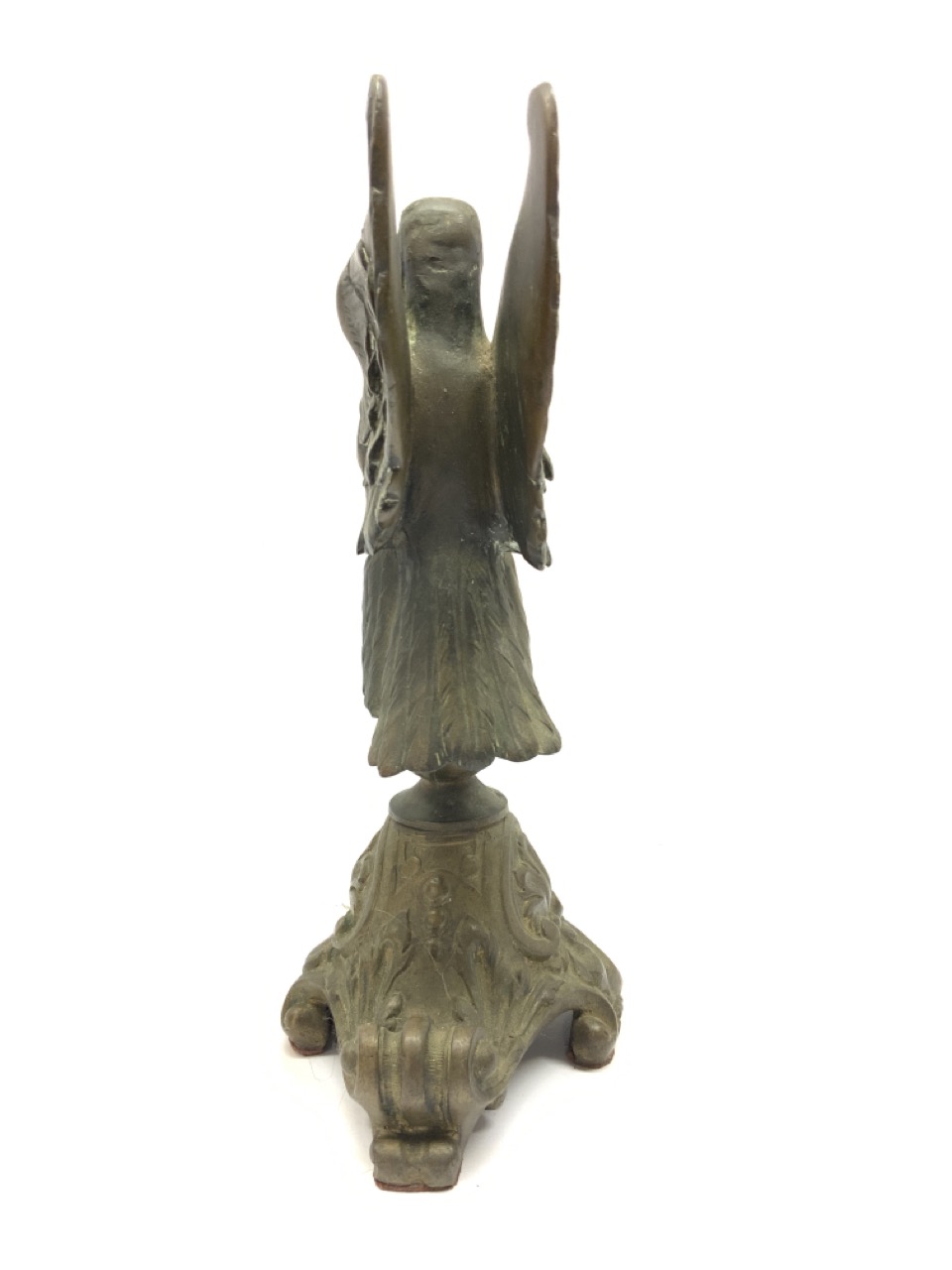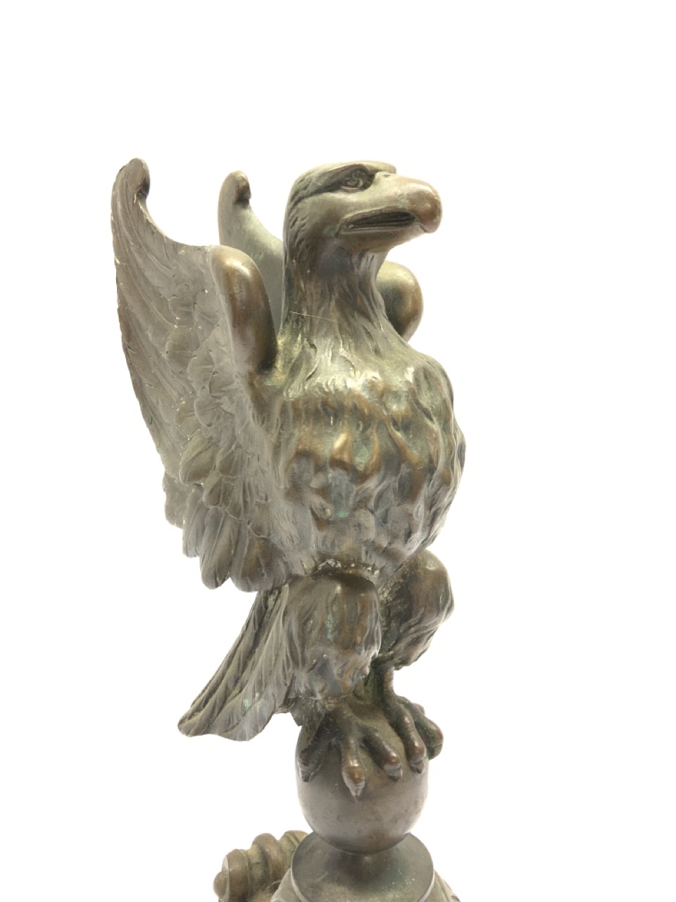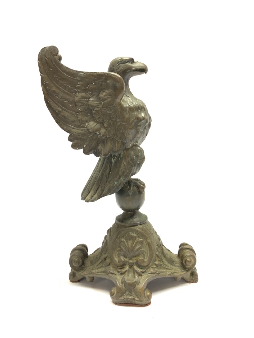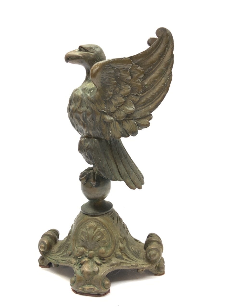 A 19th c. standing eagle bronze sculpture mounted on bronze scroll base. Unsigned.