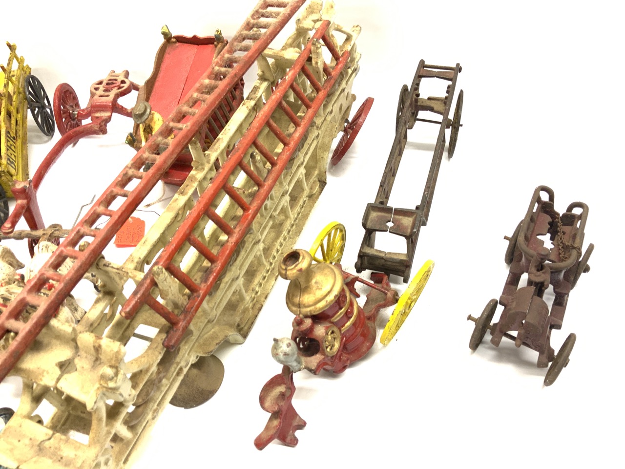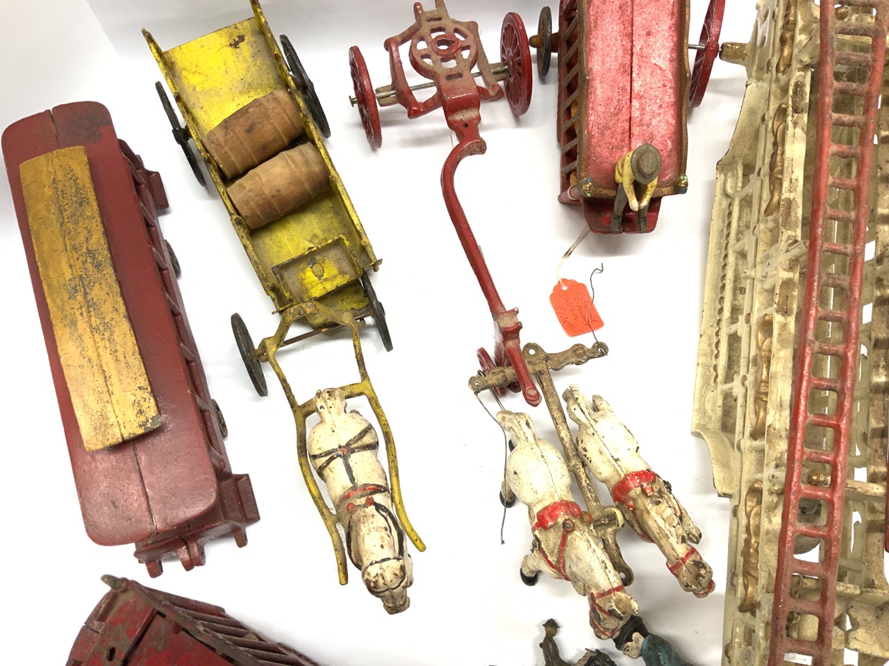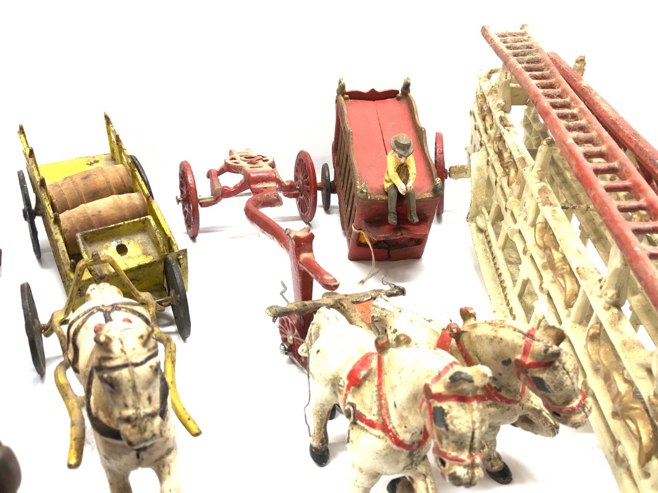 Assorted cast iron toy lot. Circus cars, horse drawn fire etc.