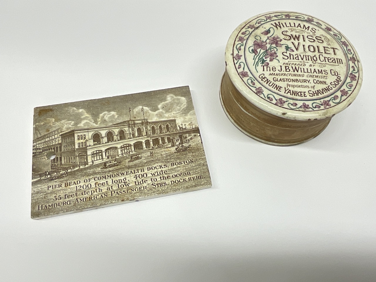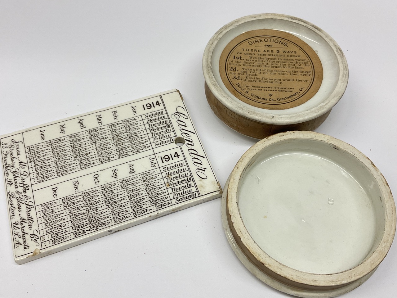 1914 Calendar tile Jones McDuffy & Stratton Company Boston along with Swiss Violets Shaving Cream Jar, Glastonbury, CT.