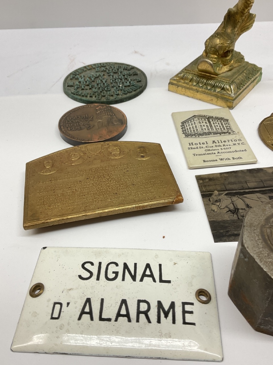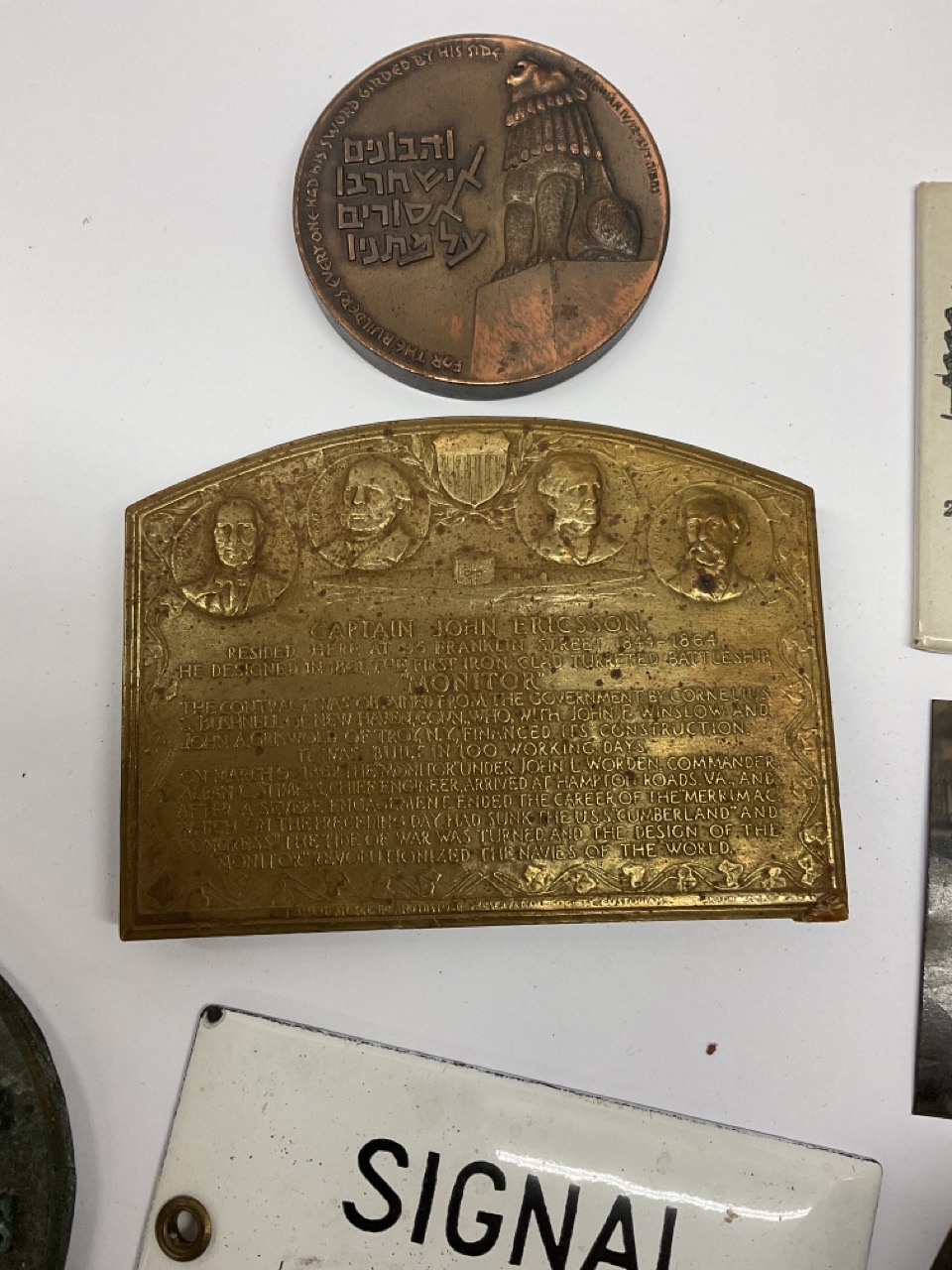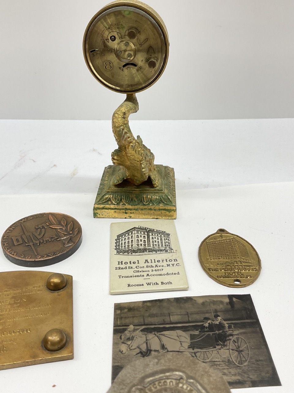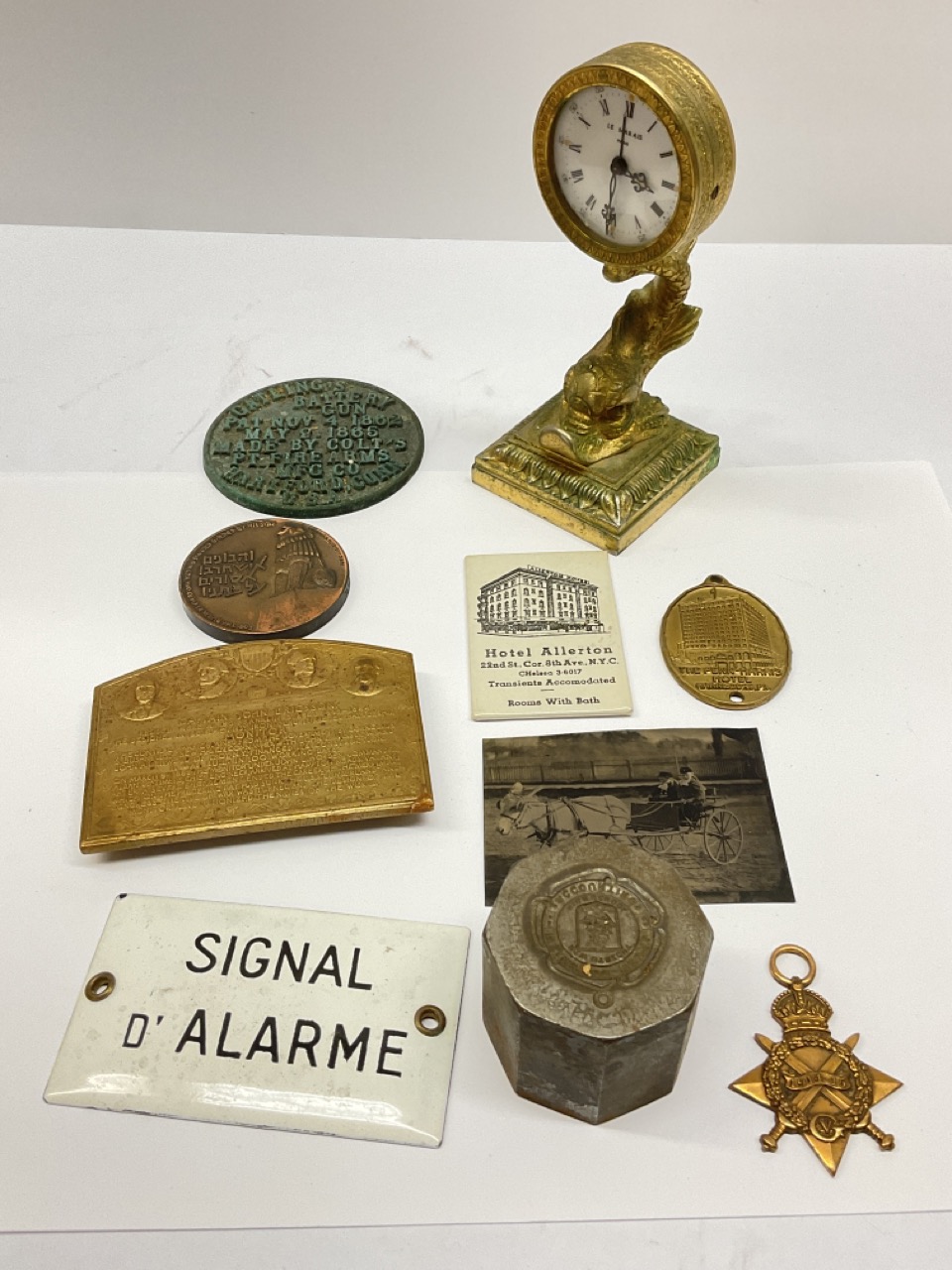 Assorted estate metal ware objects. Hotel Allerton advertising mirror, Captain John Ericsson bronze medallion/monitor, Le Marais Paris clock (As is), Colt's Gatlings Battery Gun cap etc. Please see photograph preview.